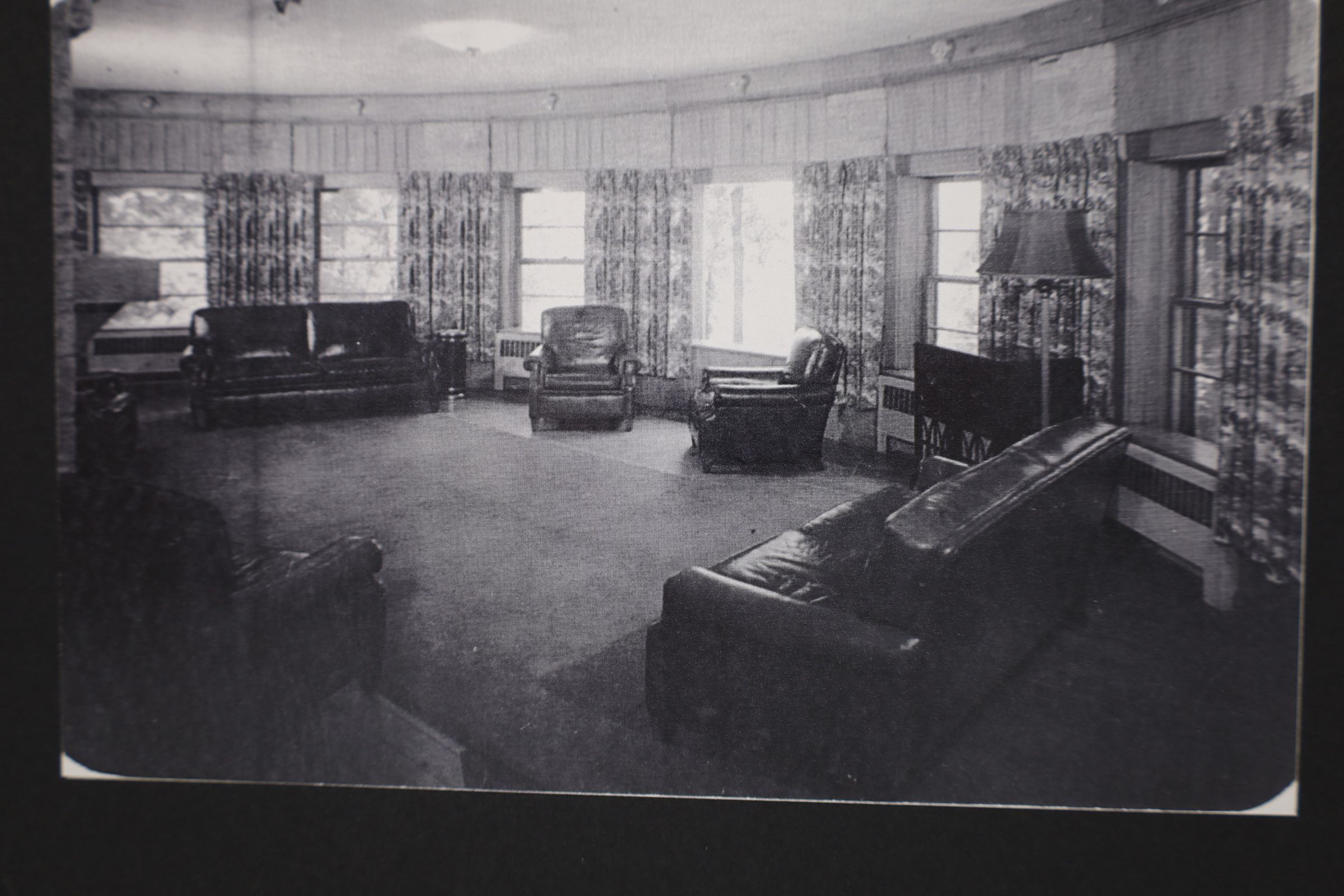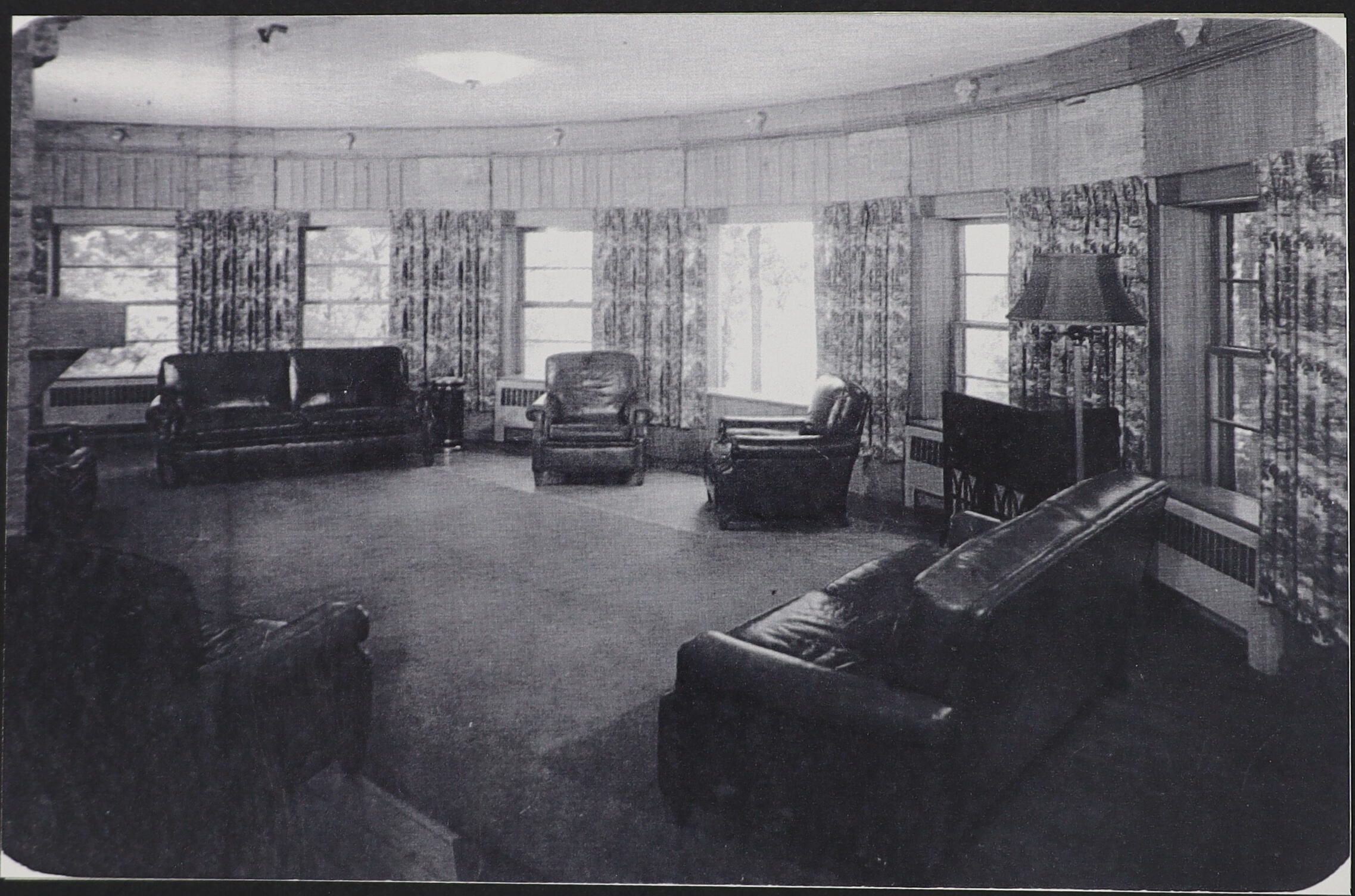 Lake Hope Dining Lodge Lounge photograph, black and white. This photograph shows a circular, wood-paneled room with leather upholstered furniture, ashtrays, floor lamp, cabinet radio. These furnishings typify mid-twentieth-century décor. People staying at the lodge would have gathered here for conversation and to listen to radio programs. It was socially acceptable to smoke indoors in communal spaces at the time. This lodge was destroyed during a fire in 2006.Location