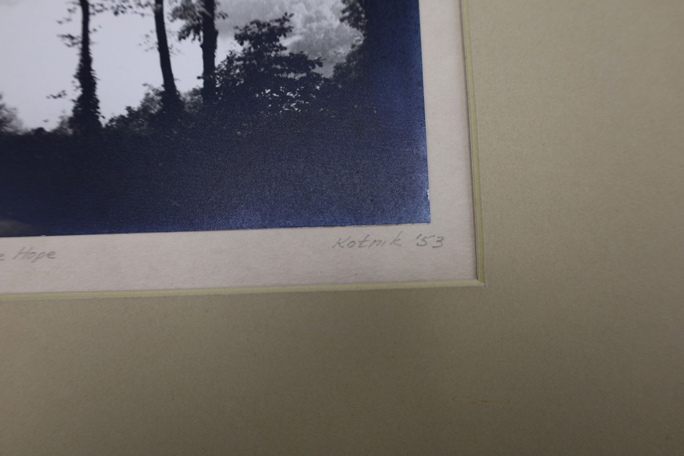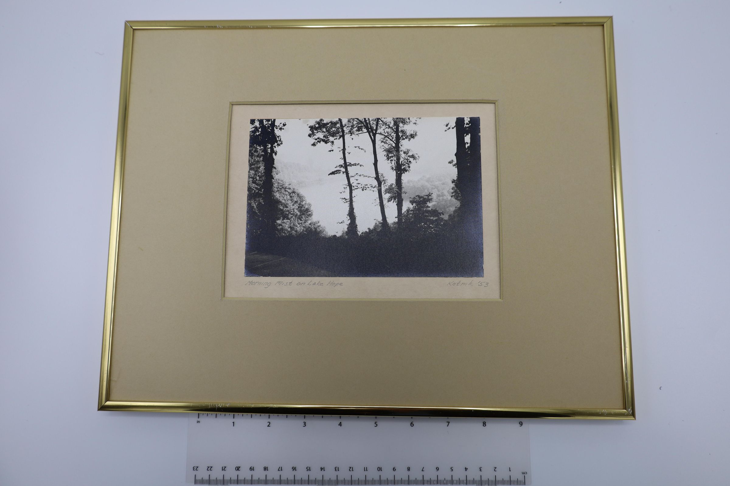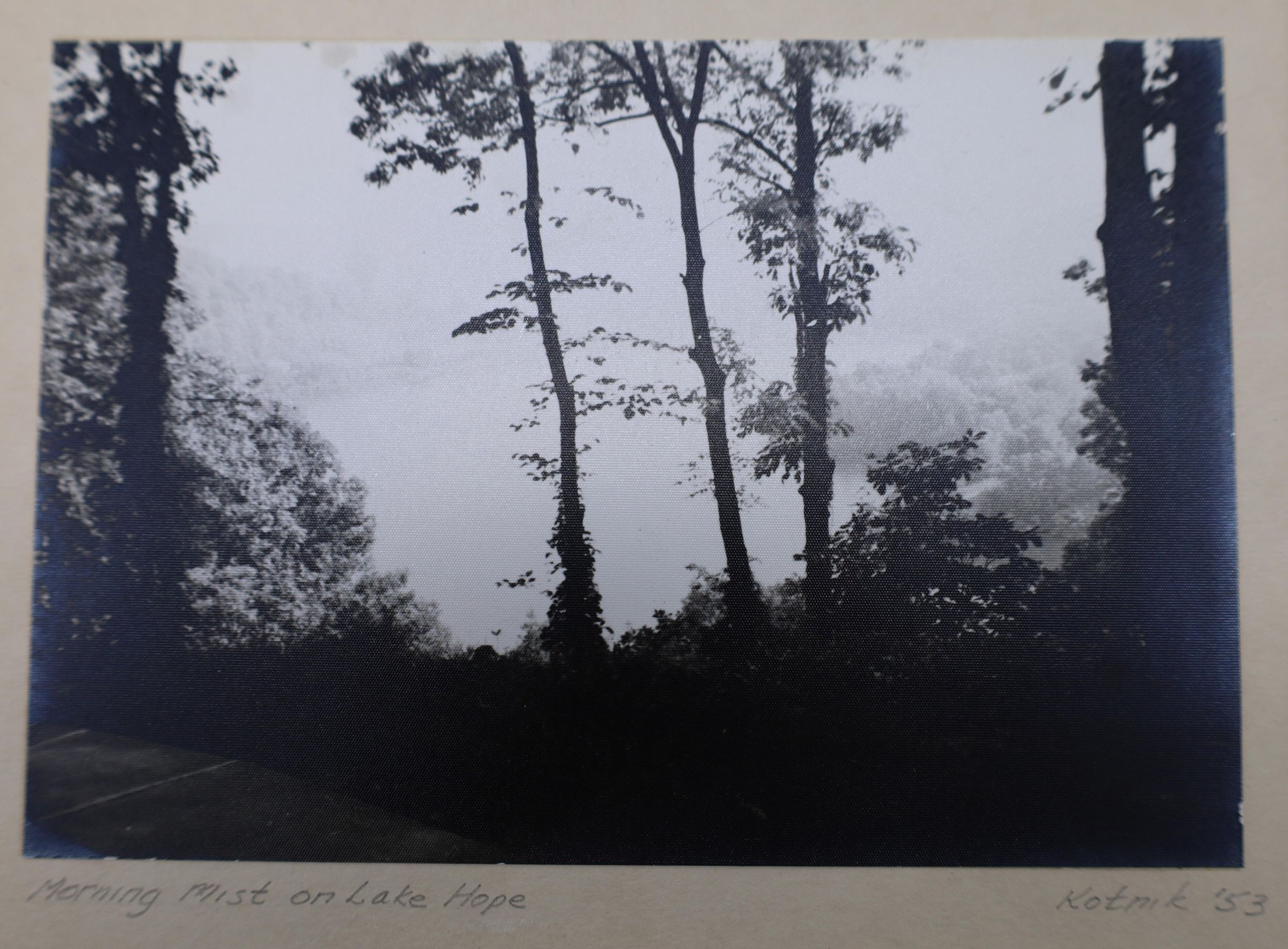 The photograph was taken in 1953. "Morning Mist on Lake Hope" is written on the bottom left corner, and on the bottom right corner, "Kotnik '53" is written in pencil. This black and white photograph features a landscape scene that shows mist rolling over Lake Hope in Vinton County, Ohio.Location