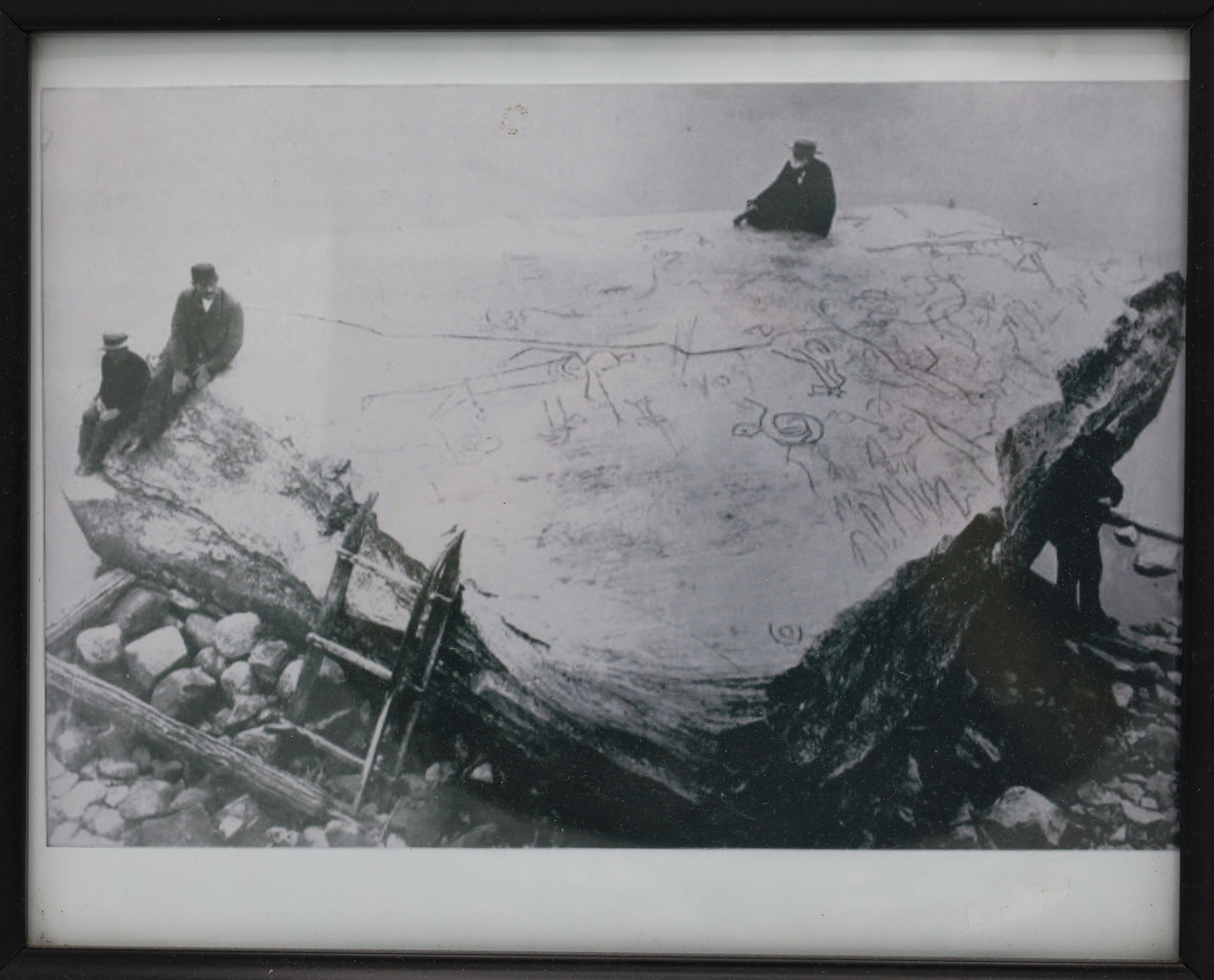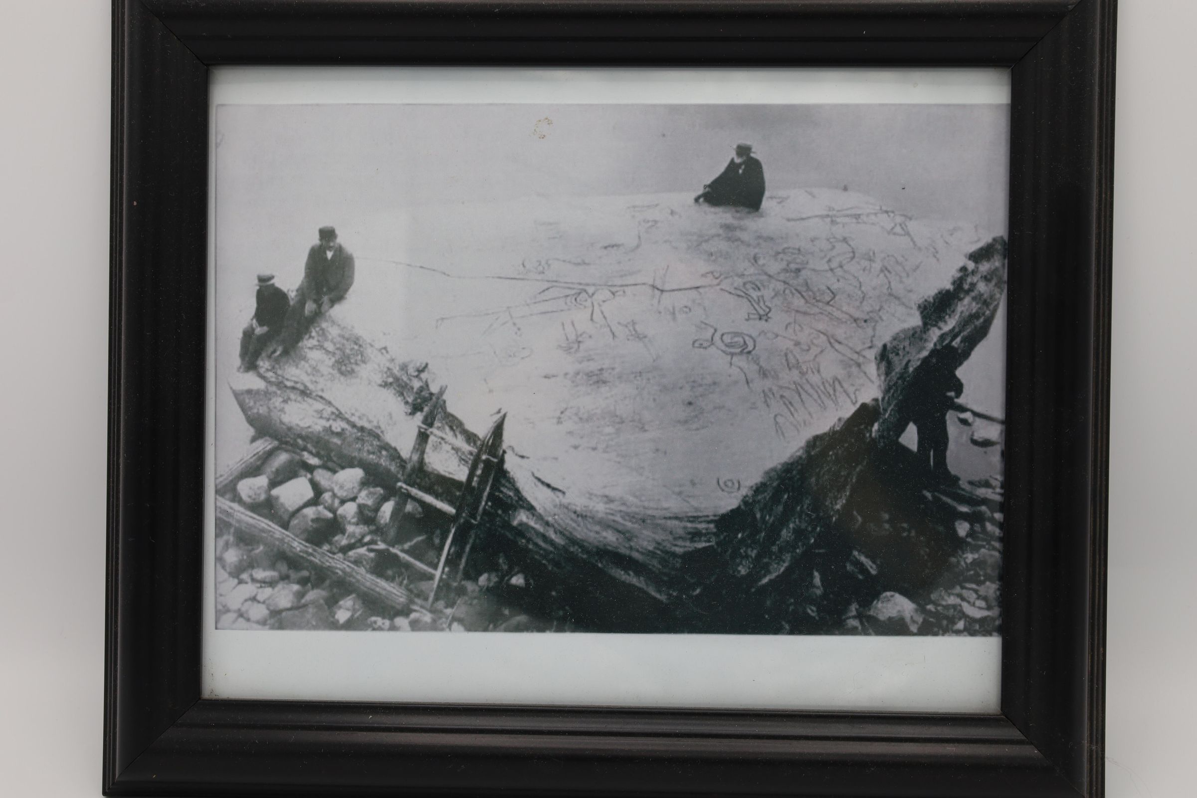 This photograph of Inscription Rock hangs on a wall in the office at Kelleys Island State Park. Inscription Rock is a large limestone boulder that sits on the southern shore of Kelleys Island and has over 100 pictographs on the surface.