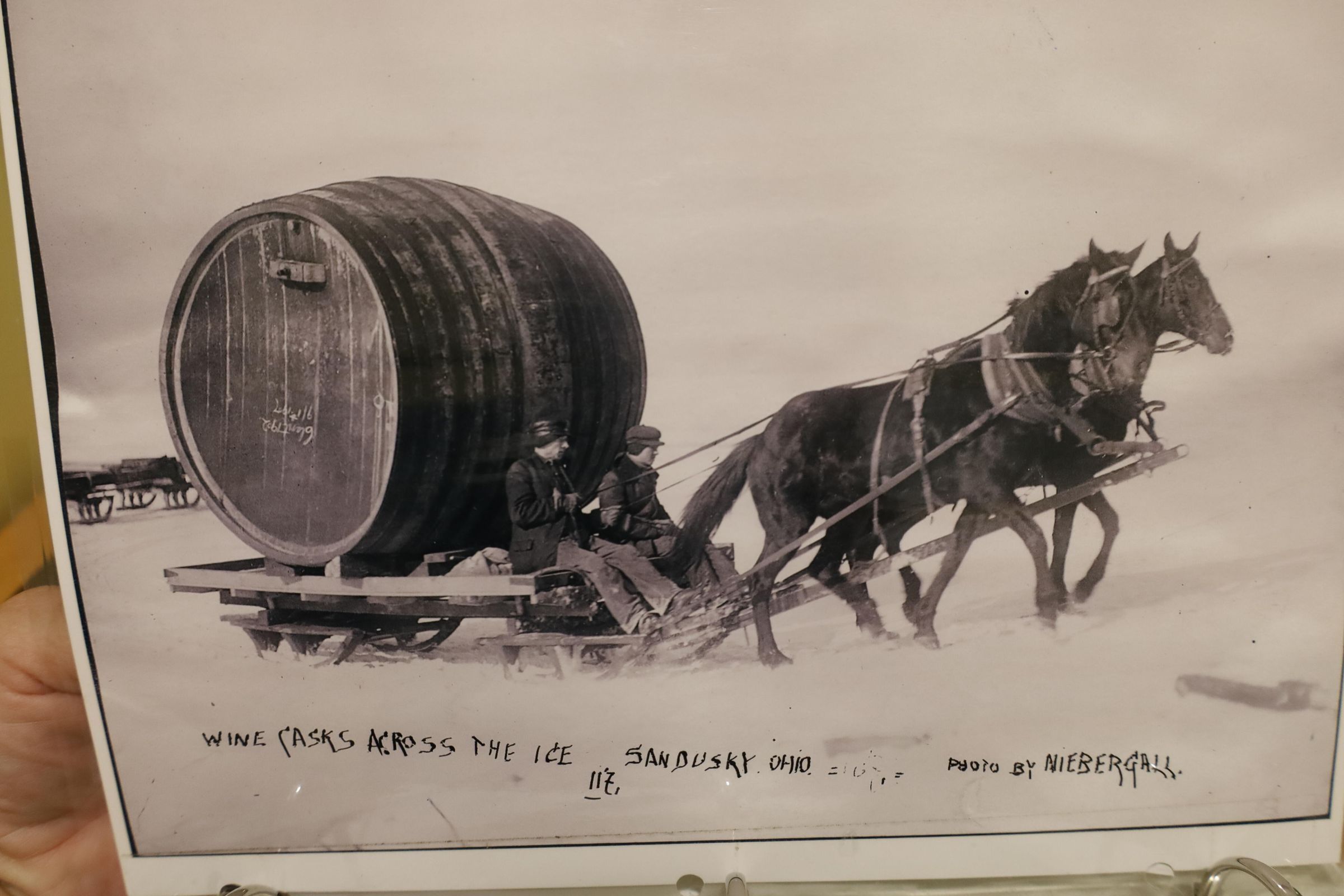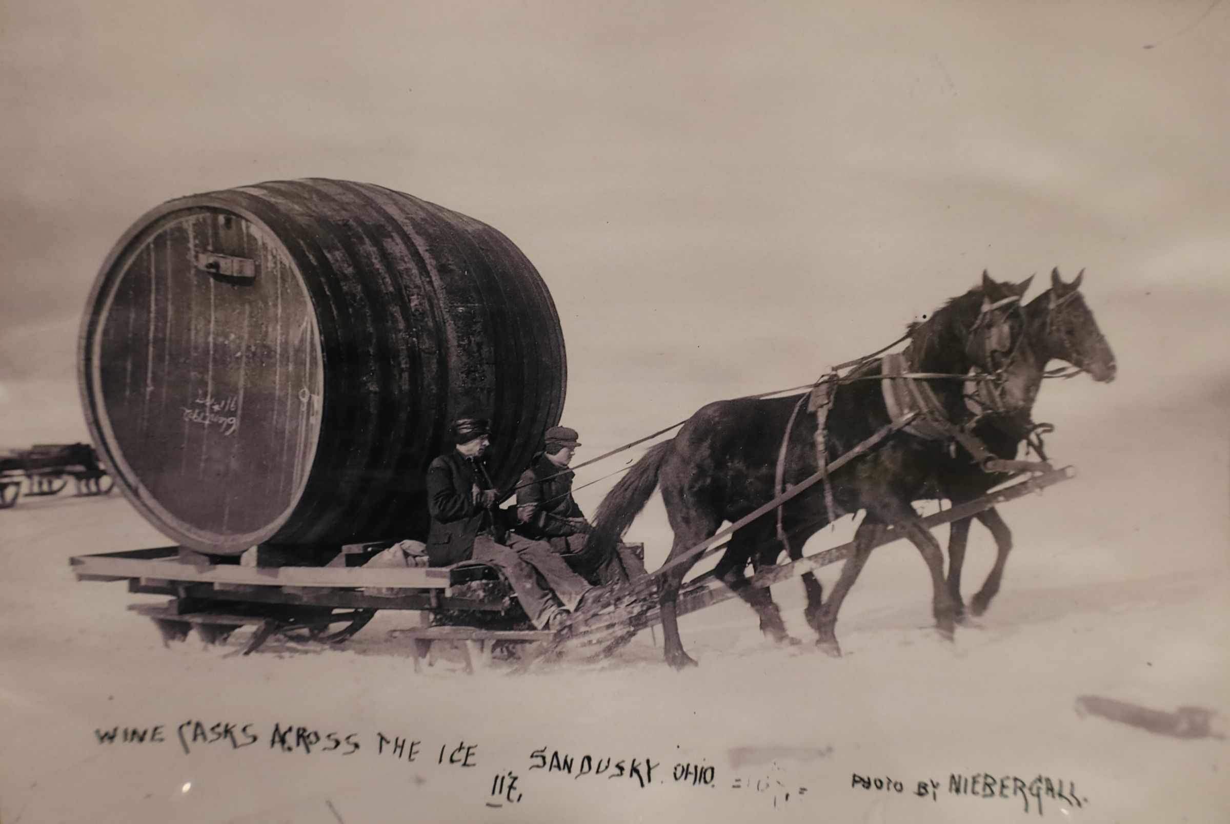 This photograph of wine casks being transported over the ice by horse and sleigh was taken in 1913 by Ernst Niebergall and hangs on the wall in Kelleys Island State Park's main office.Use
