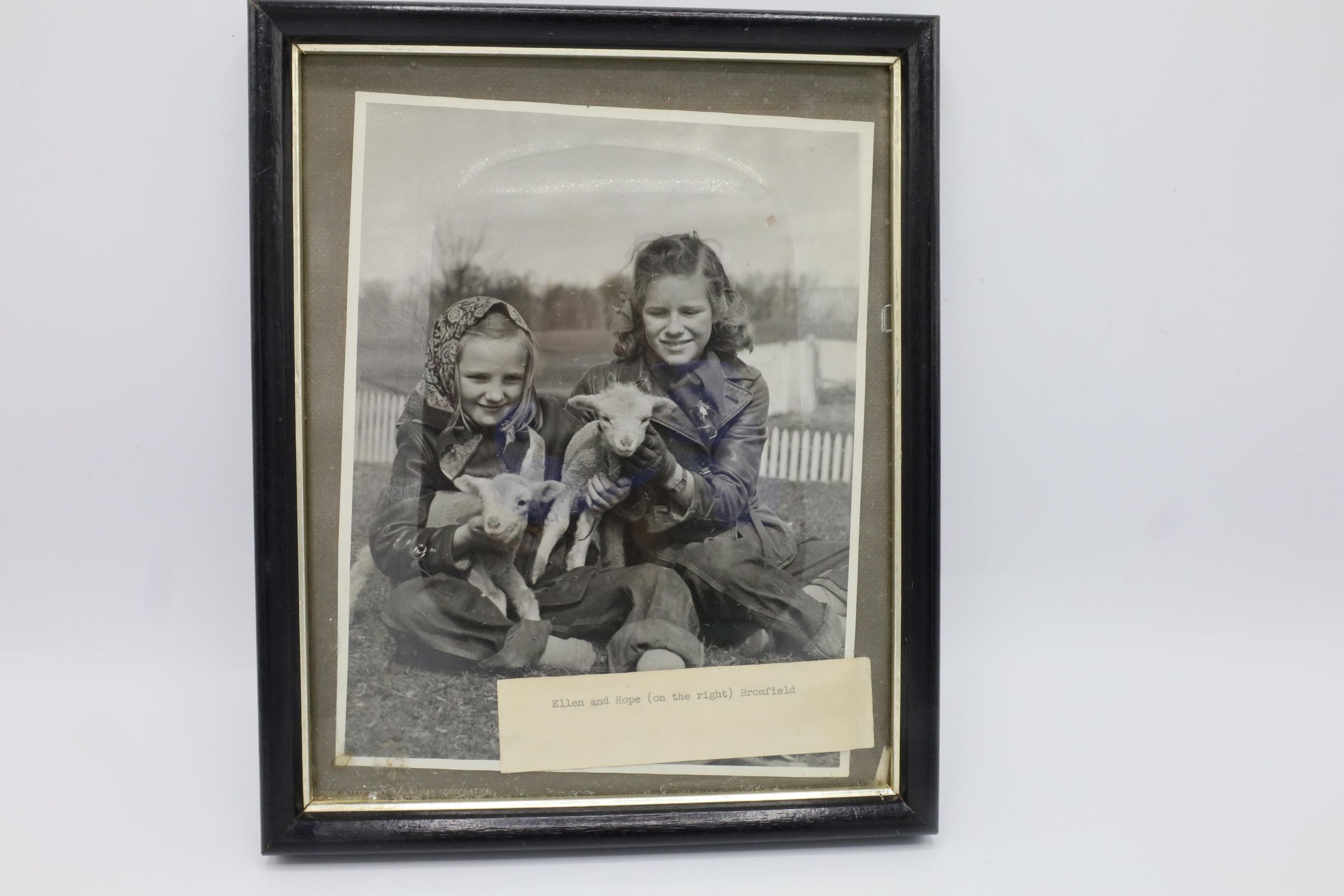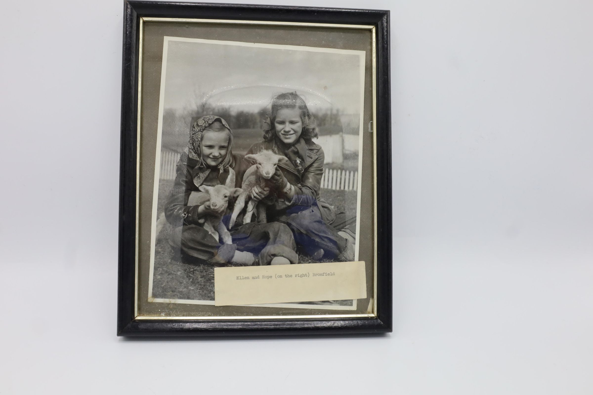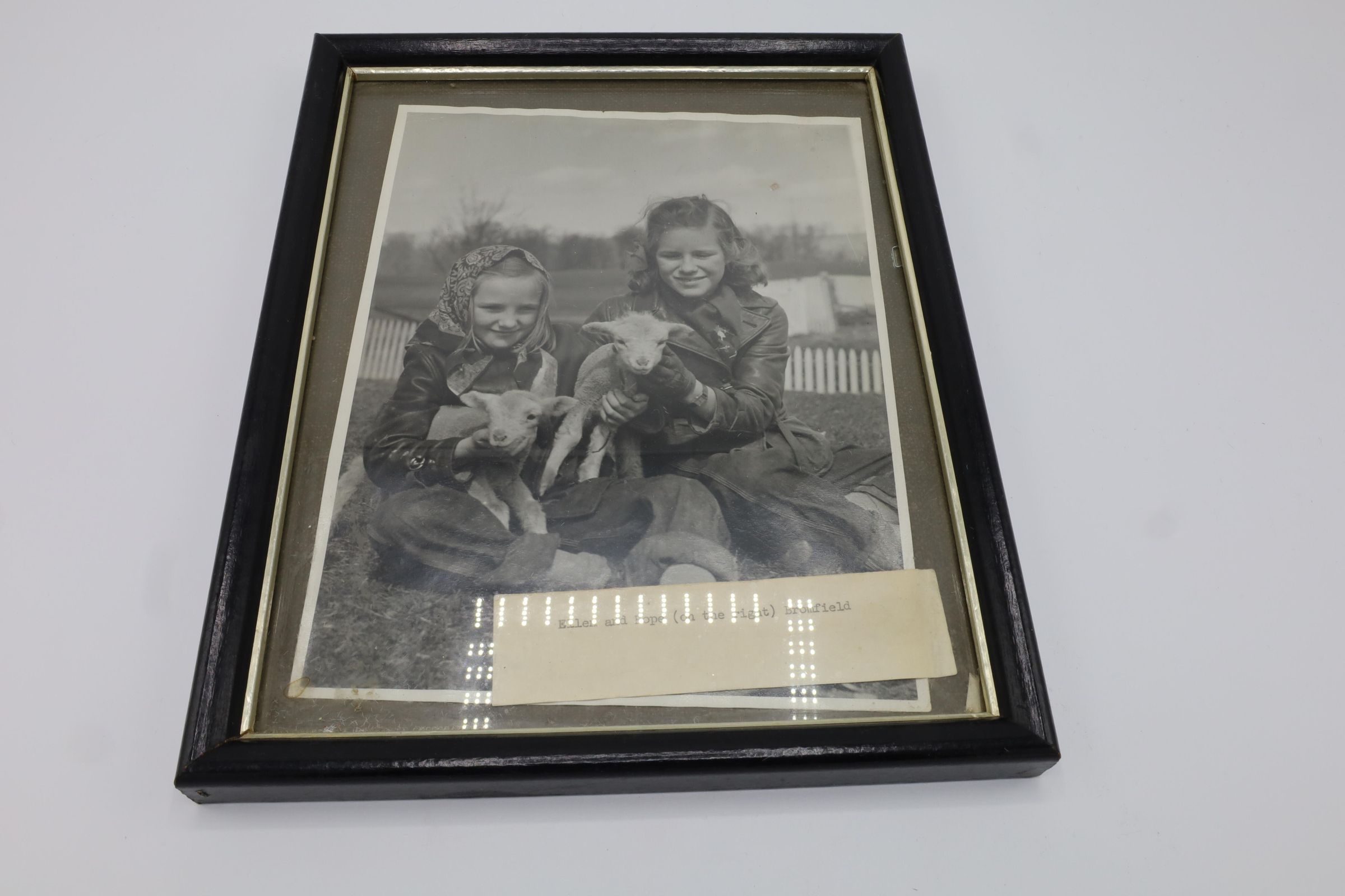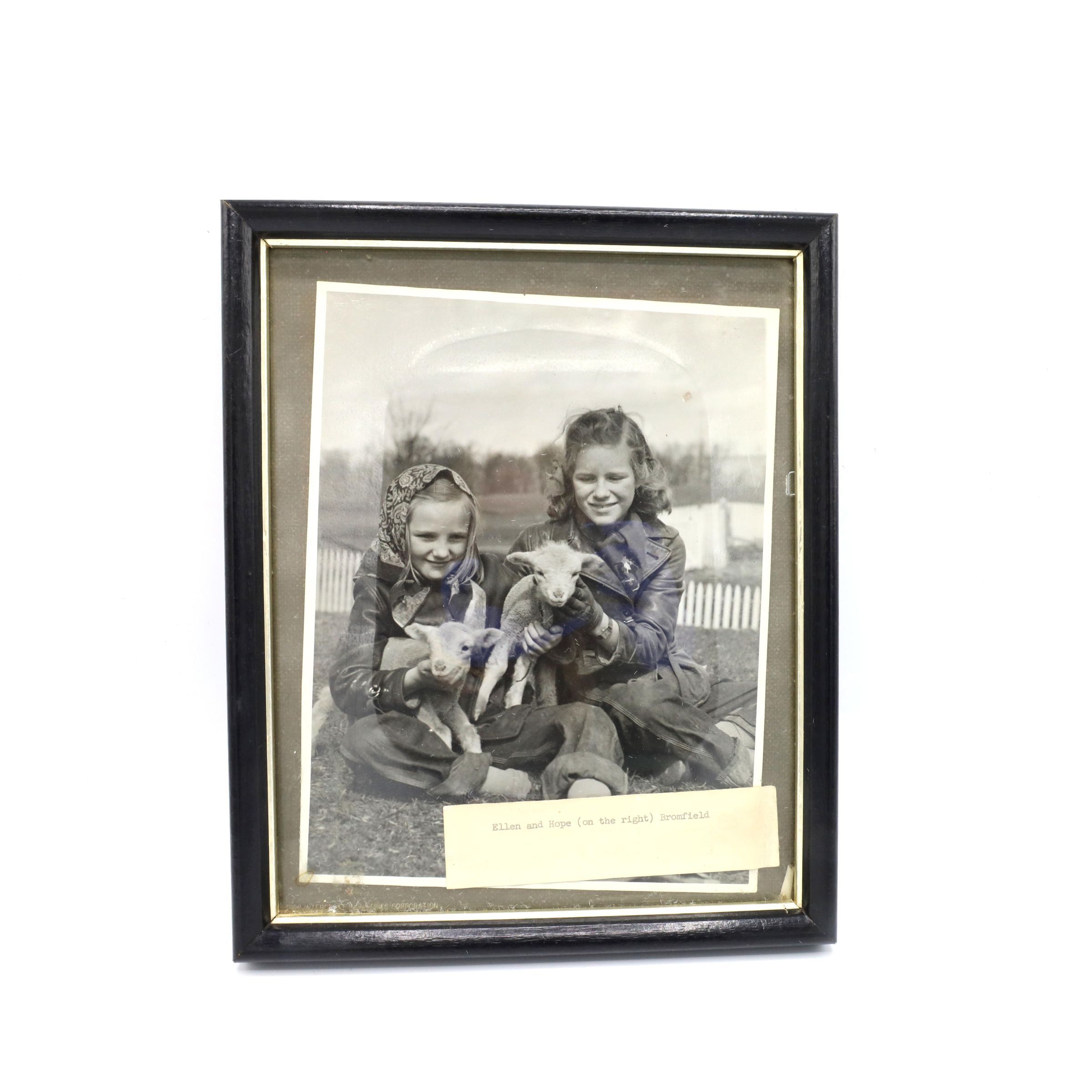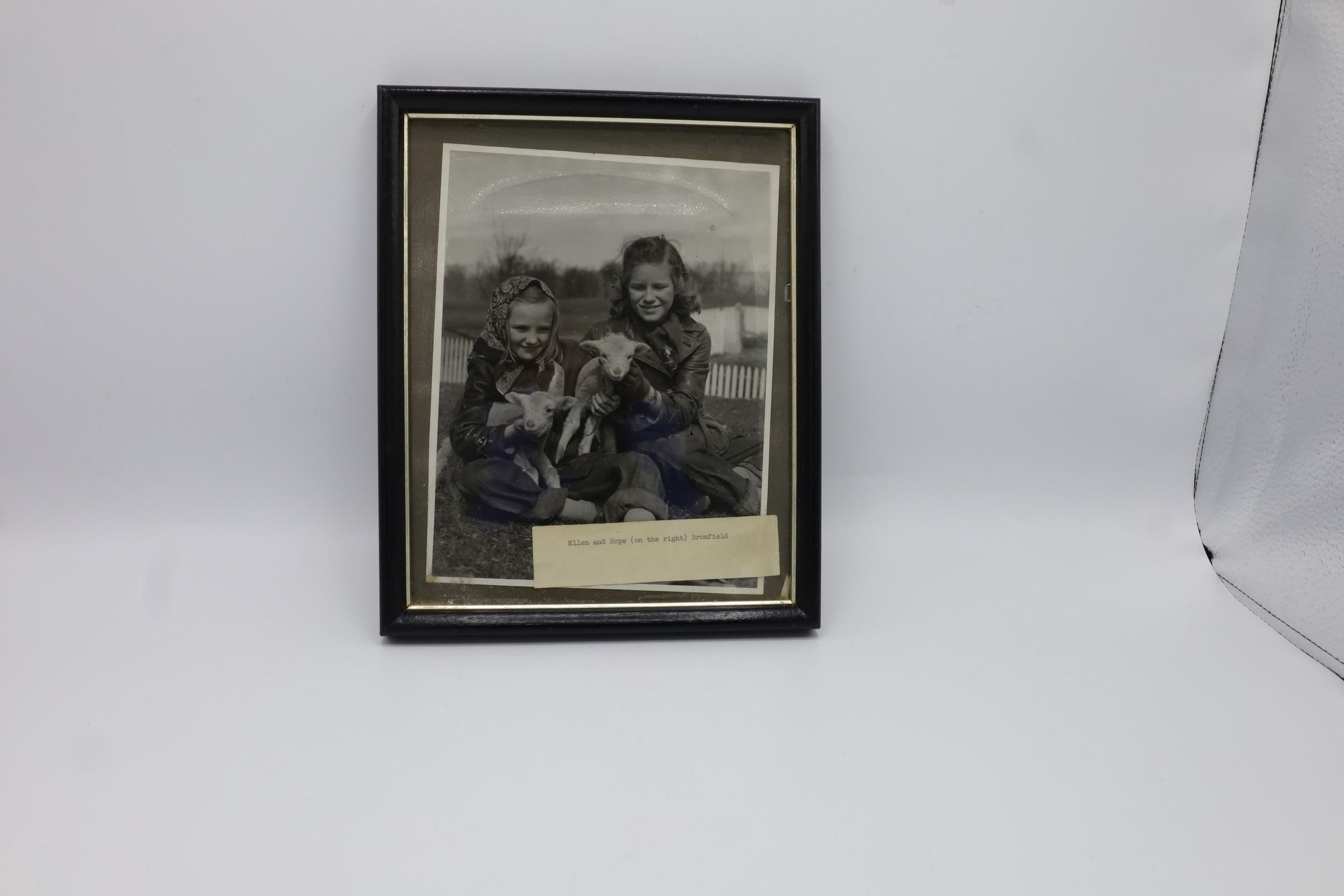 Ellen and Hope Bromfield are holding lambs in this black and white photograph. The image is not matted, but is held in a frame. Both girls are wearing jeans rolled up at the ankle, and Ellen's hair is covered by a handkerchief.