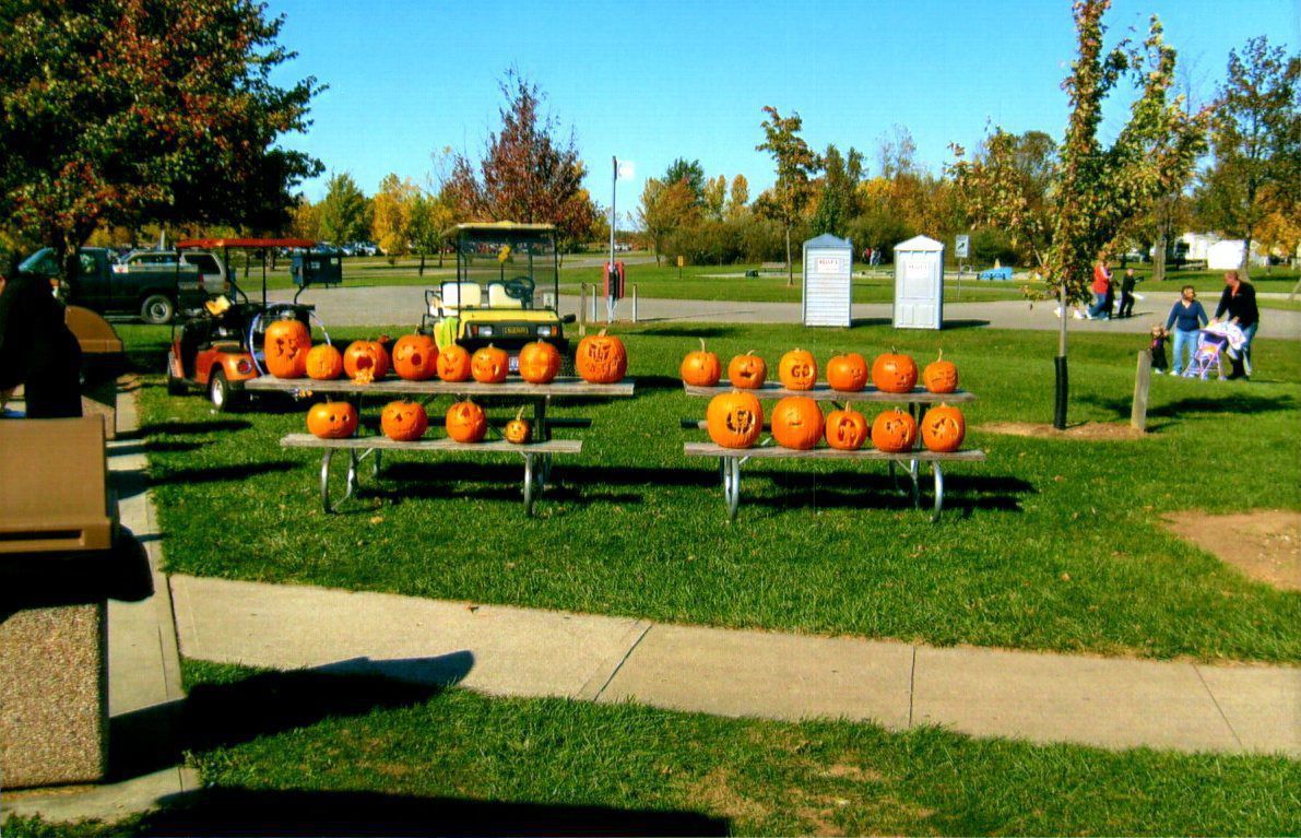 An assortment of Jack-o-Lanterns populate two picnic tables at Indian Lake State Park.