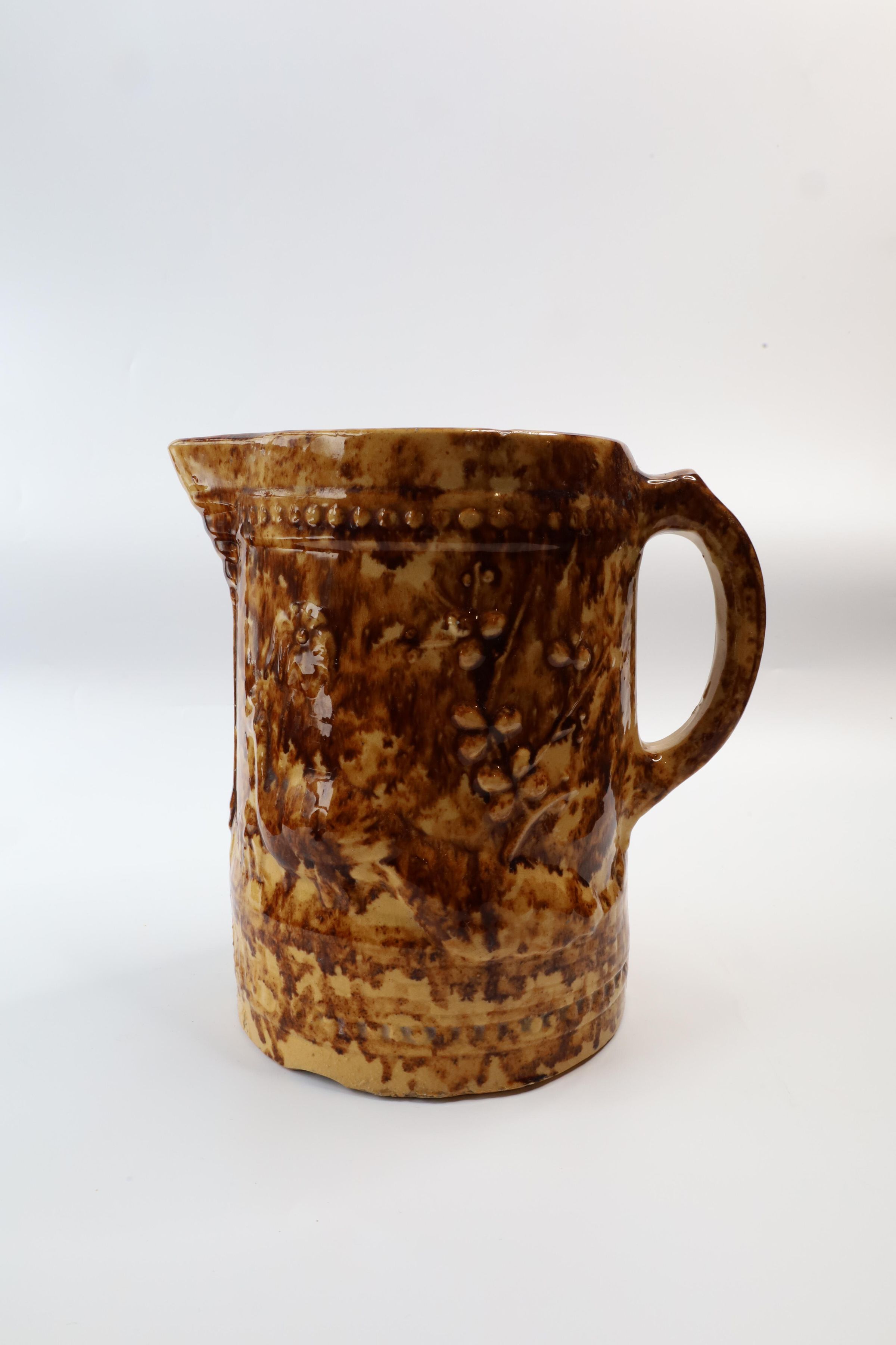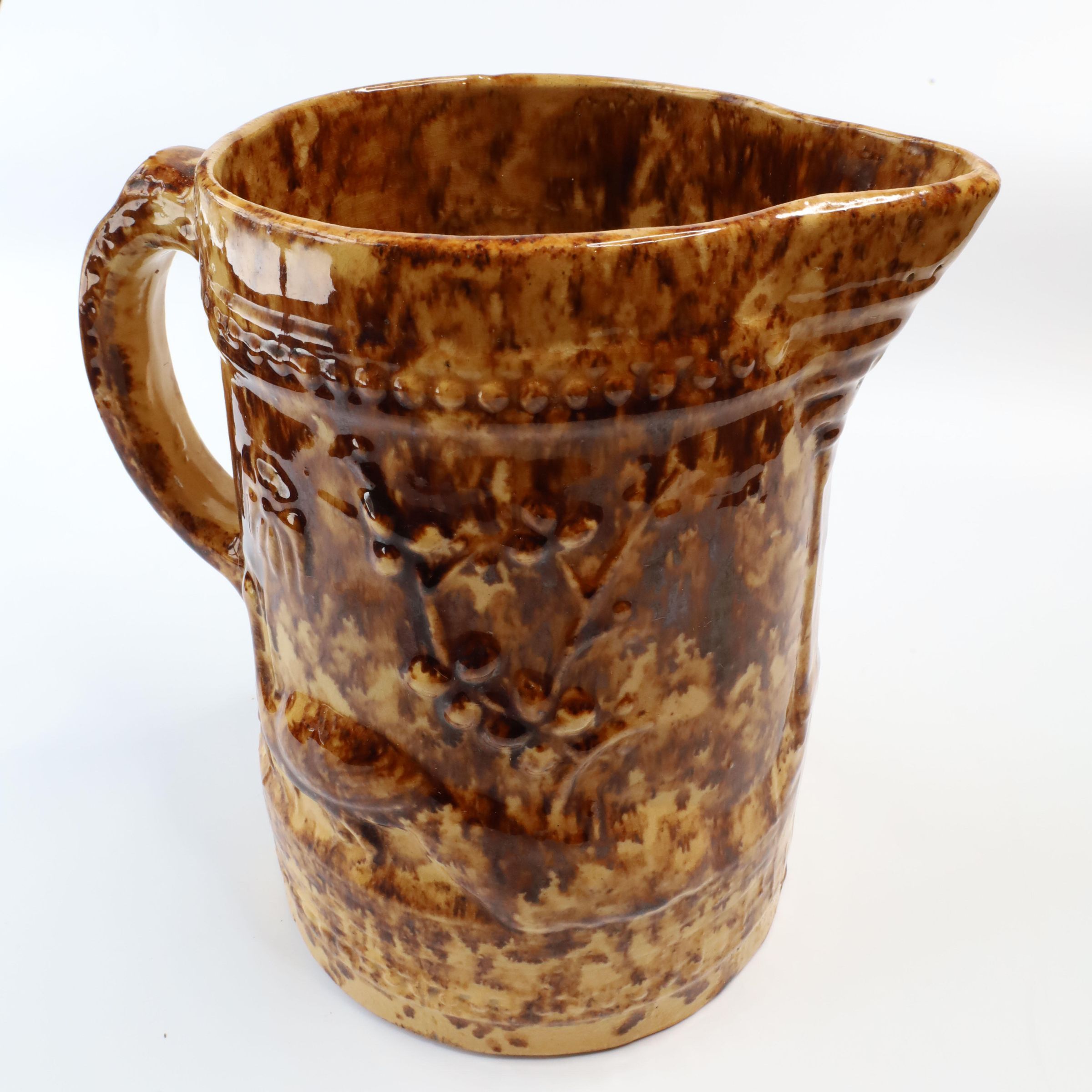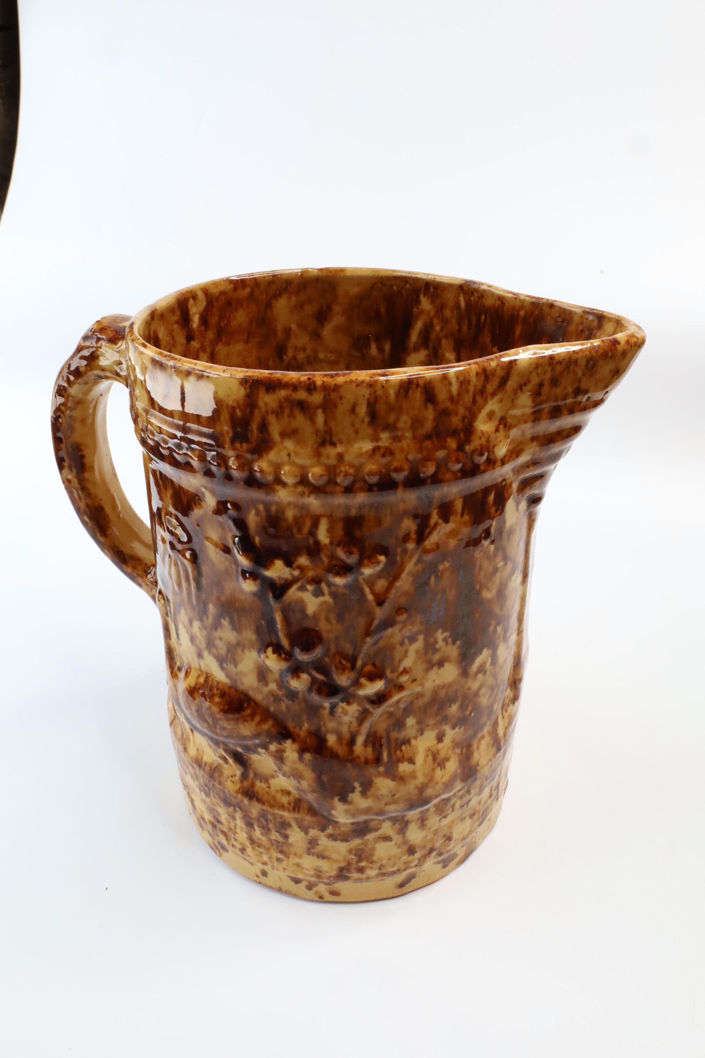 This Rockingham glazed pitcher has a peacock image and decorative border design. According to the Museum of Ceramics, only a few potteries in the mid-19th century marked their ware with a mark that could be attributed to specific pottery. Rockingham and yellowware products were often left unmarked, only attributable to a specific pottery if an oral tradition is attached to the mark and item. Although this item is unmarked, a sticker on the bottom claims it is from the C.C. Thompson Pottery.Context