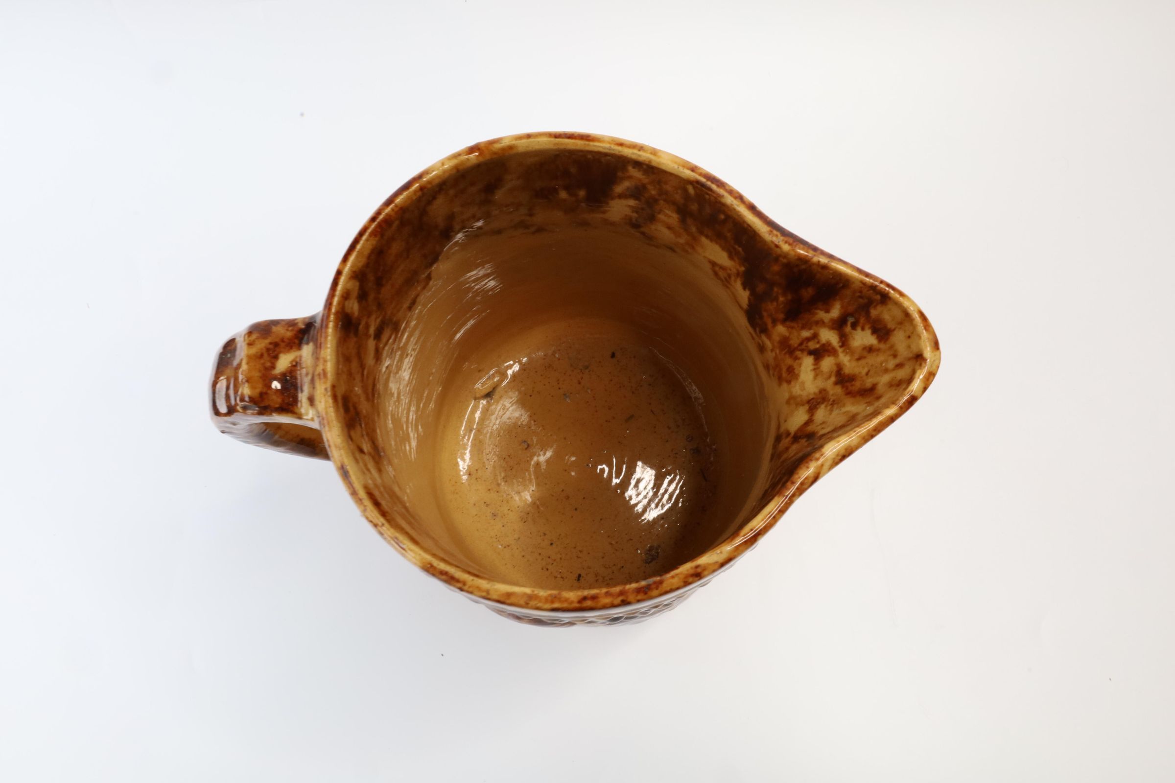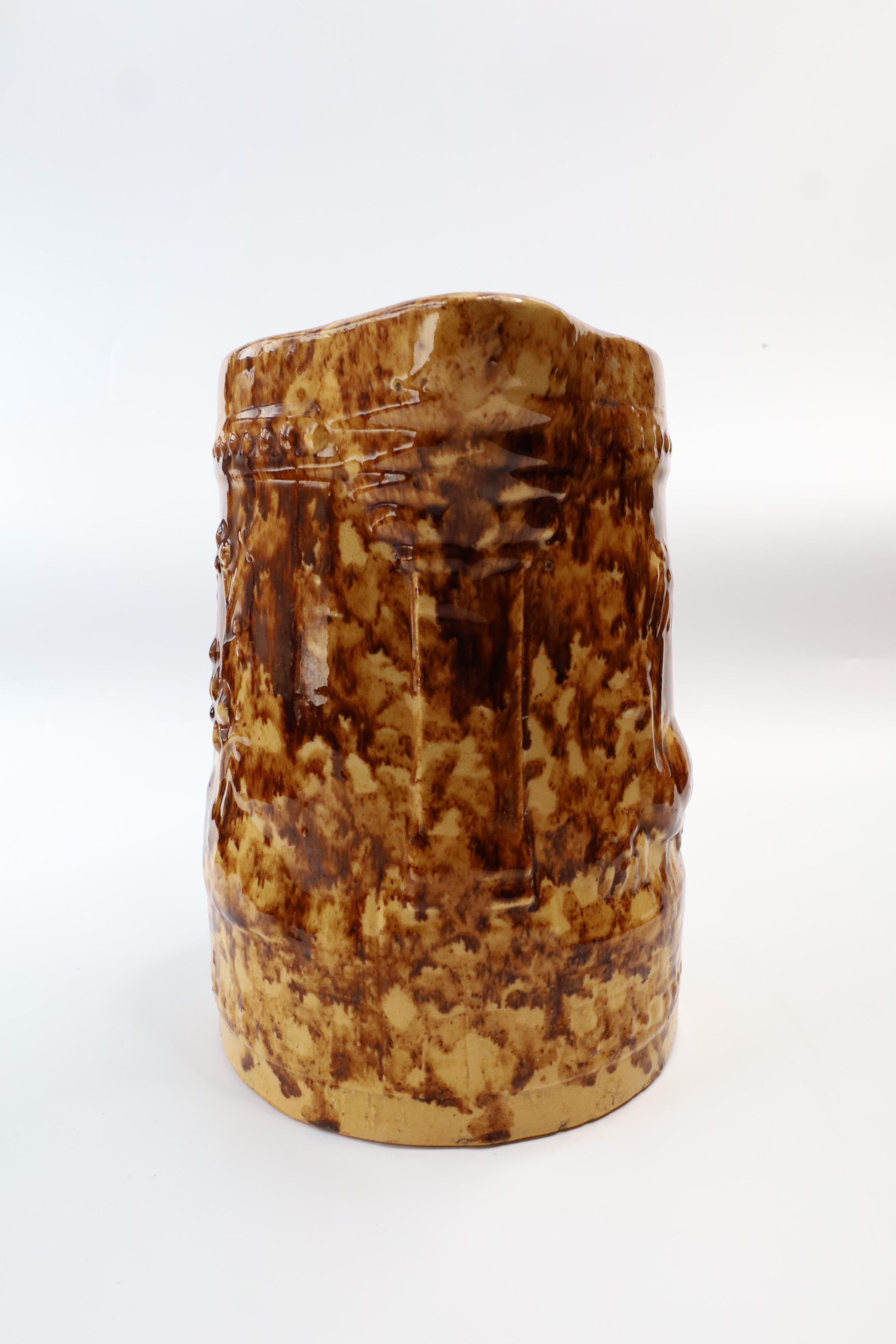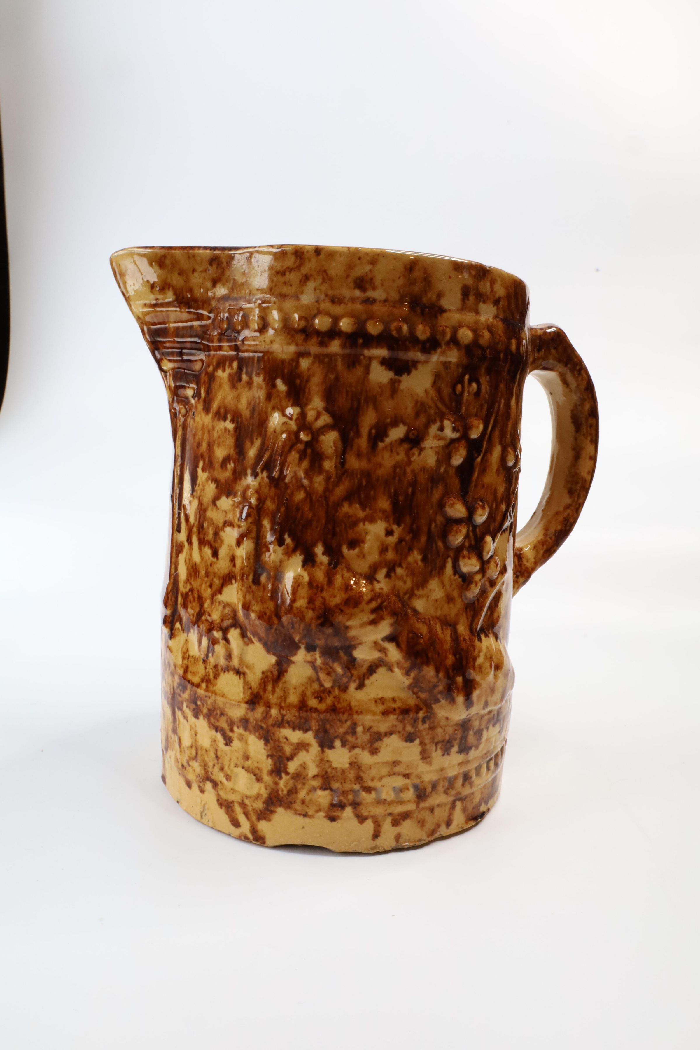 This Rockingham glazed pitcher has a peacock image and decorative border design. According to the Museum of Ceramics, only a few potteries in the mid-19th century marked their ware with a mark that could be attributed to specific pottery. Rockingham and yellowware products were often left unmarked, only attributable to a specific pottery if an oral tradition is attached to the mark and item. Although this item is unmarked, a sticker on the bottom claims it is from the C.C. Thompson Pottery.Context
