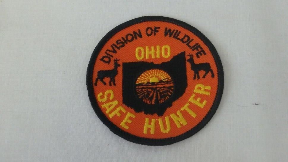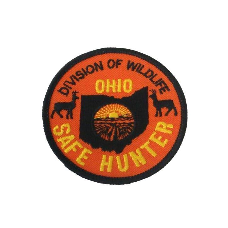 Orange material with embroidered yellow, and black lettering and border, deer and state of Ohio logo.