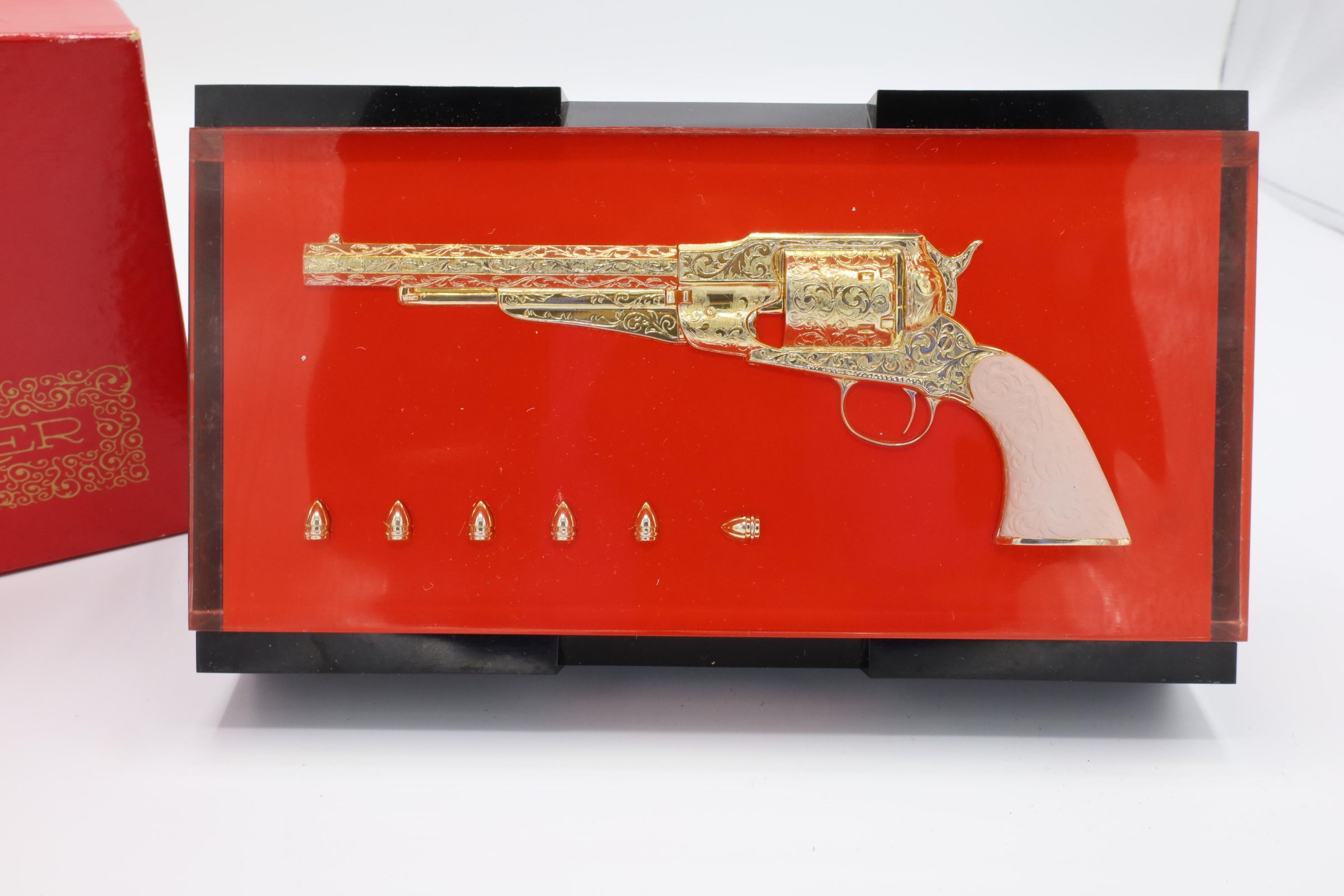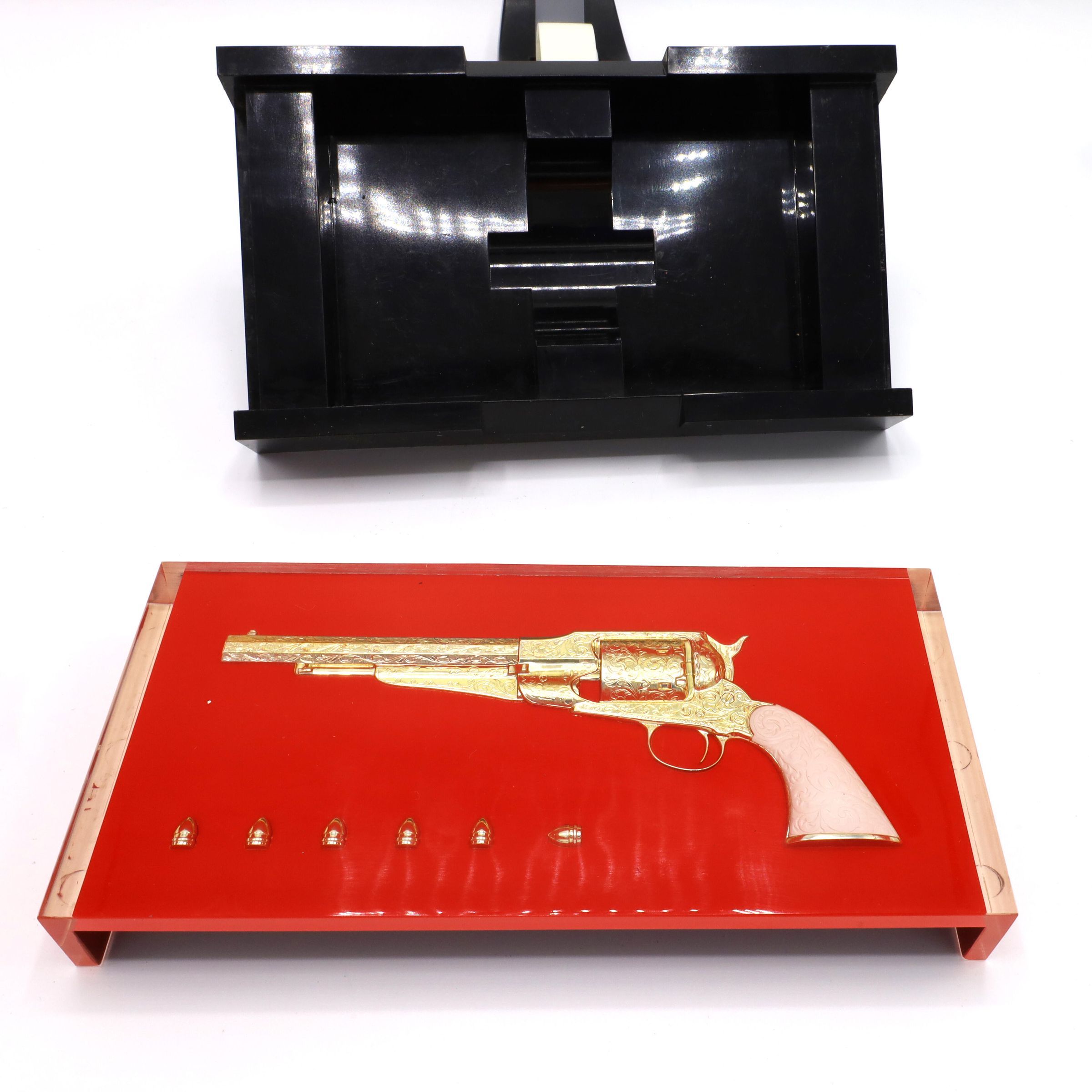 This plastic black and red playing card case holder with red cardboard storage box features a golden revolver with six bullets on the cover.