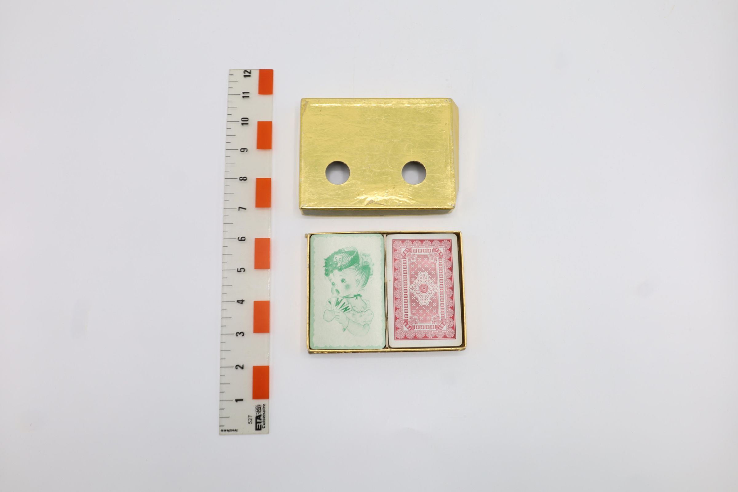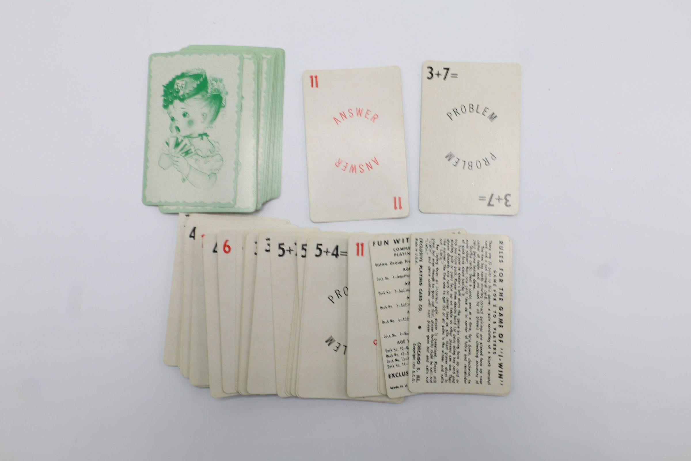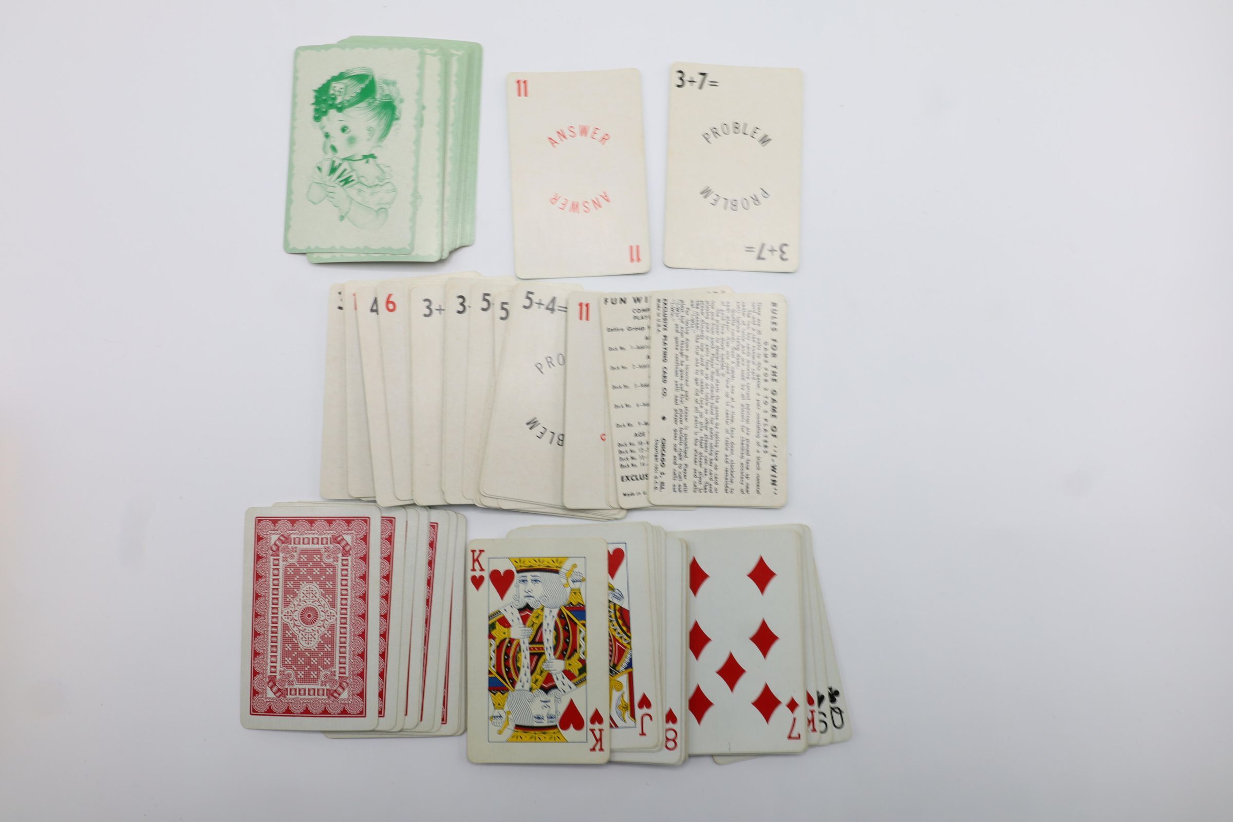 A gold cardboard box holds two sets of playing cards. One set is Fun with Numbers flash cards from 1951. They were made by the Exclusive Playing Card Co. in Chicago, Illinois. The back of that set shows a drawing of a child printed in green. The other set features the more traditional red design on the back. It is a standard 52-card deck.