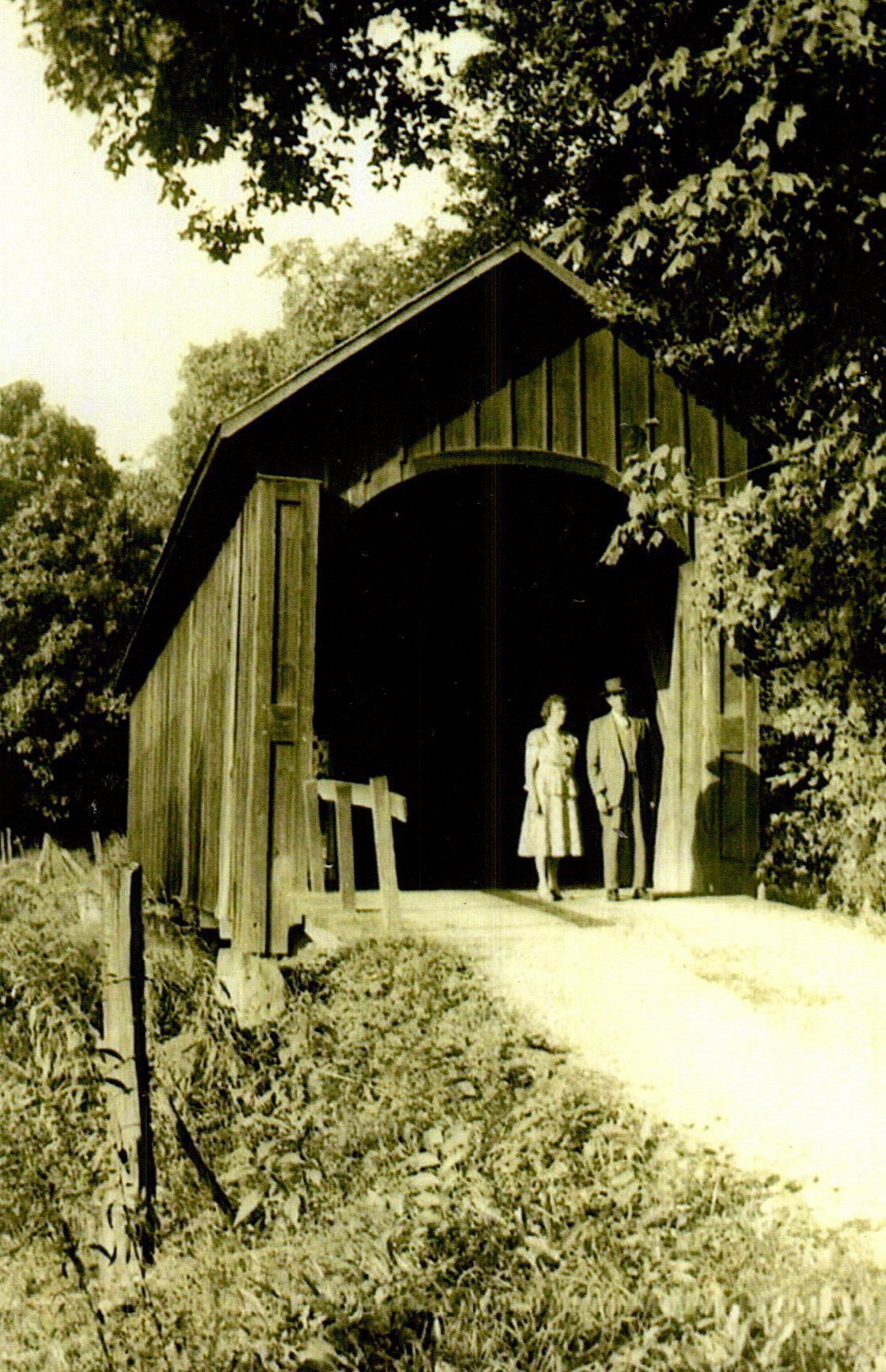 A couple poses for a picture in front of the Armstrong Covered Bridge. Abraham Armstrong built the bridge in 1849. The bridge was moved to Cambridge City Park during the construction of Salt Fork Lake. It remains there today, making it one of Ohio's oldest extant covered bridges.
