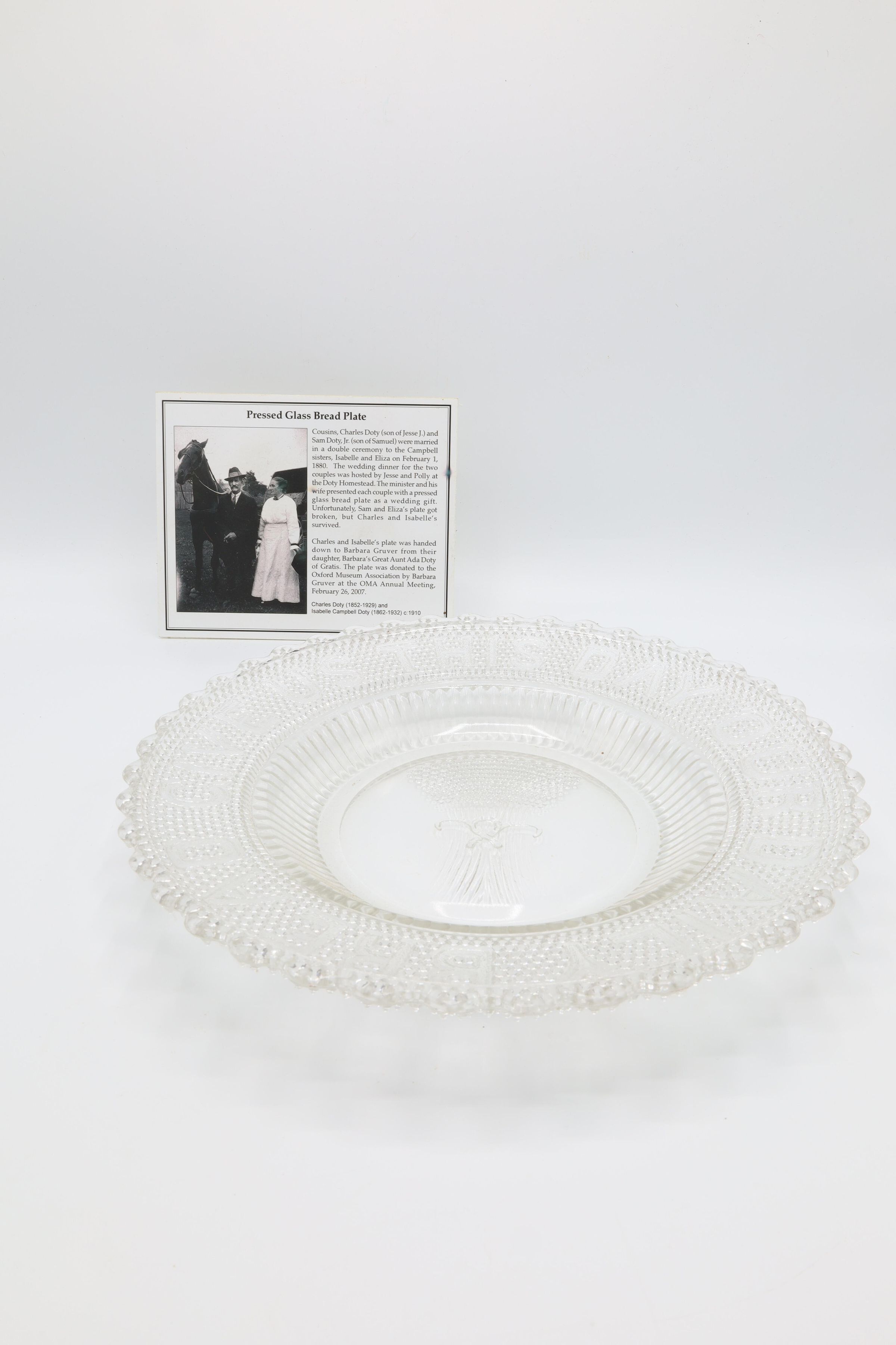 This pressed glass bread plate was presented as a wedding present to Charles Doty and Isabelle Campbell Doty on February 1, 1880. Bread plates were a trendy gift circa 1870 to 1900.