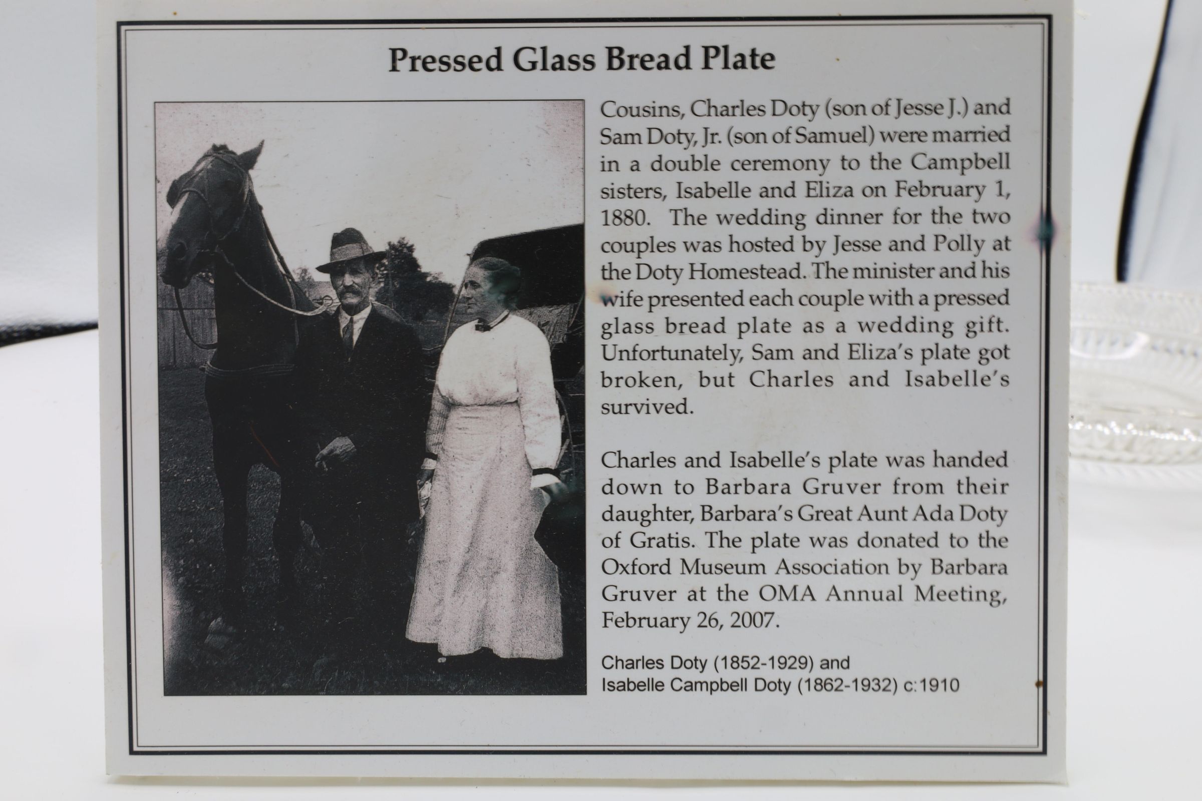Cousins Charles Doty and Sam Doty, Jr. were married in a double ceremony to the Campbell sisters, Isabelle and Eliza, on February 1, 1880. Charles' parents hosted the wedding dinner for the two couples at the Doty Homestead located in Hueston Woods State Park. Each couple was presented with a pressed glass bread plate as a wedding gift. Unfortunately, Sam and Eliza's plate broke, but Charles and Isabelle survived.Location