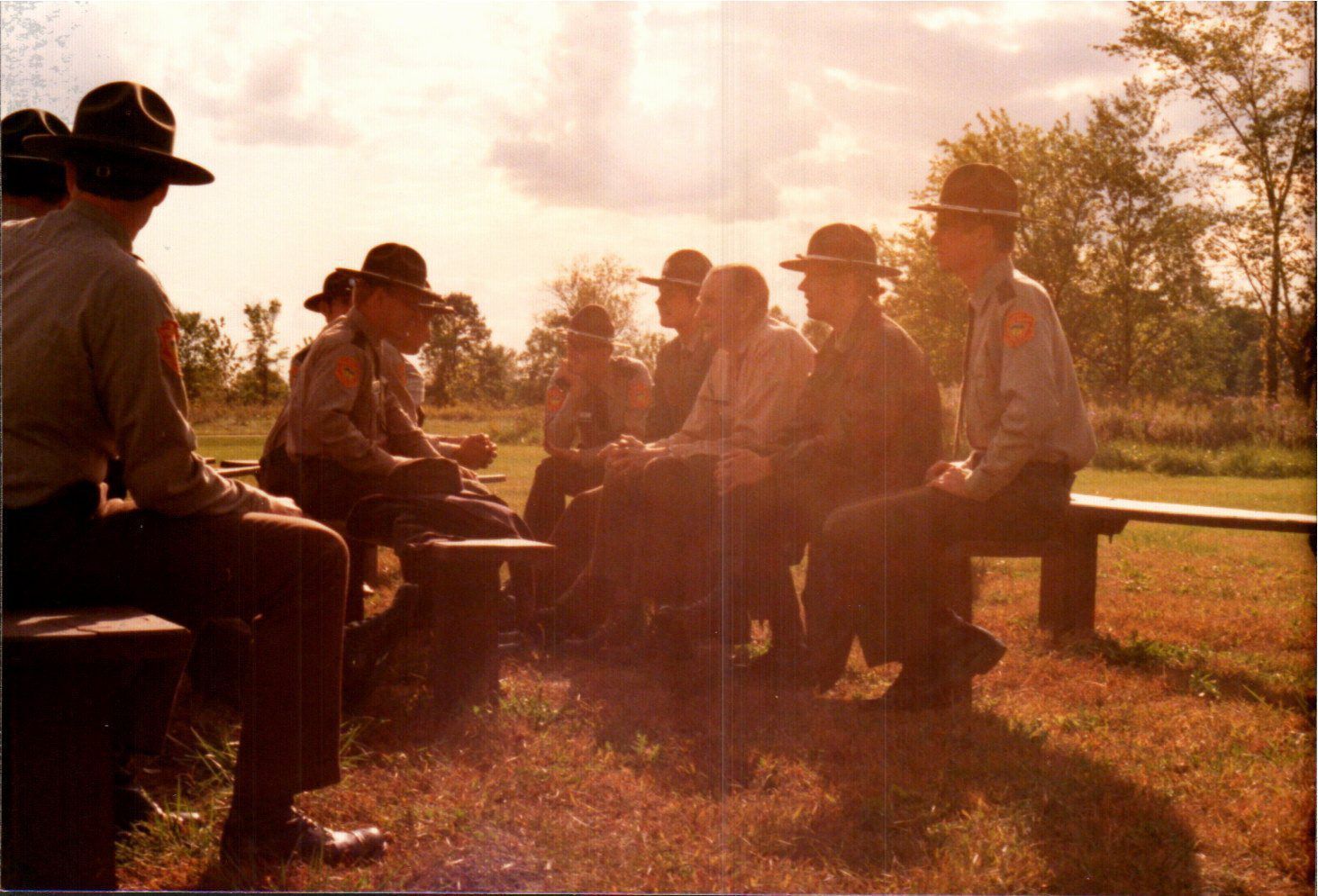 Park rangers meet in the light of the setting sun at Delaware State Park.
