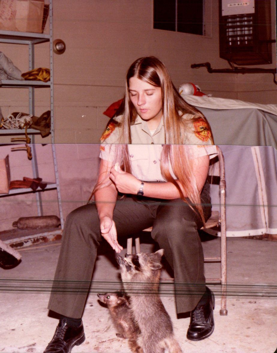 A park ranger at Indian Lake State Park offers her hand to two curious racoons in September of 1980.