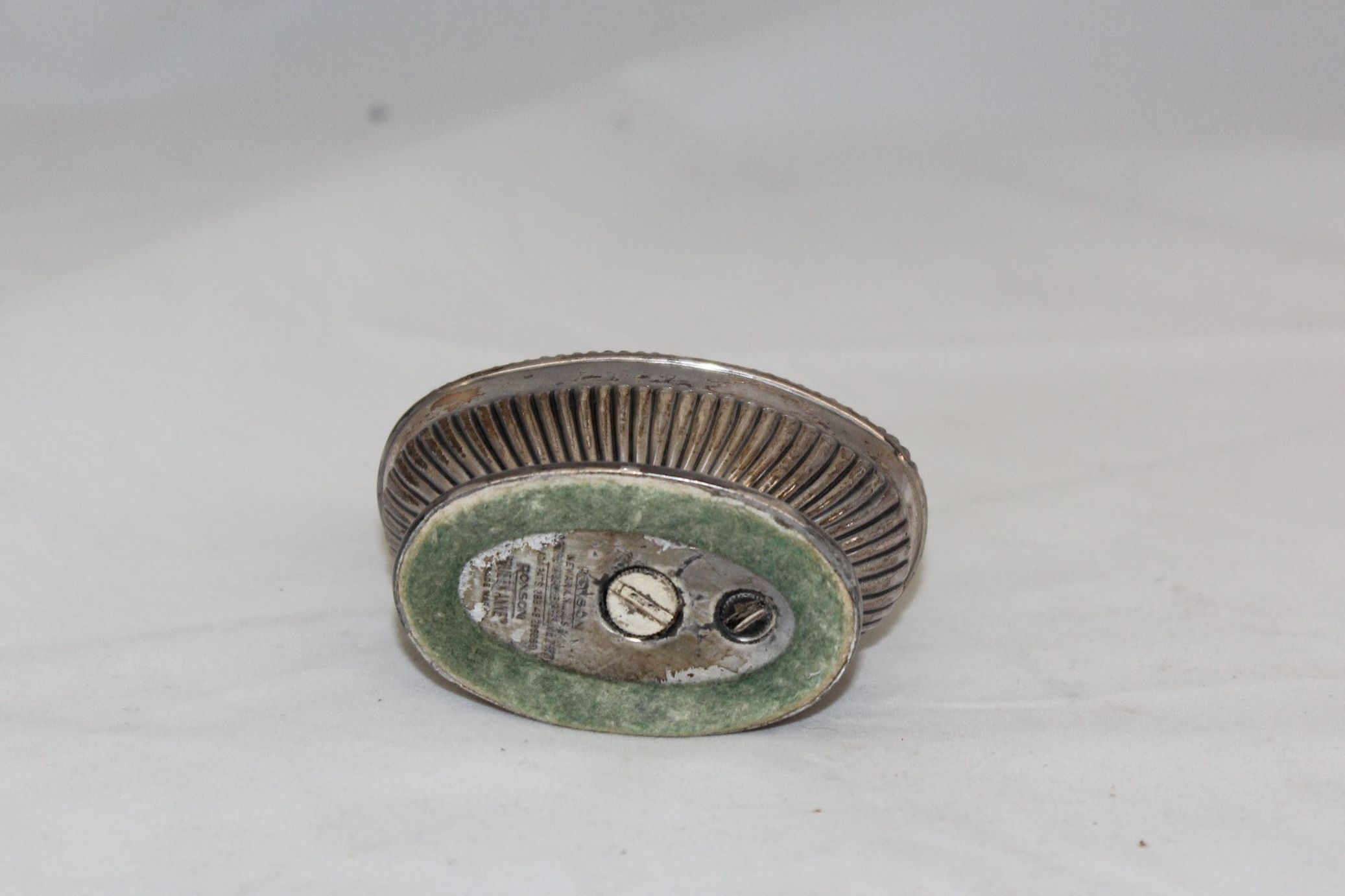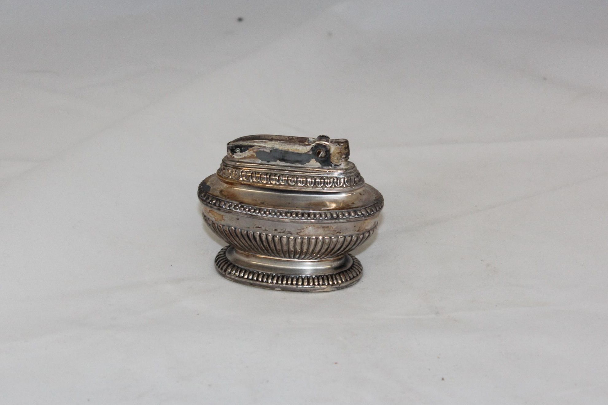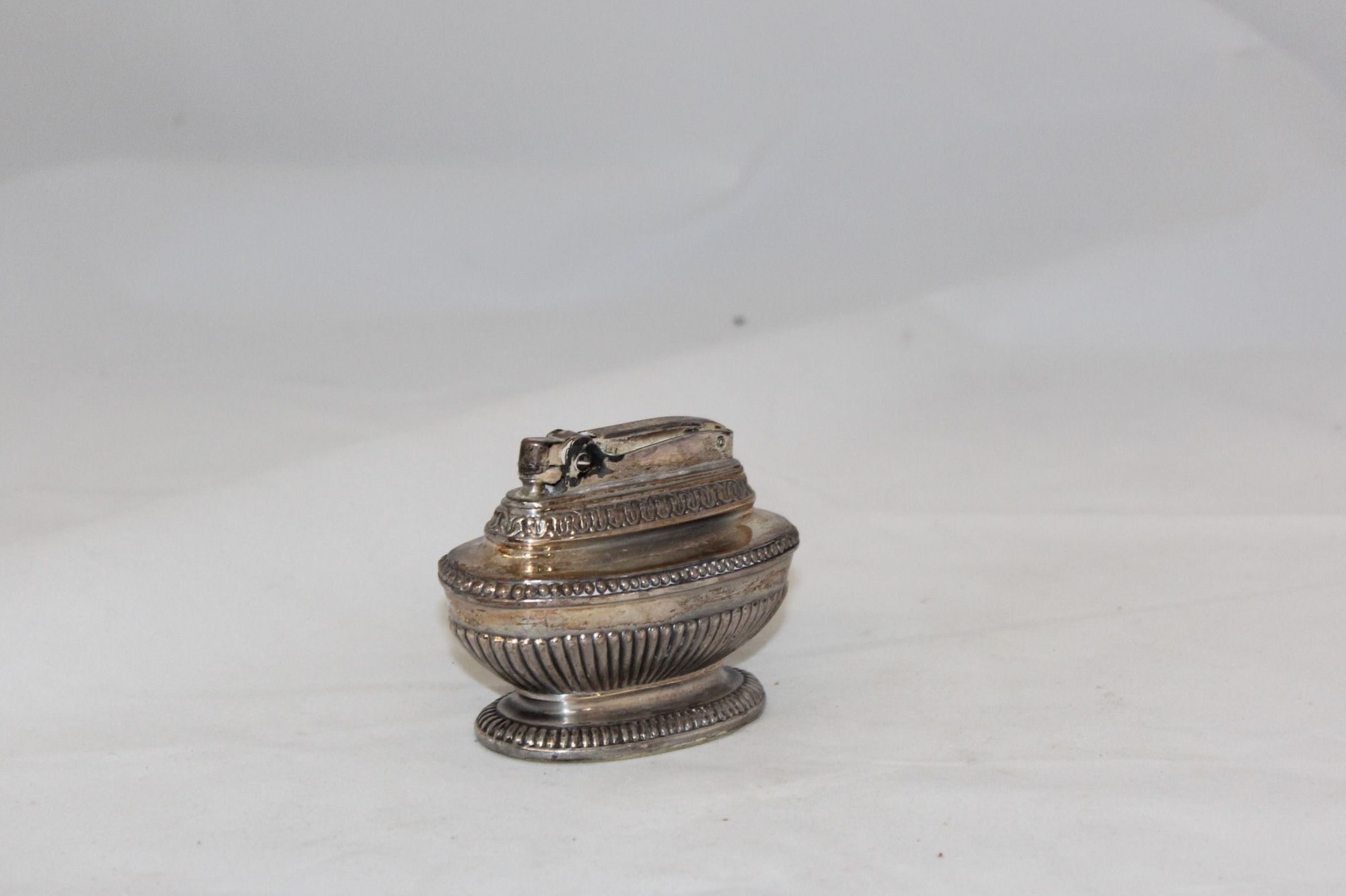 This silverplated table lighter was produced by Ronson Art Metal. It is a Queen Anne design with a simple beaded border at the top and bottom as well as vertical lines around the center.