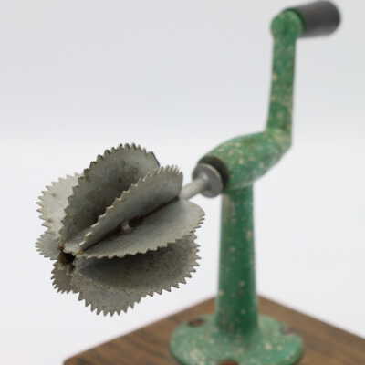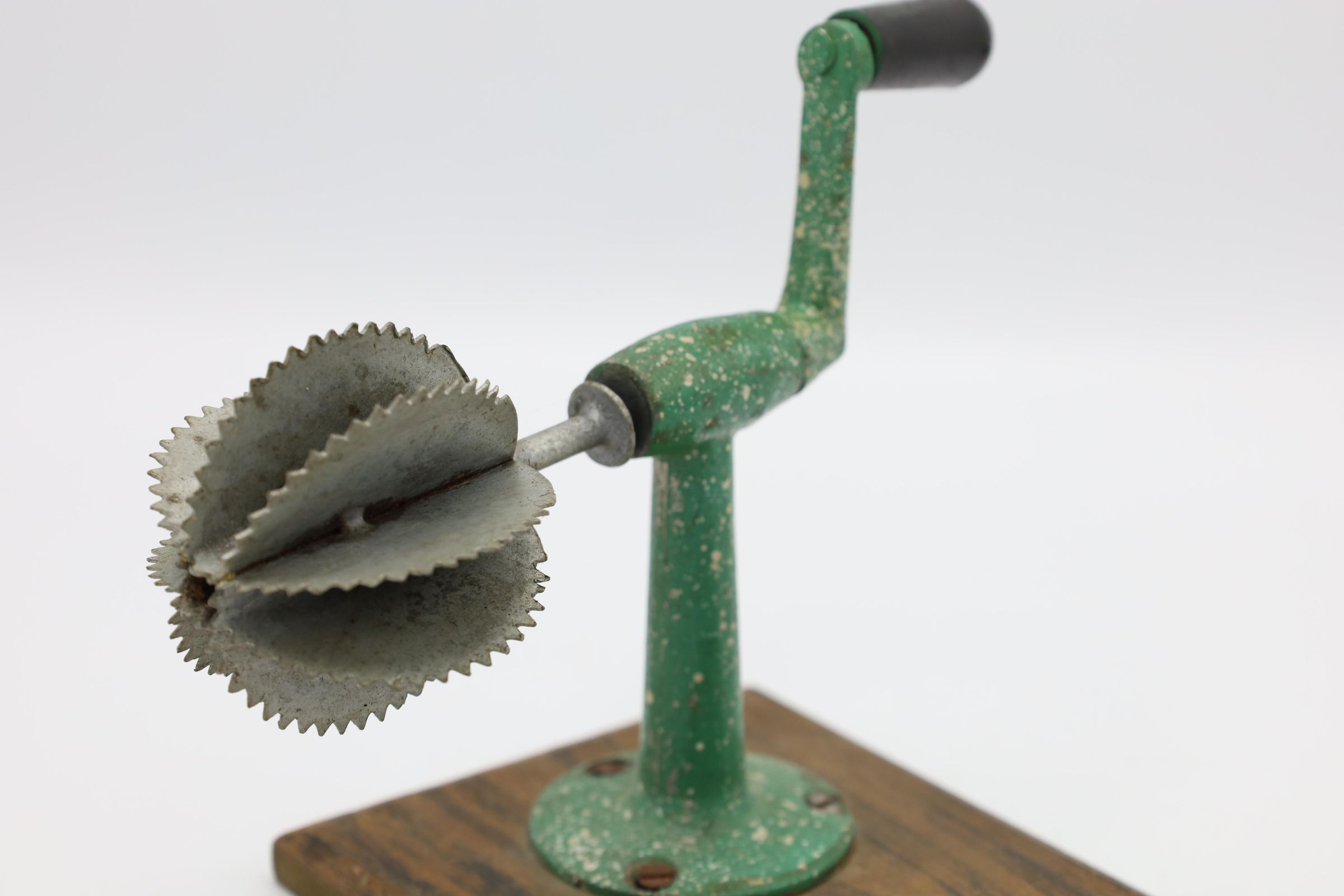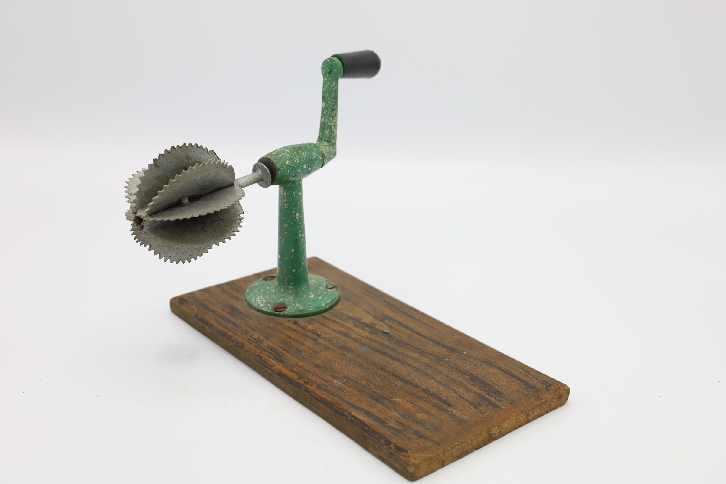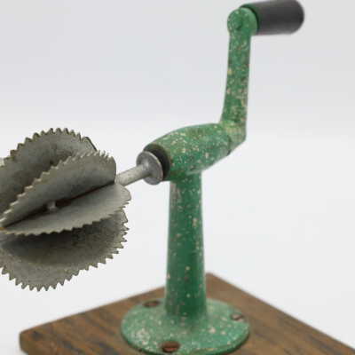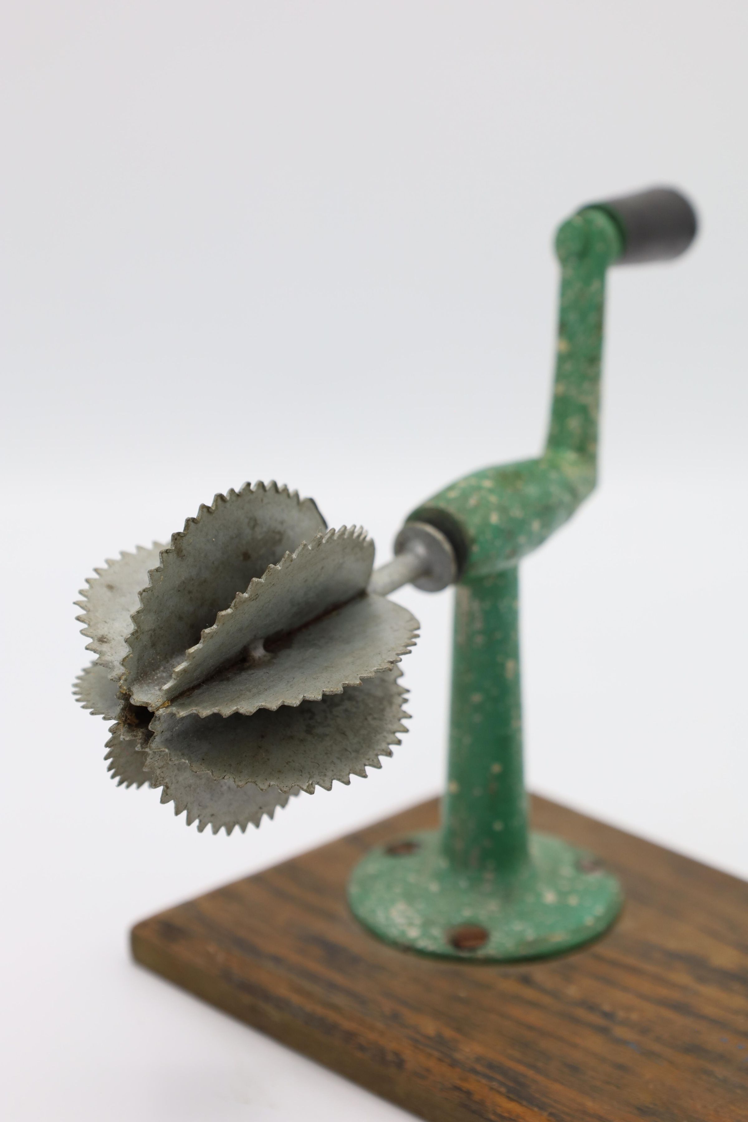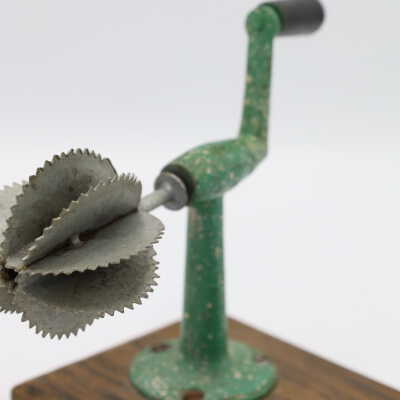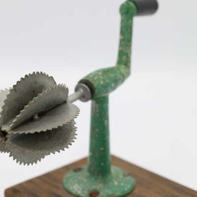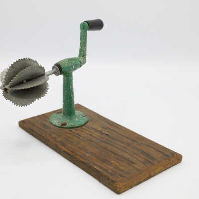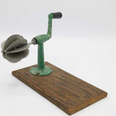 Coconuts have many uses, but cracking the hard outer shell and removing the meat can be difficult. The rotary coconut grater fits inside the broken coconut shell. When the handle is turned, the blades scrape the coconut out. There have been many forms of coconut grater used throughout the years. This type is still manufactured and available today, although there are automatic graters now.Location