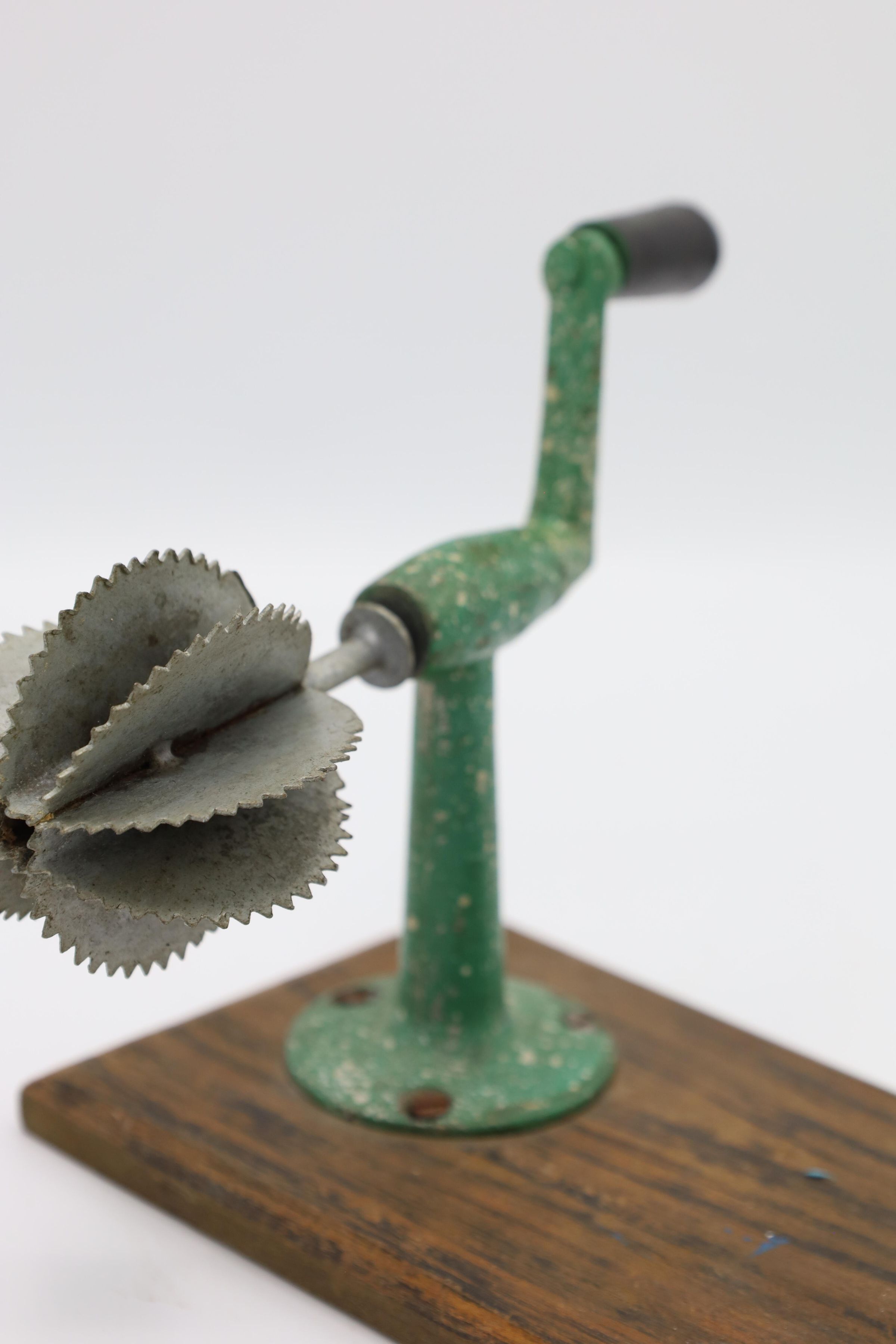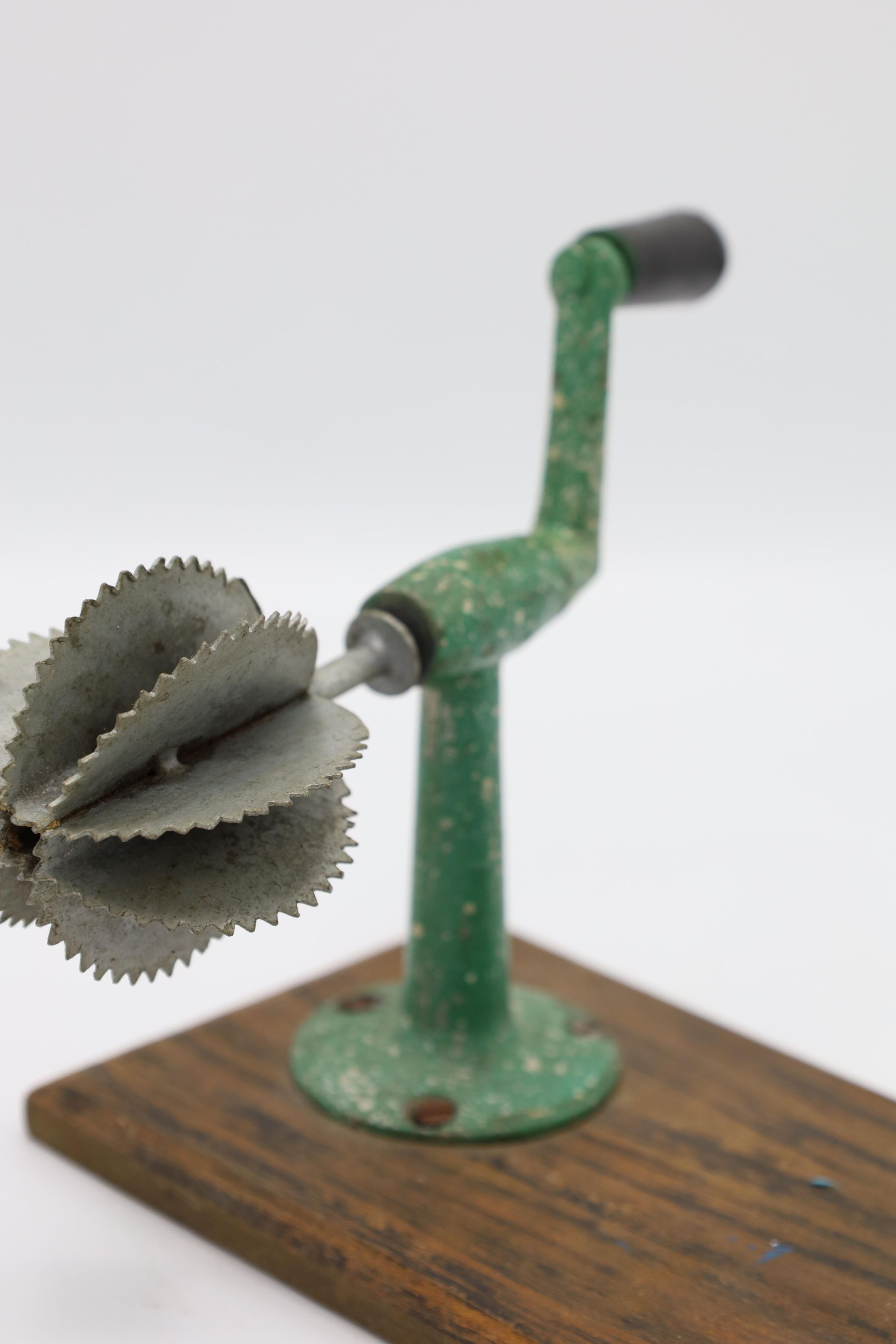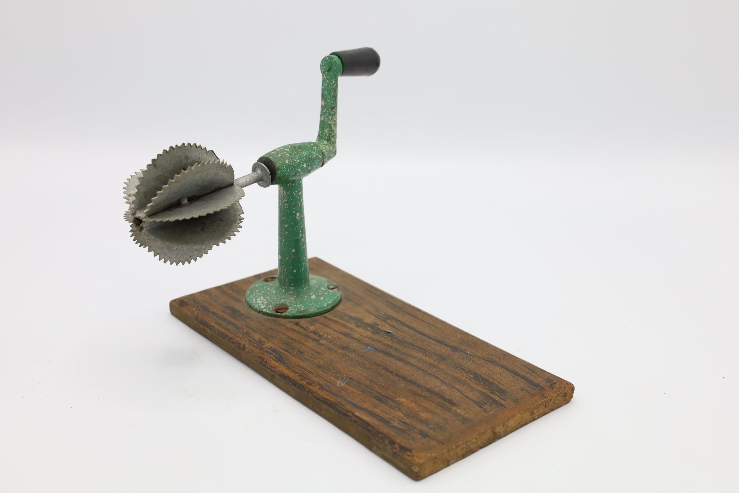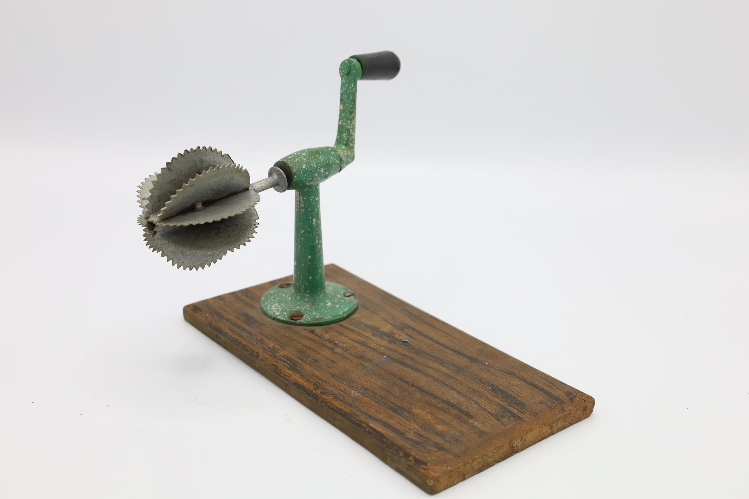 Coconuts have many uses, but cracking the hard outer shell and removing the meat can be difficult. The rotary coconut grater fits inside the broken coconut shell. When the handle is turned, the blades scrape the coconut out. There have been many forms of coconut grater used throughout the years. This type is still manufactured and available today, although there are automatic graters now.Location