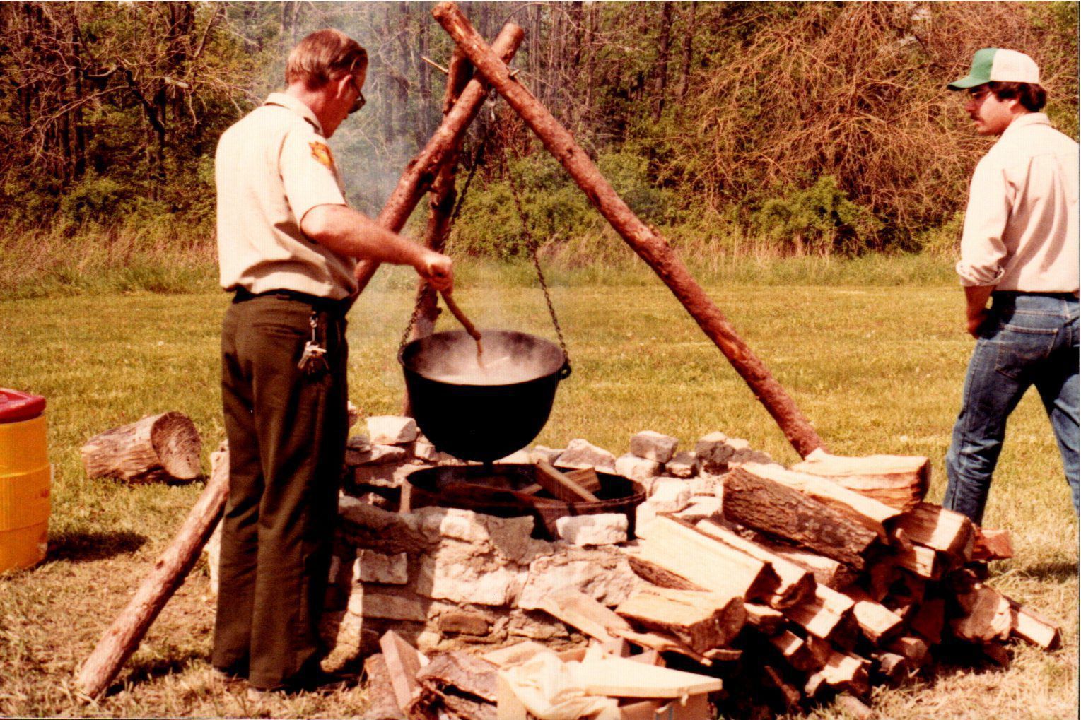 A park ranger at Delaware State Park stirs the contents of a large pot heated by a wood fire. The pot hangs from a structure made from tree limbs. A hungry parkgoer eyes carefully eyes the ranger.Cataloged By