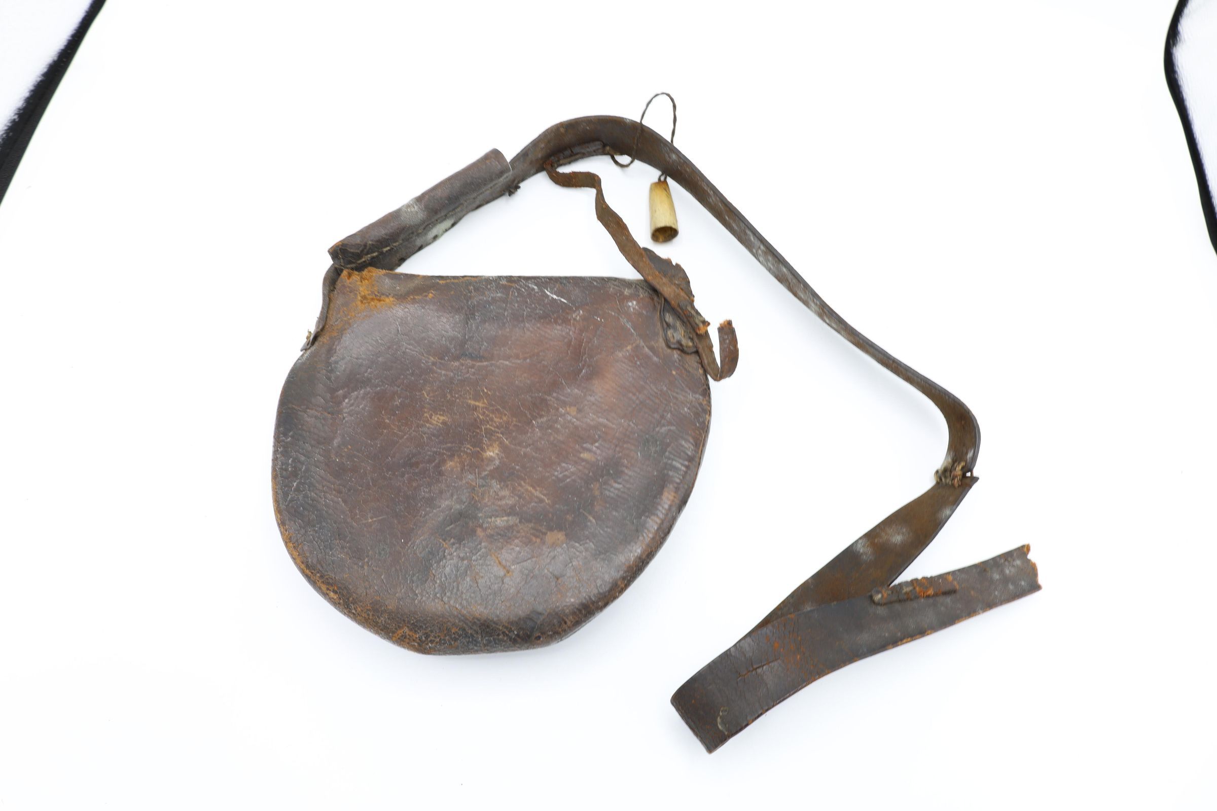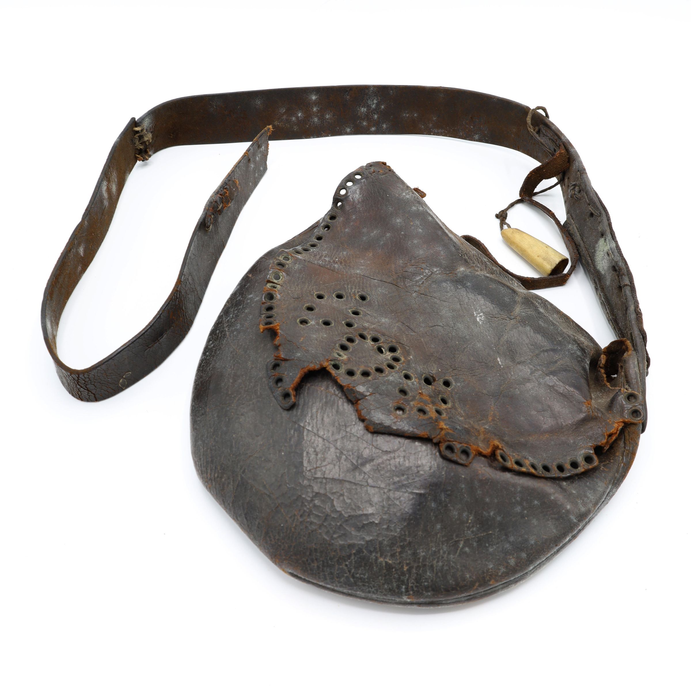 This is a perforated brown leather crescent-shaped saddle bag with a long strap. A saddle bag was tied or strapped to the saddle of a horse or hung about a person's shoulder and used to carry necessary items on a journey.