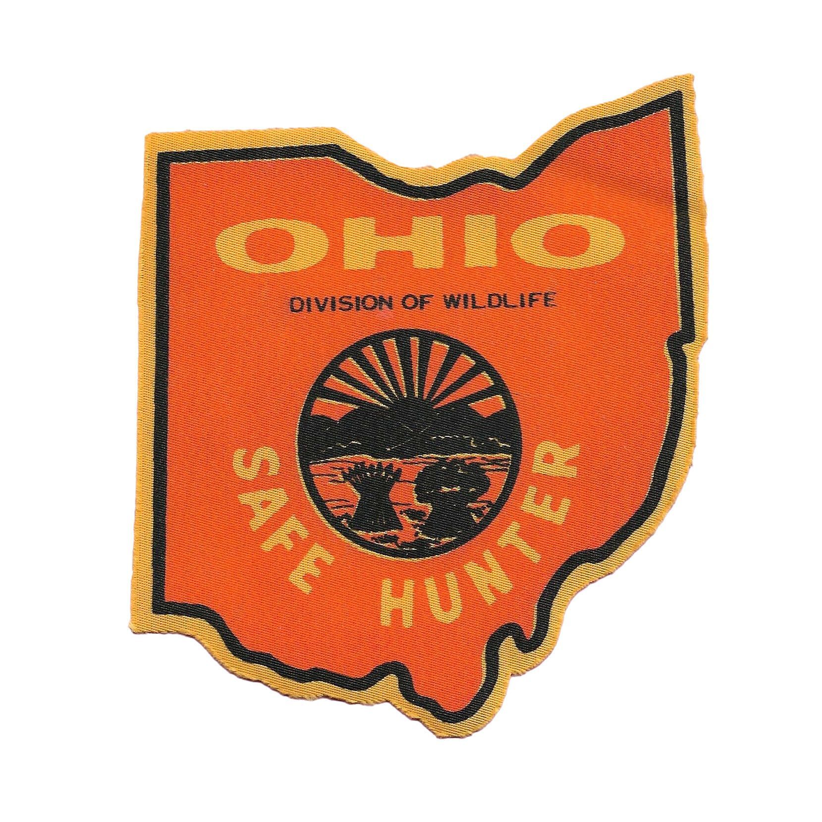 This safe hunter patch is in the shape of Ohio. It features the Great Seal of Ohio in the center in black, "Ohio" and "Safe Hunter" in yellow letters, and "Division of Wildlife" in black letters on orange background with a yellow and black border.