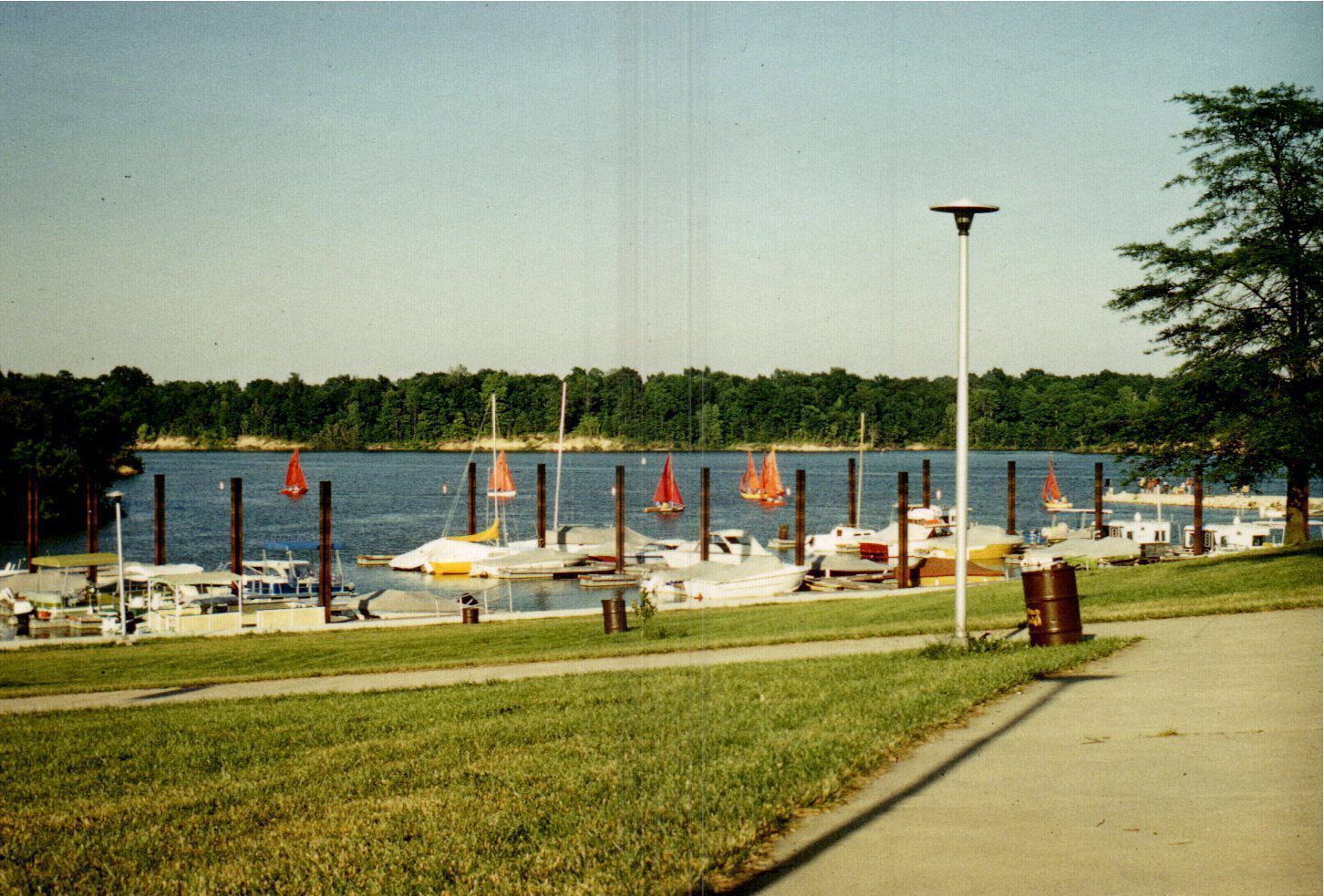 Colorful sailboats with red sails fill the lake at Delaware State Park. Many boats are also docked on the marina. It appears to be a marvelous summer day as a blue, cloudless sky allows the sun to bathe the landscape.Cataloged By