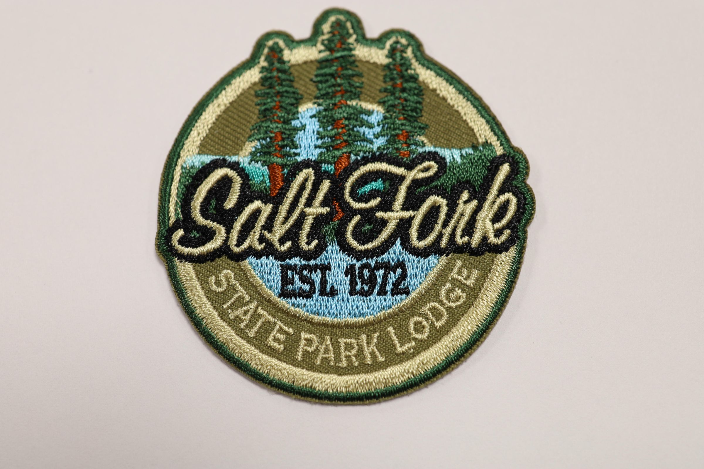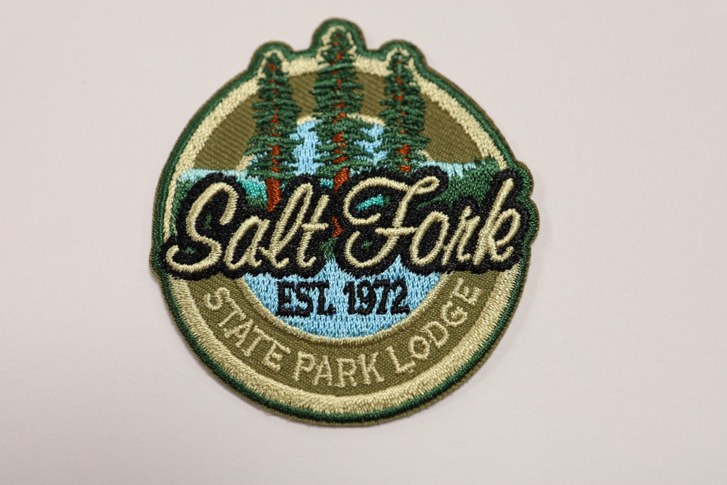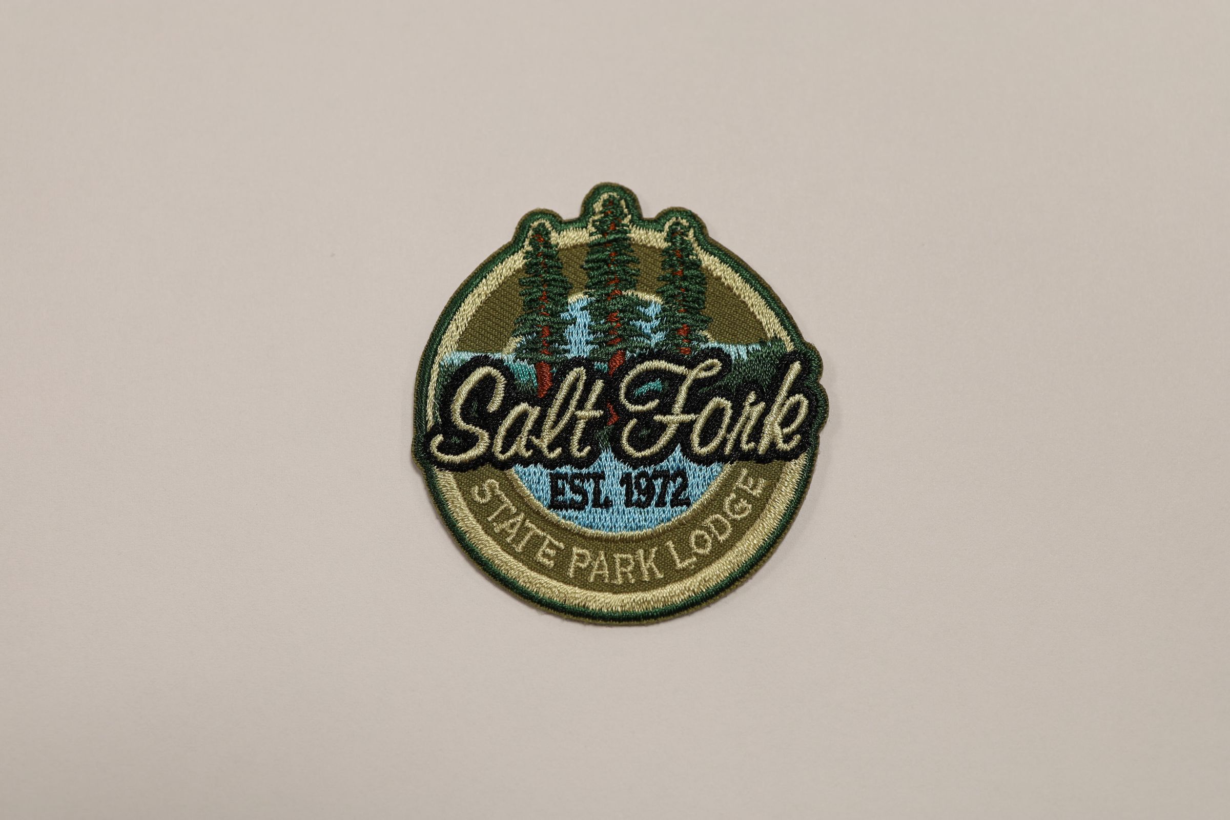 This embroidered round patch is 2.5-inch in diameter with a beige and brown background and dark green border. The patch highlights the name "Salt Fork State Park Lodge" in beige letters outlined in black and "Est. 1972," the year the lodge was established, in black letters. The center of the patch features forest trees and a blue lake.