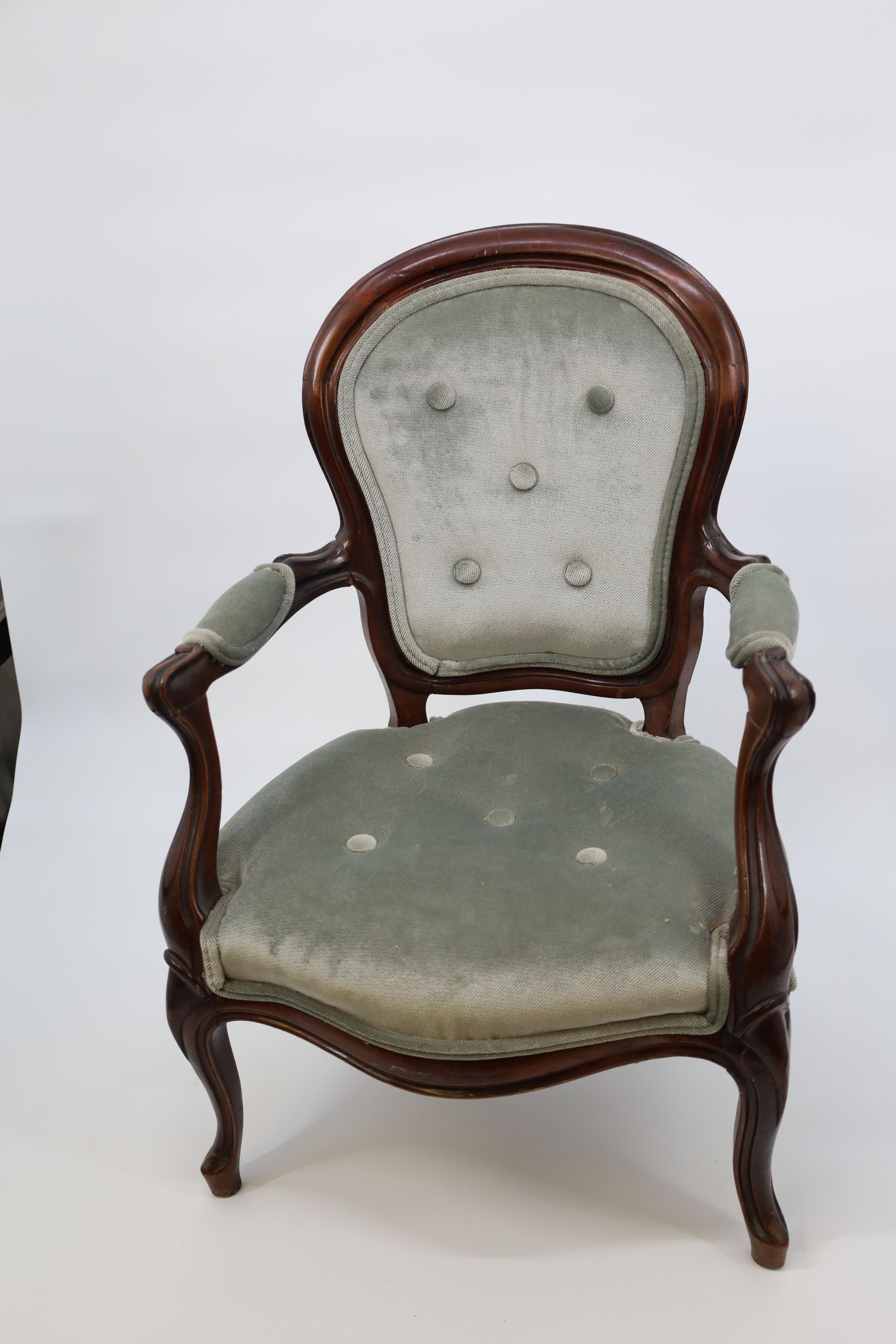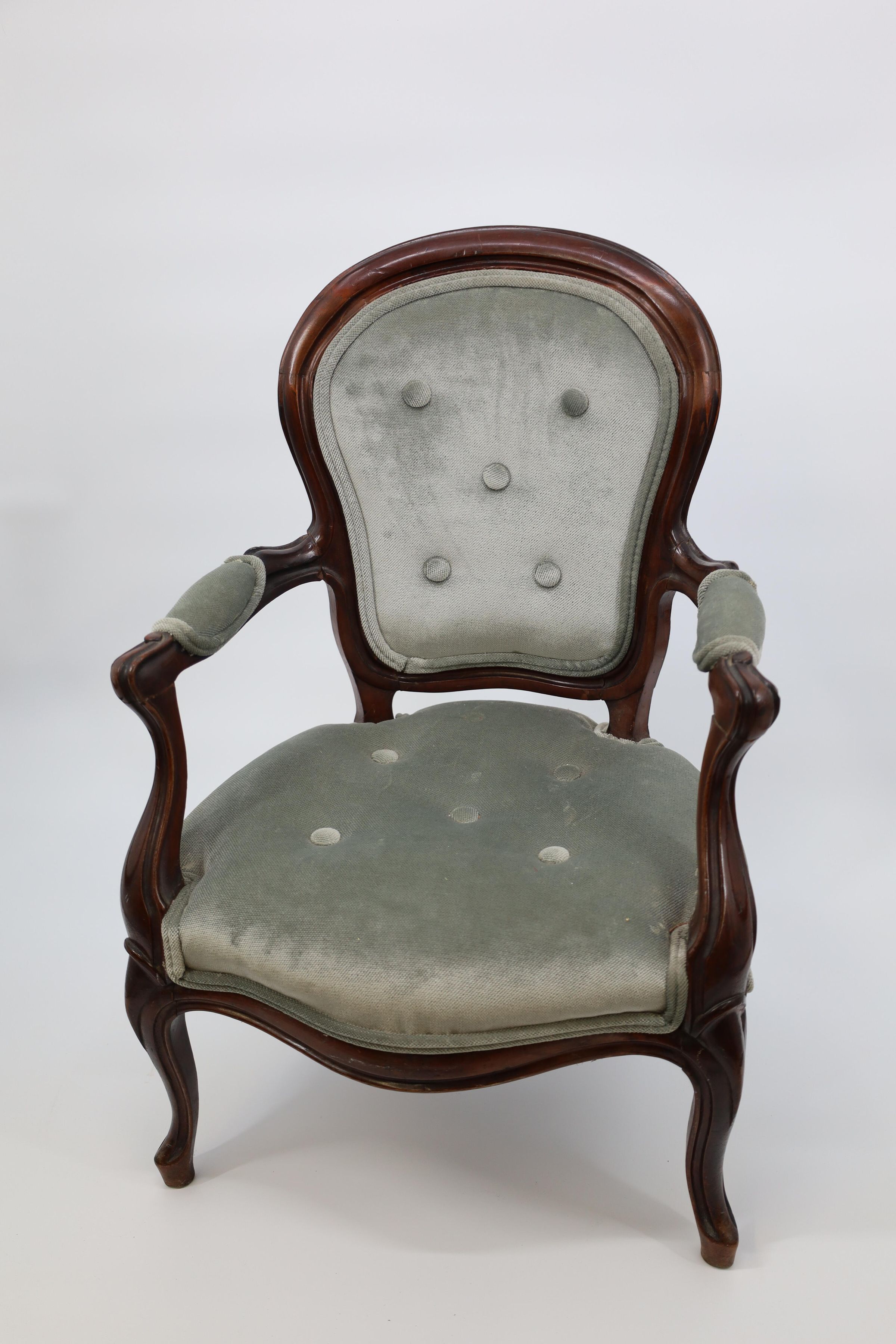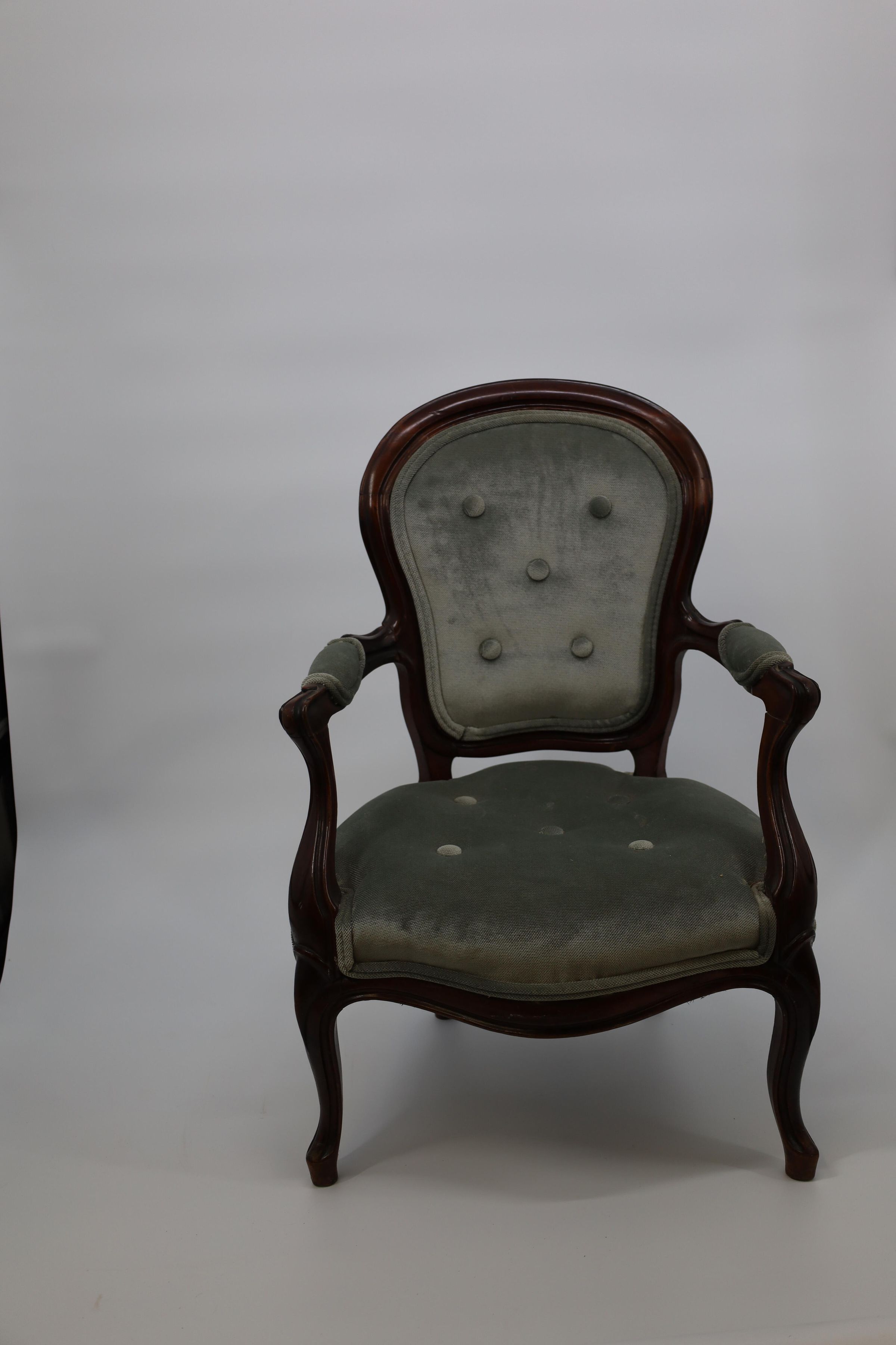 This ornate Louis XV-style chair is a scaled-down sample chair. The Bromfield's acquired sample furniture, like this, for their daughters. This particular chair, with its dark wood and faded velvet upholstery, can be found in Ellen Bromfield's room.Location