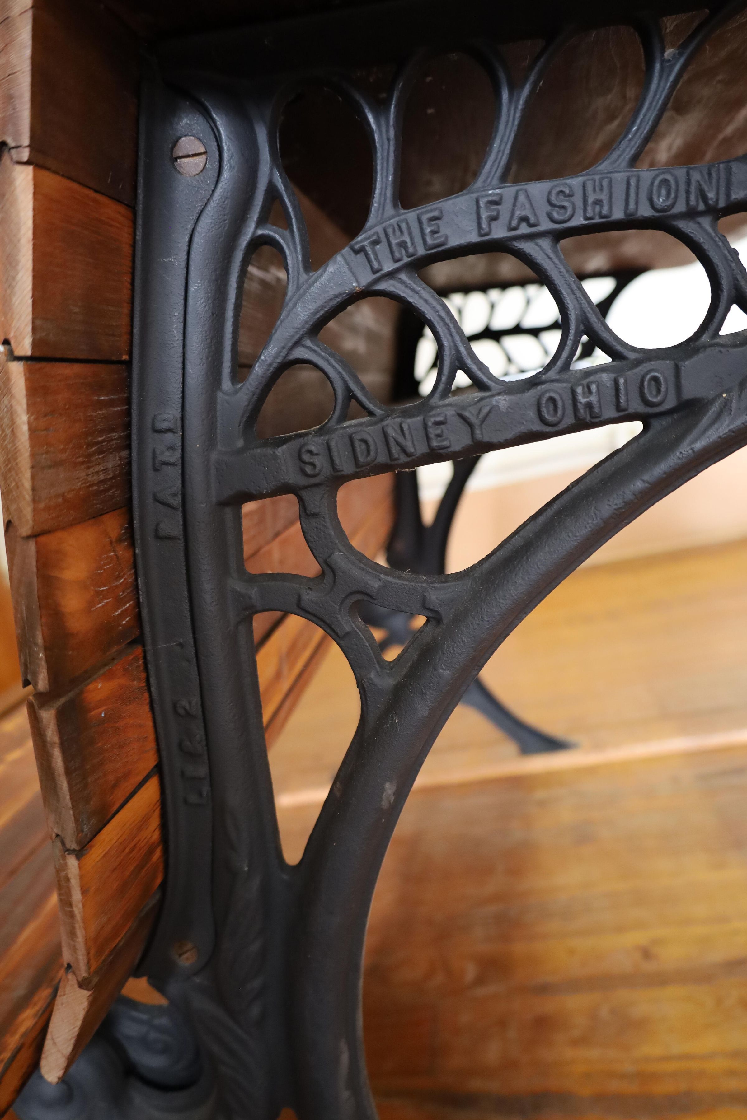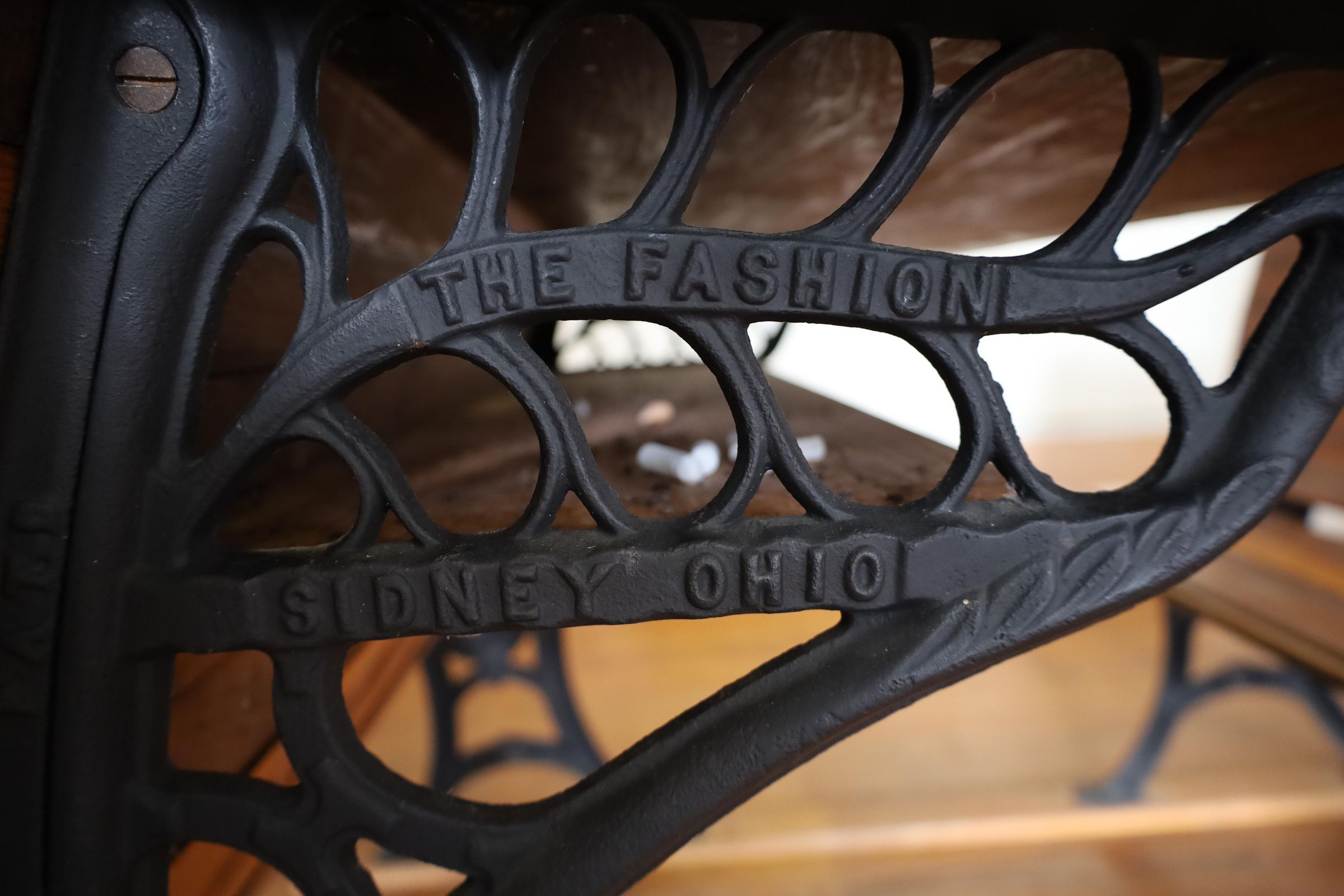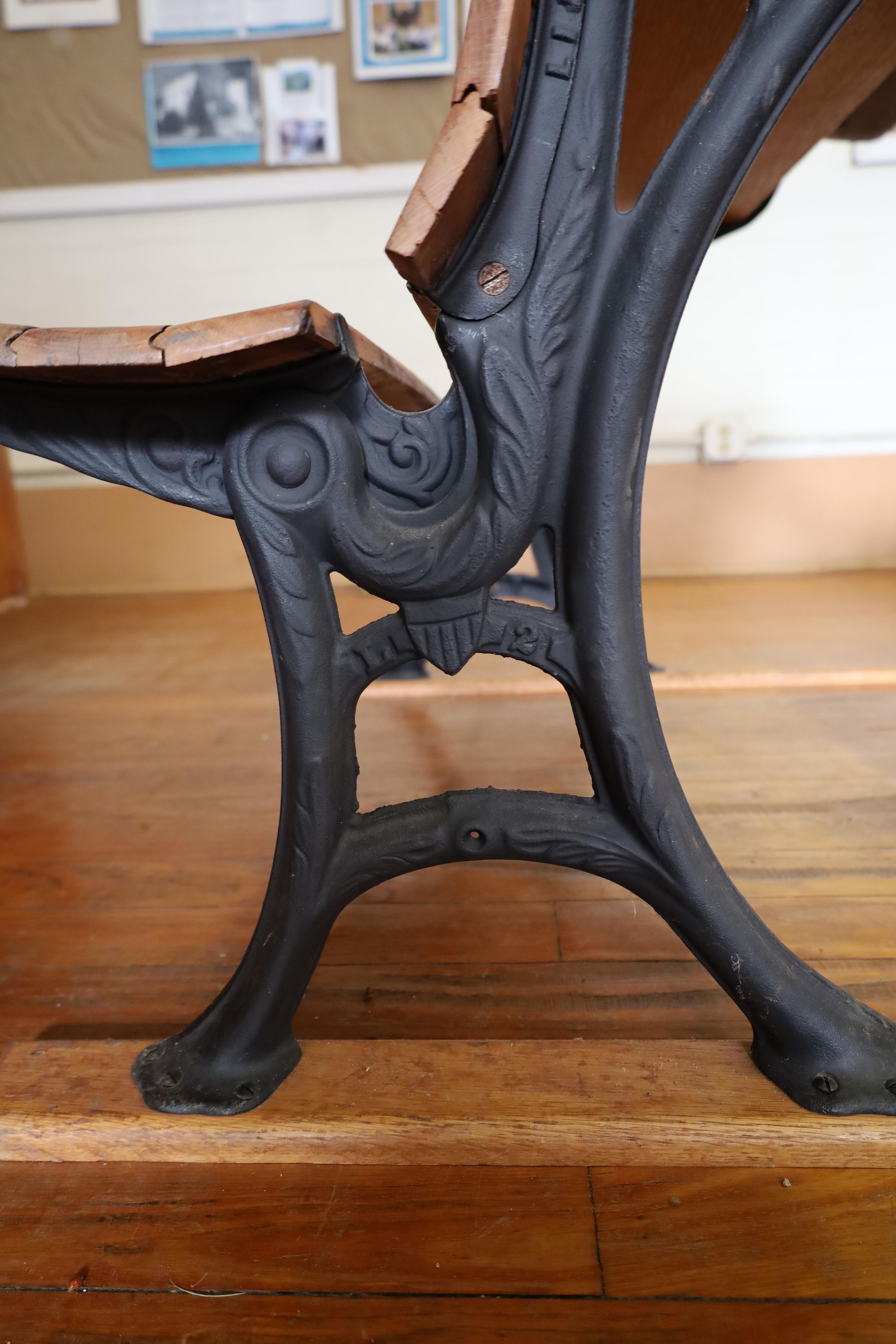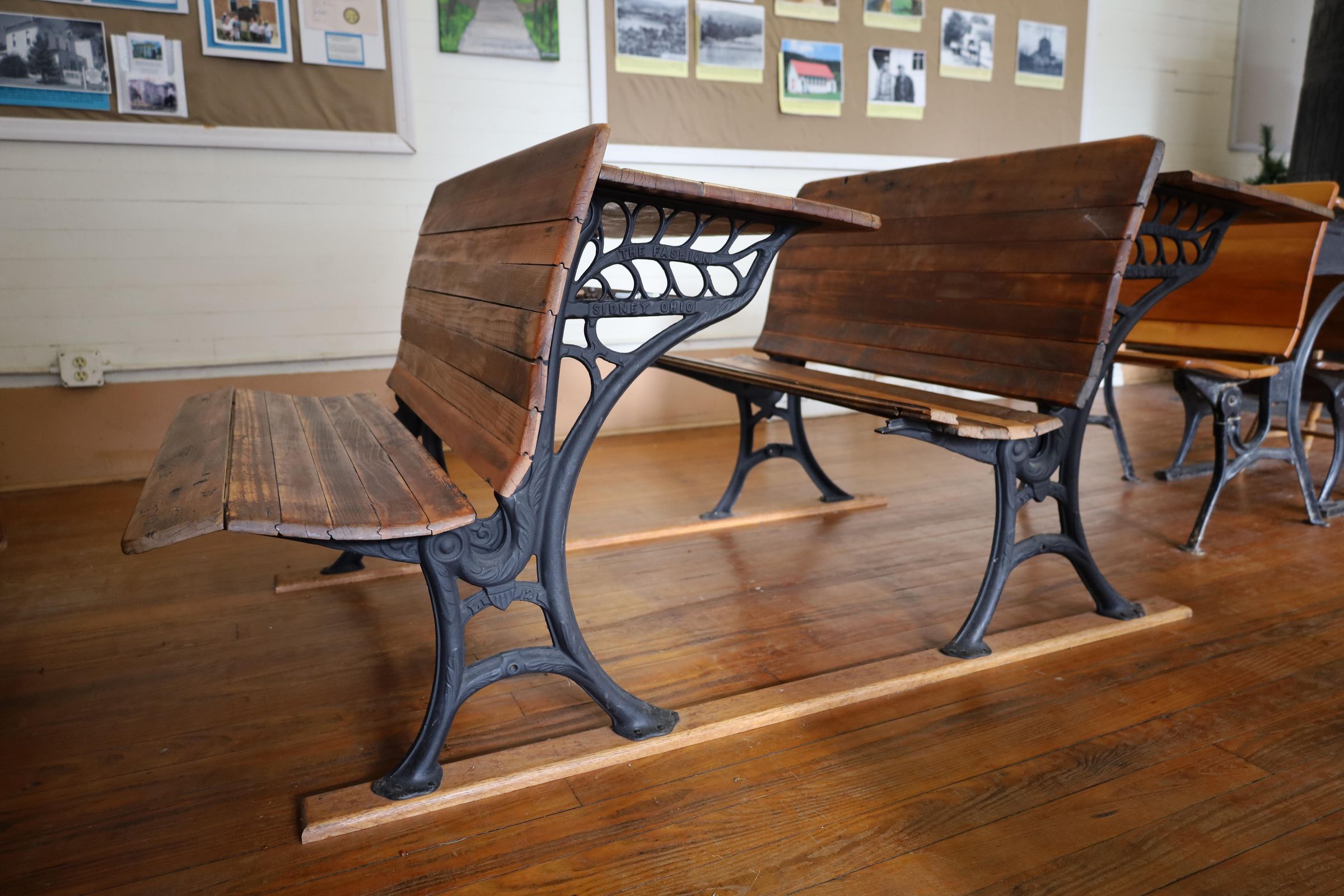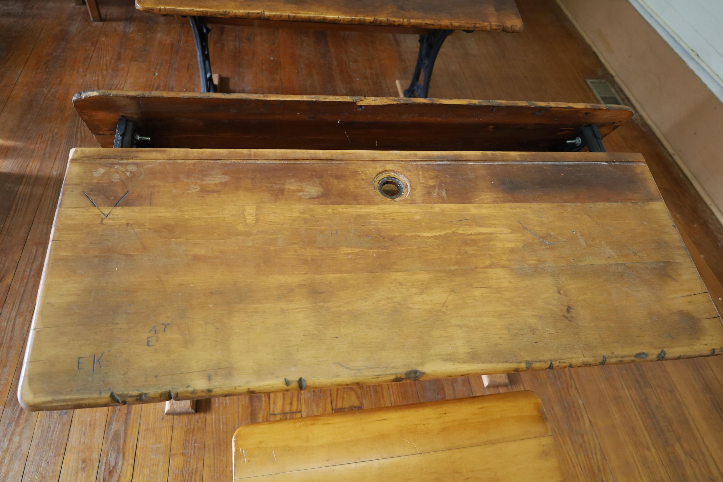 This is an attached back and bench-style school desk with cast iron leg frames, a slatted wood desk, and a bench seat. There is one opening at the top of the desk for an inkwell. The wood surfaces show evidence of names and initials carved on them. Makers marks on the metal portions identify these as 'The Fashion' from Sidney, Ohio.Location