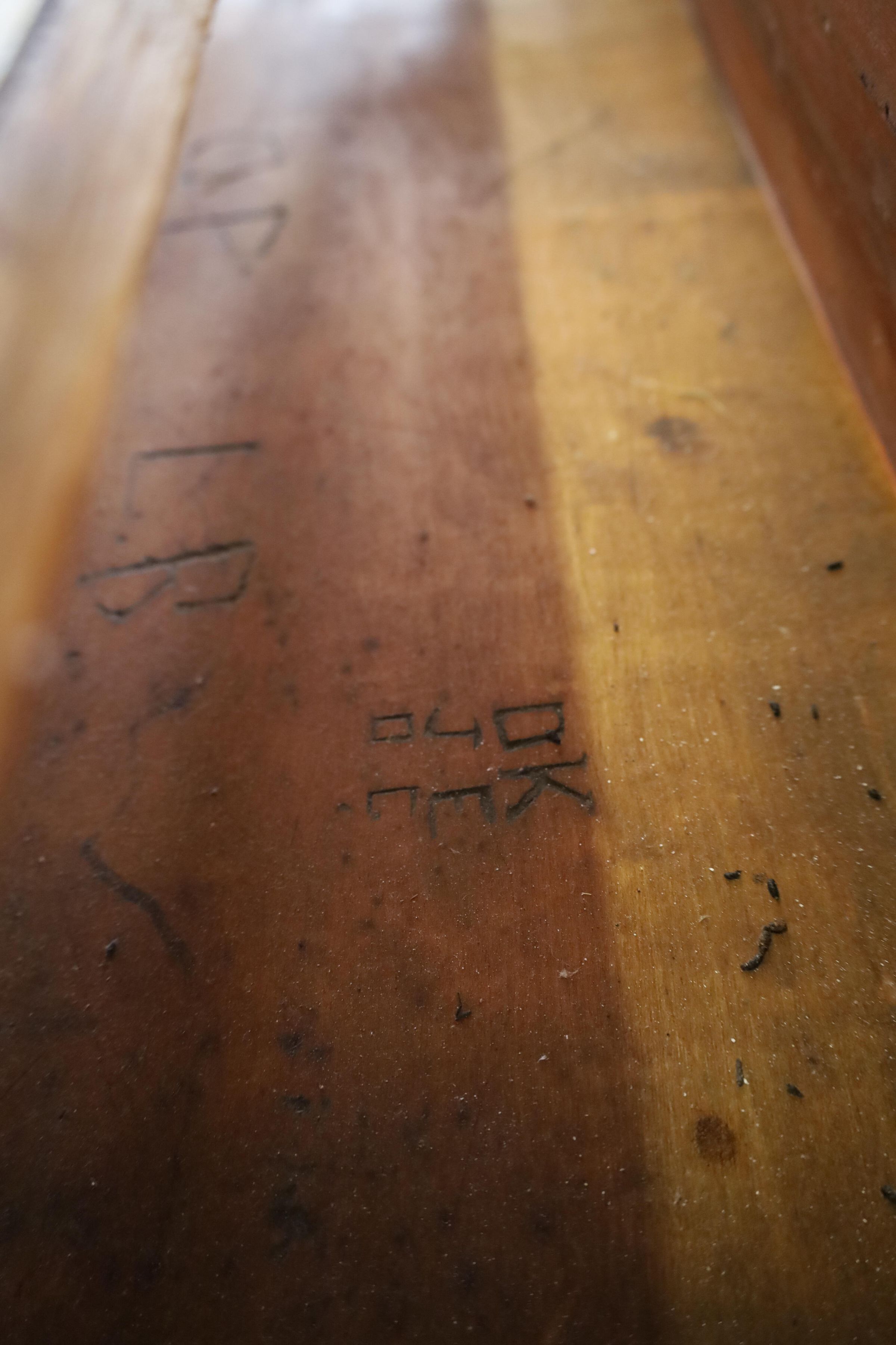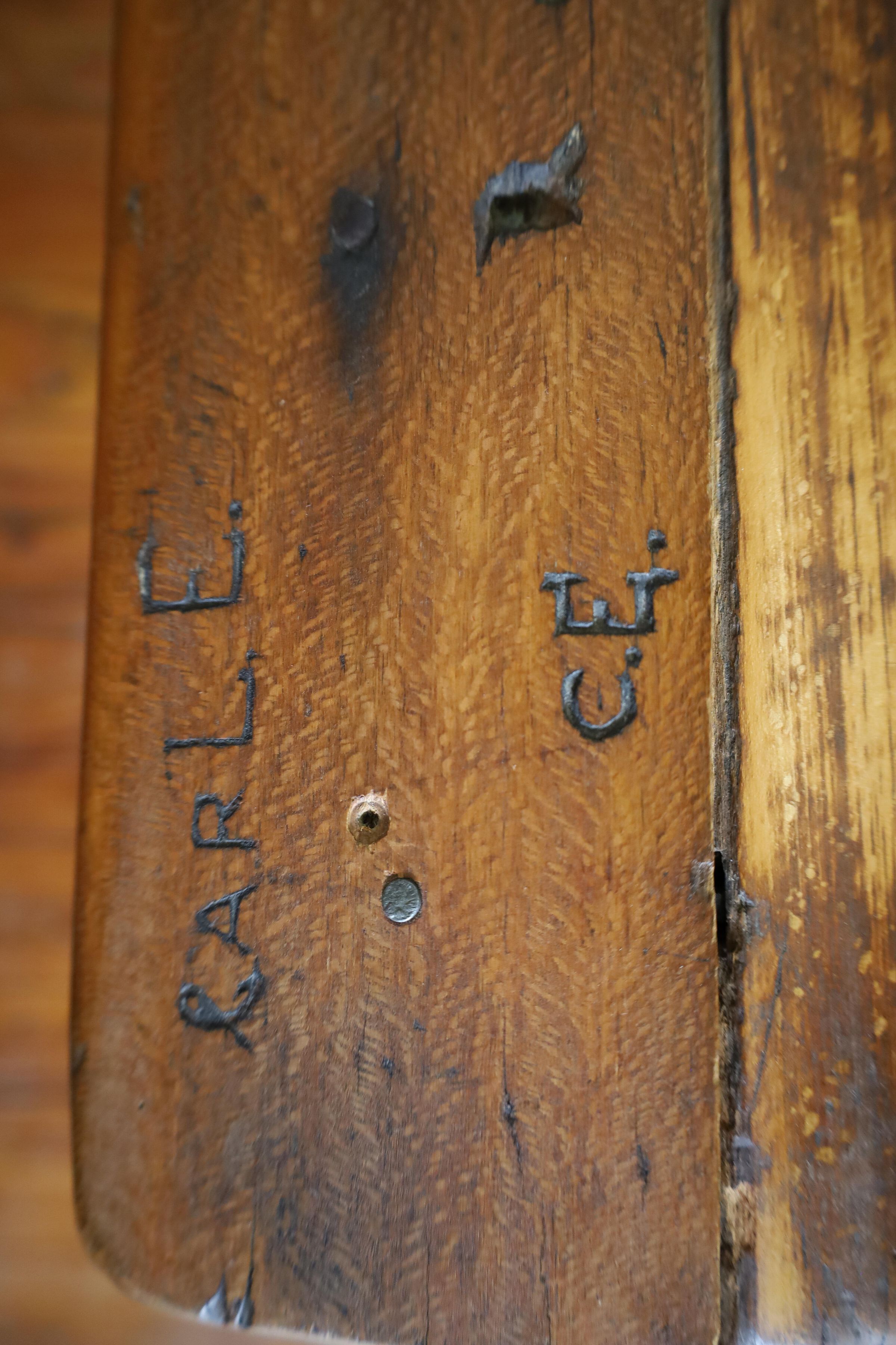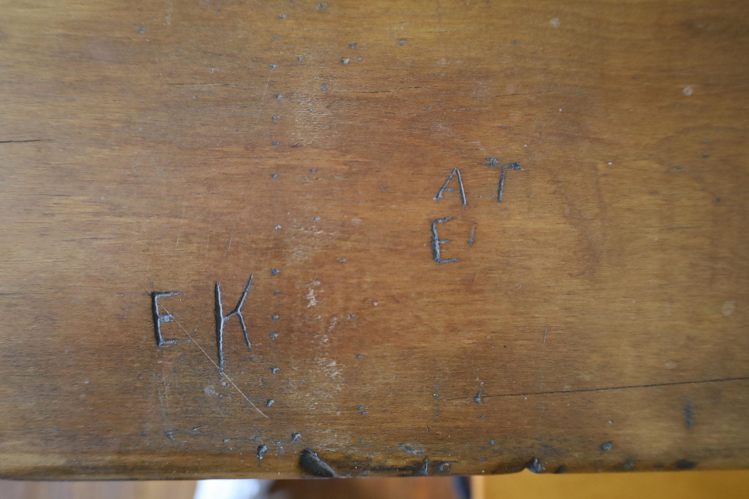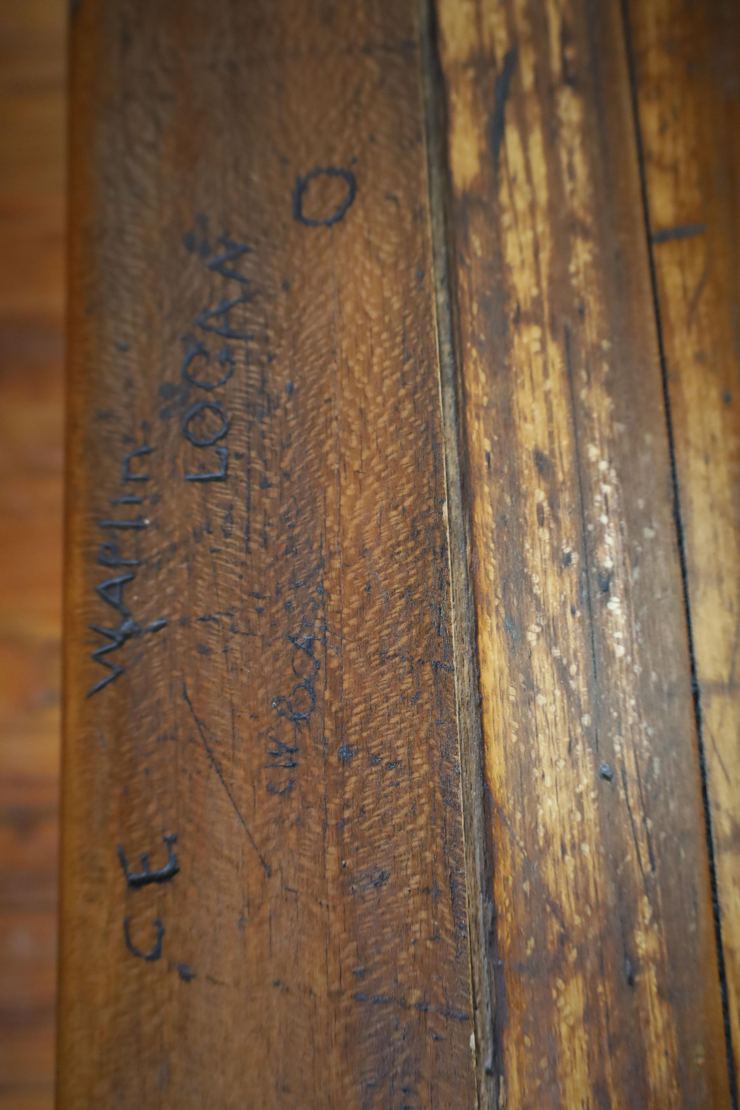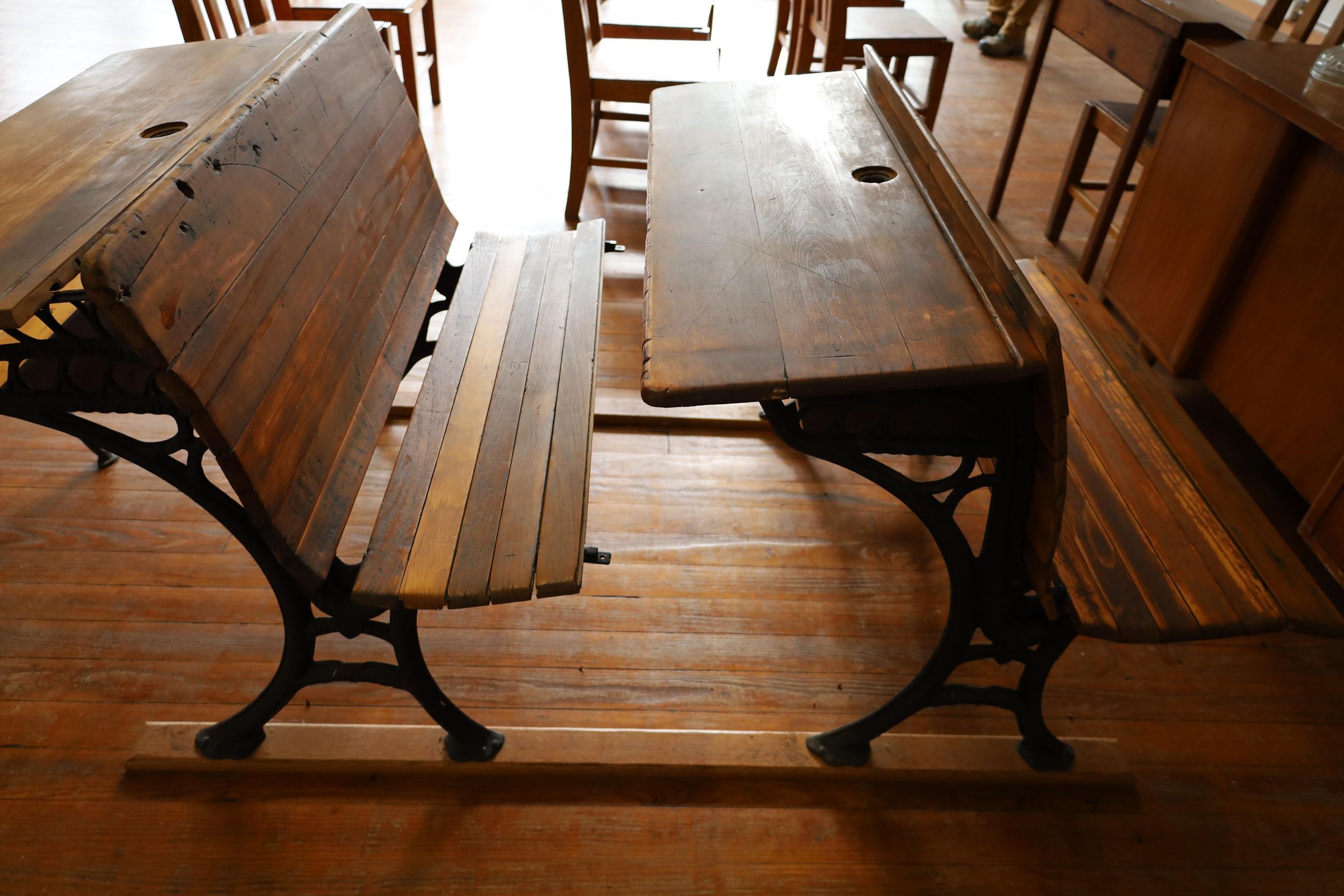 This is an attached back and bench-style school desk with cast iron leg frames, a slatted wood desk, and a bench seat. There is one opening at the top of the desk for an inkwell. The wood surfaces show evidence of names and initials carved on them. Makers marks on the metal portions identify these as 'The Fashion' from Sidney, Ohio.Location