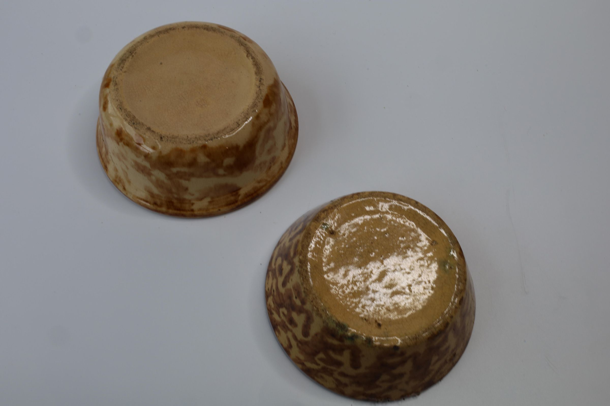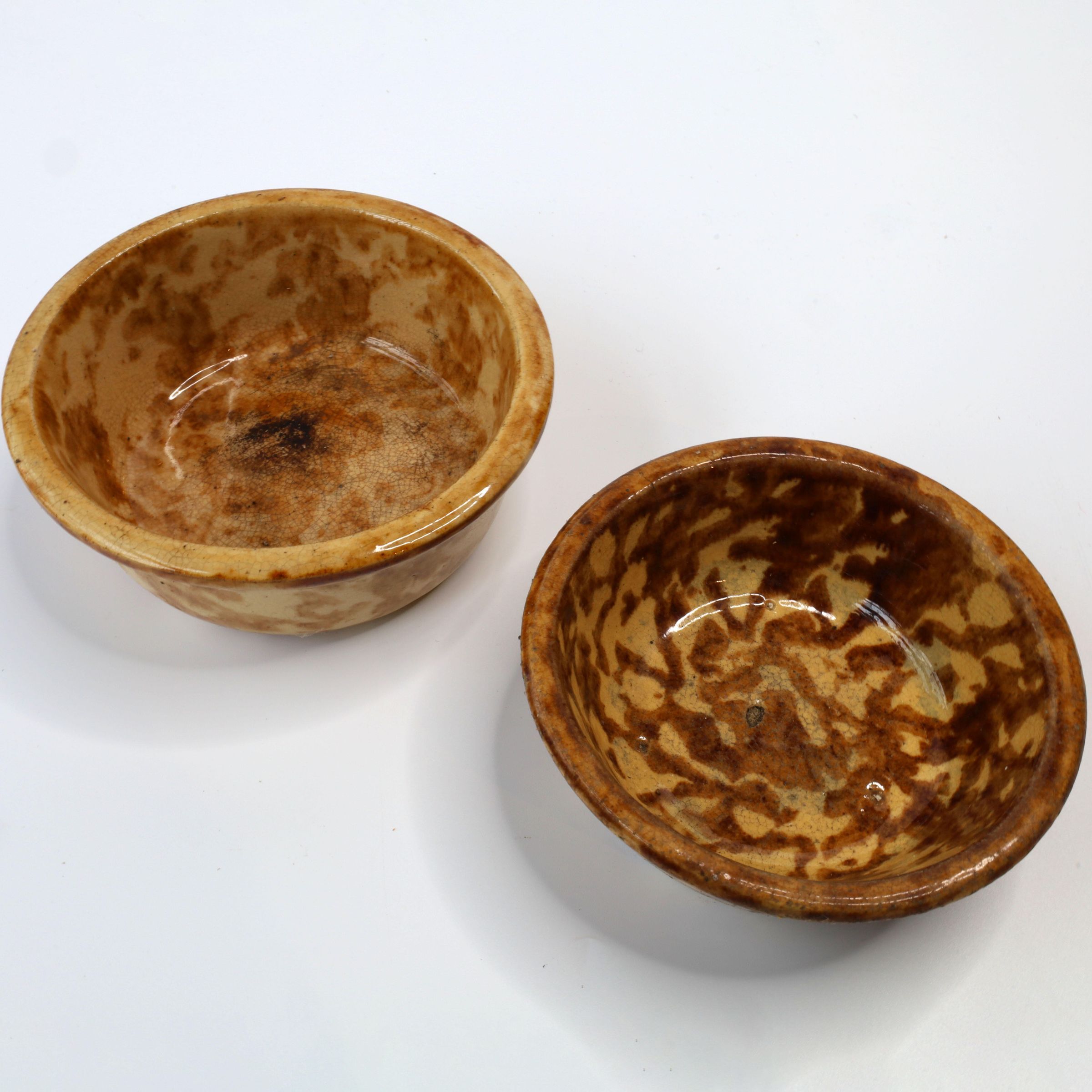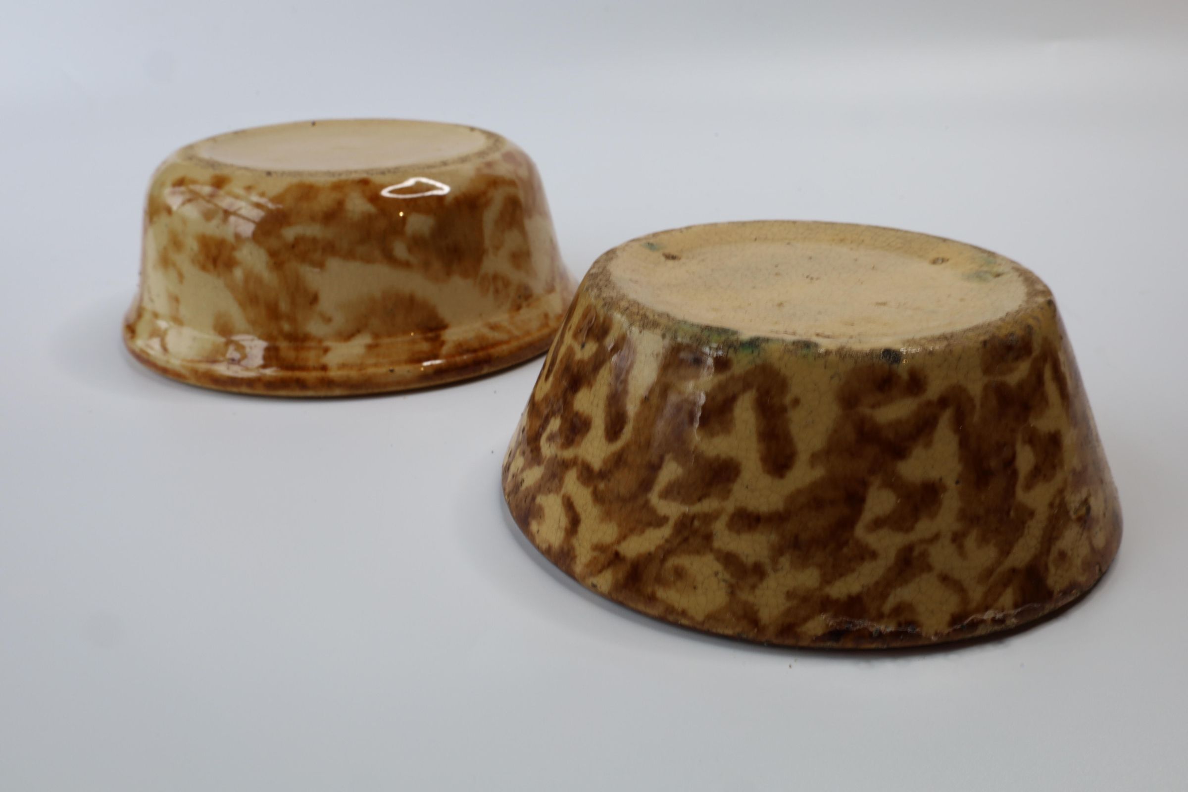 Ceramic yellowware bowls featuring a process called Rockingham glaze or Rockingham ware. The bowls are 4.5" and 5" in diameter.