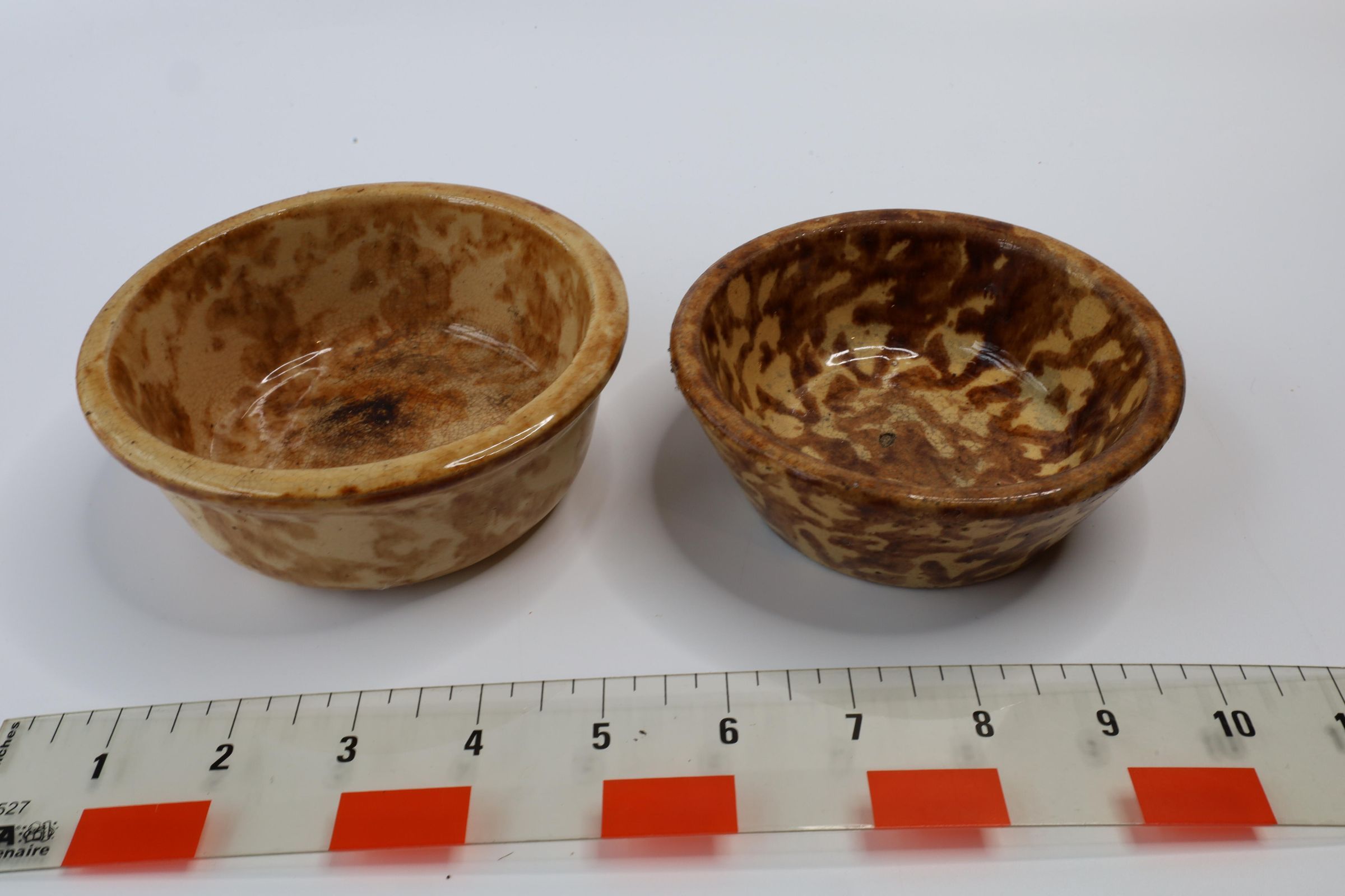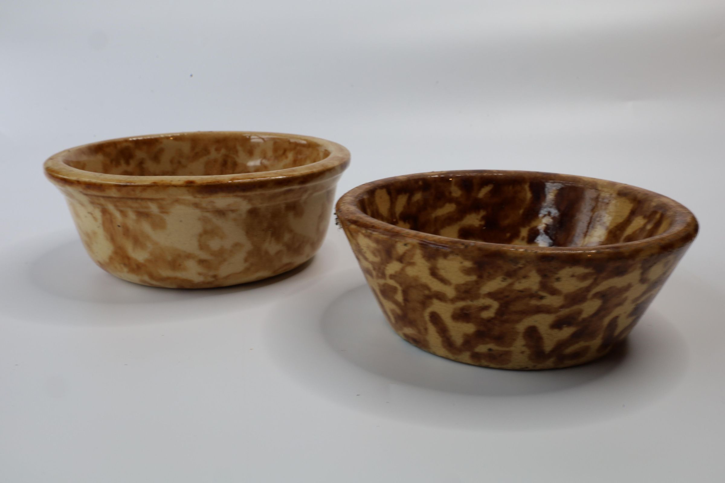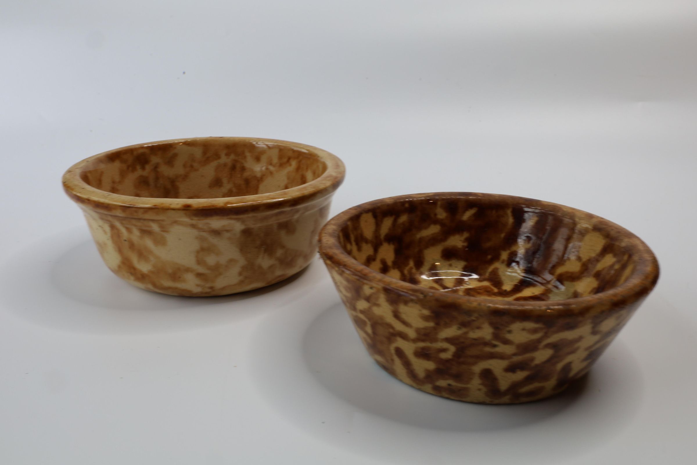 Ceramic yellowware bowls featuring a process called Rockingham glaze or Rockingham ware. The bowls are 4.5" and 5" in diameter.