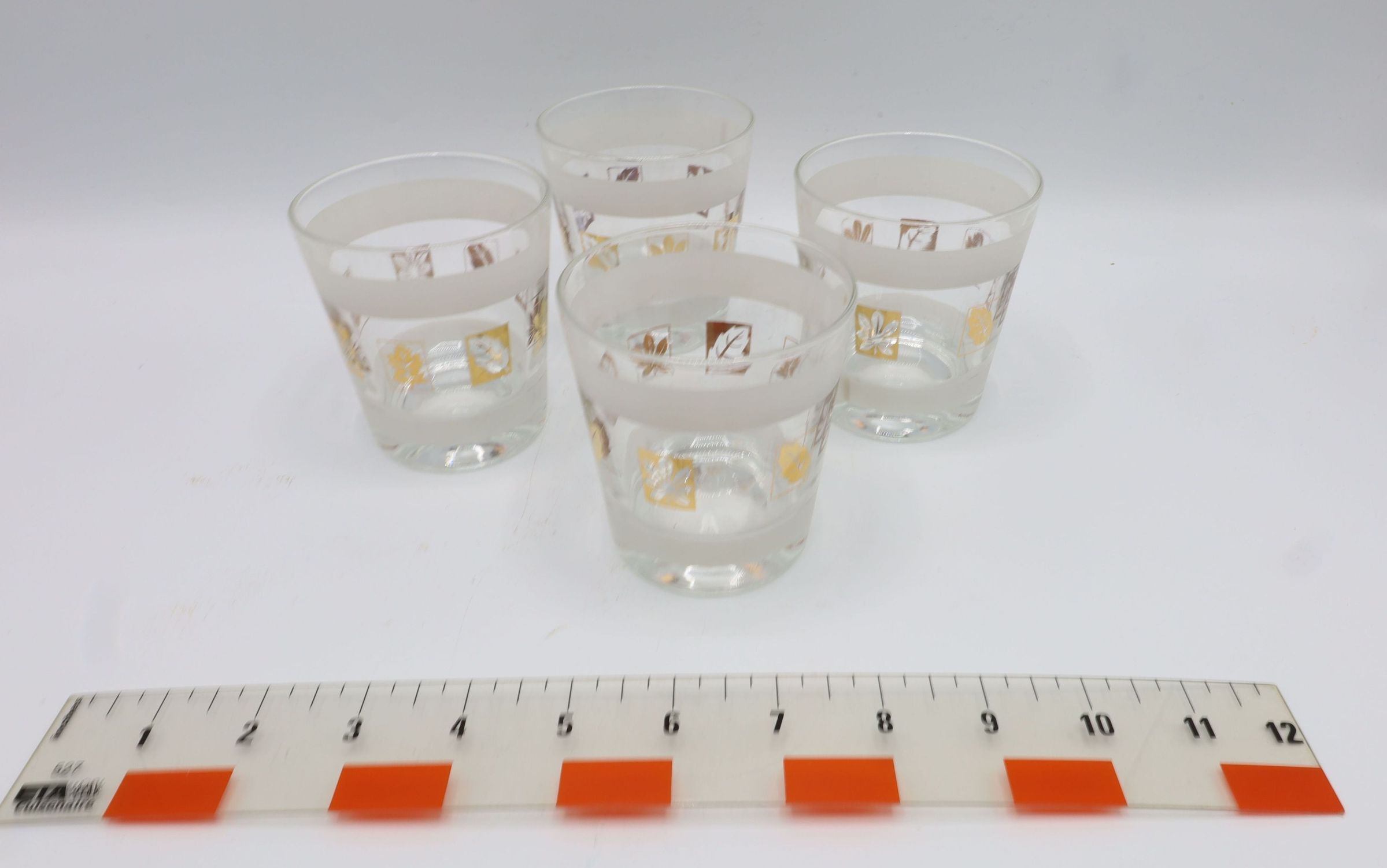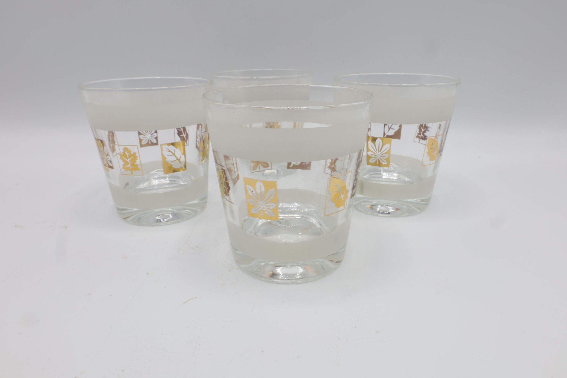 Set of four E-Z Por golden frost pattern glasses. The glasses feature both frosted sections and a gold leaf design.