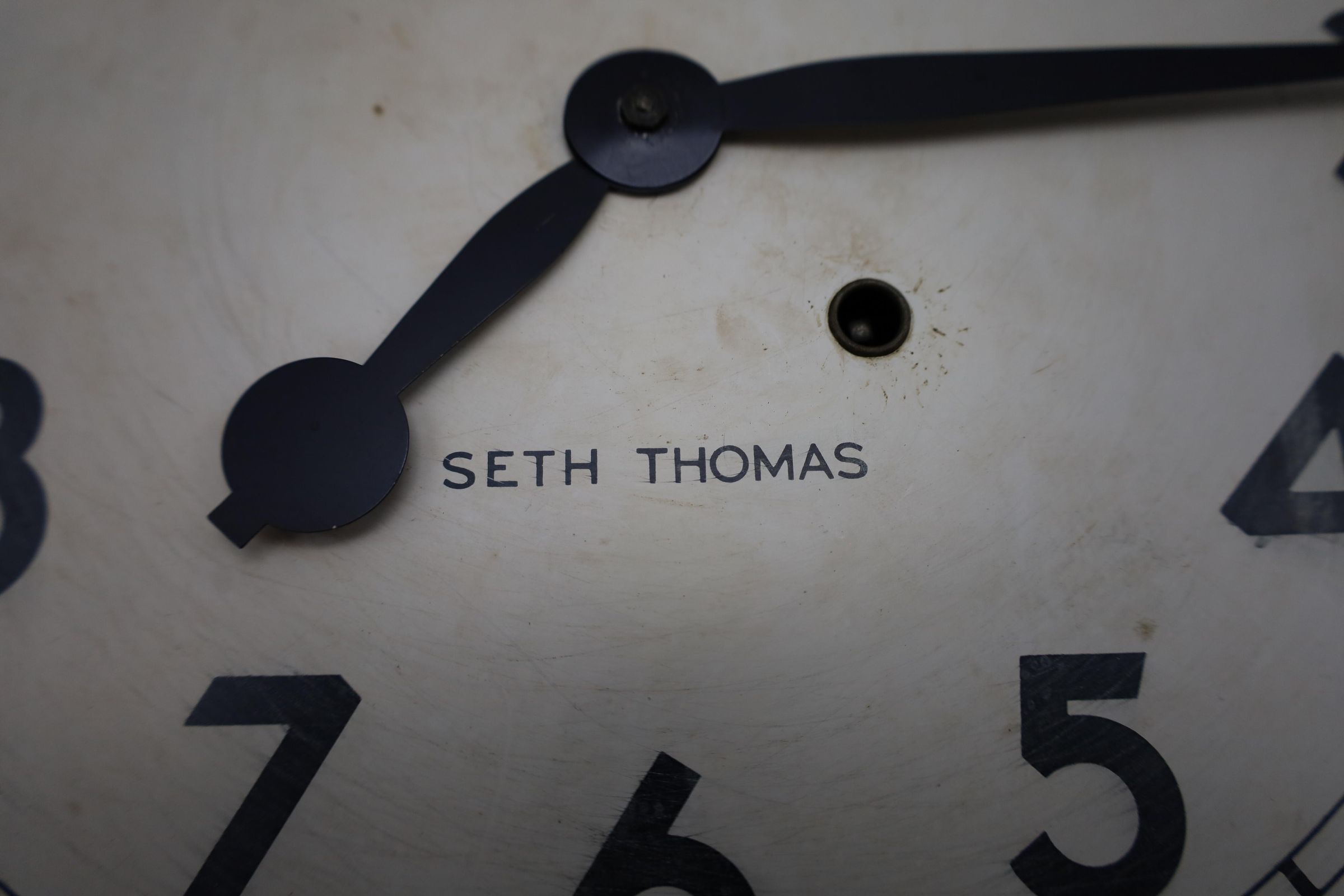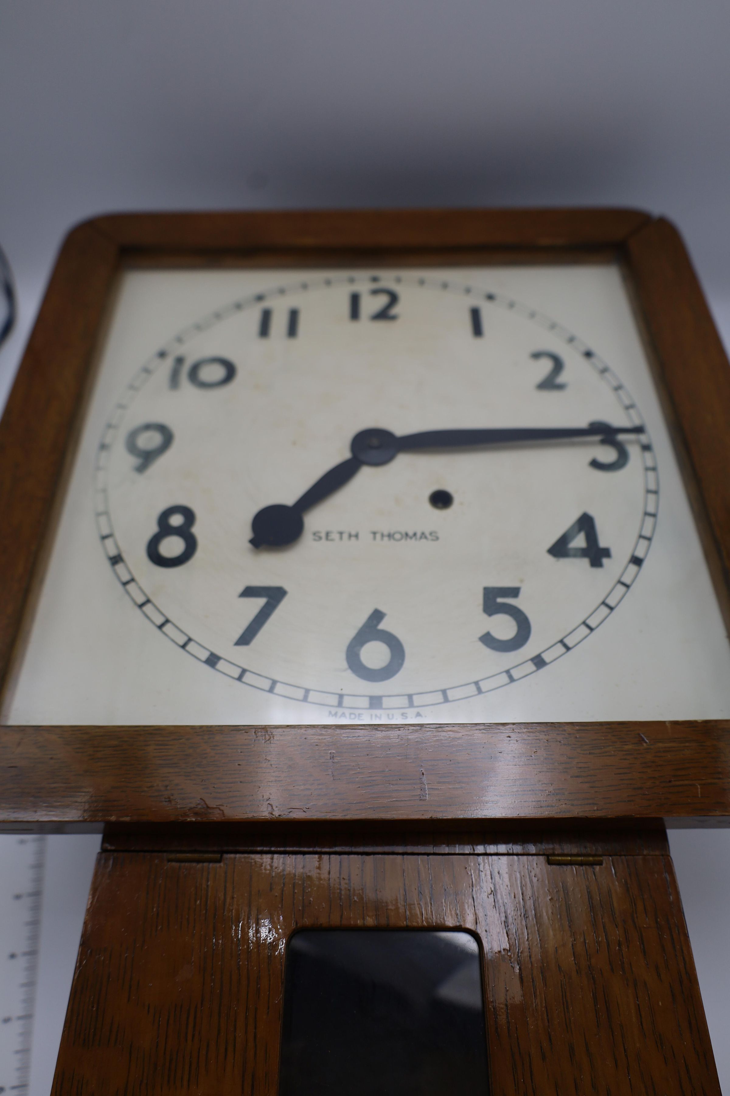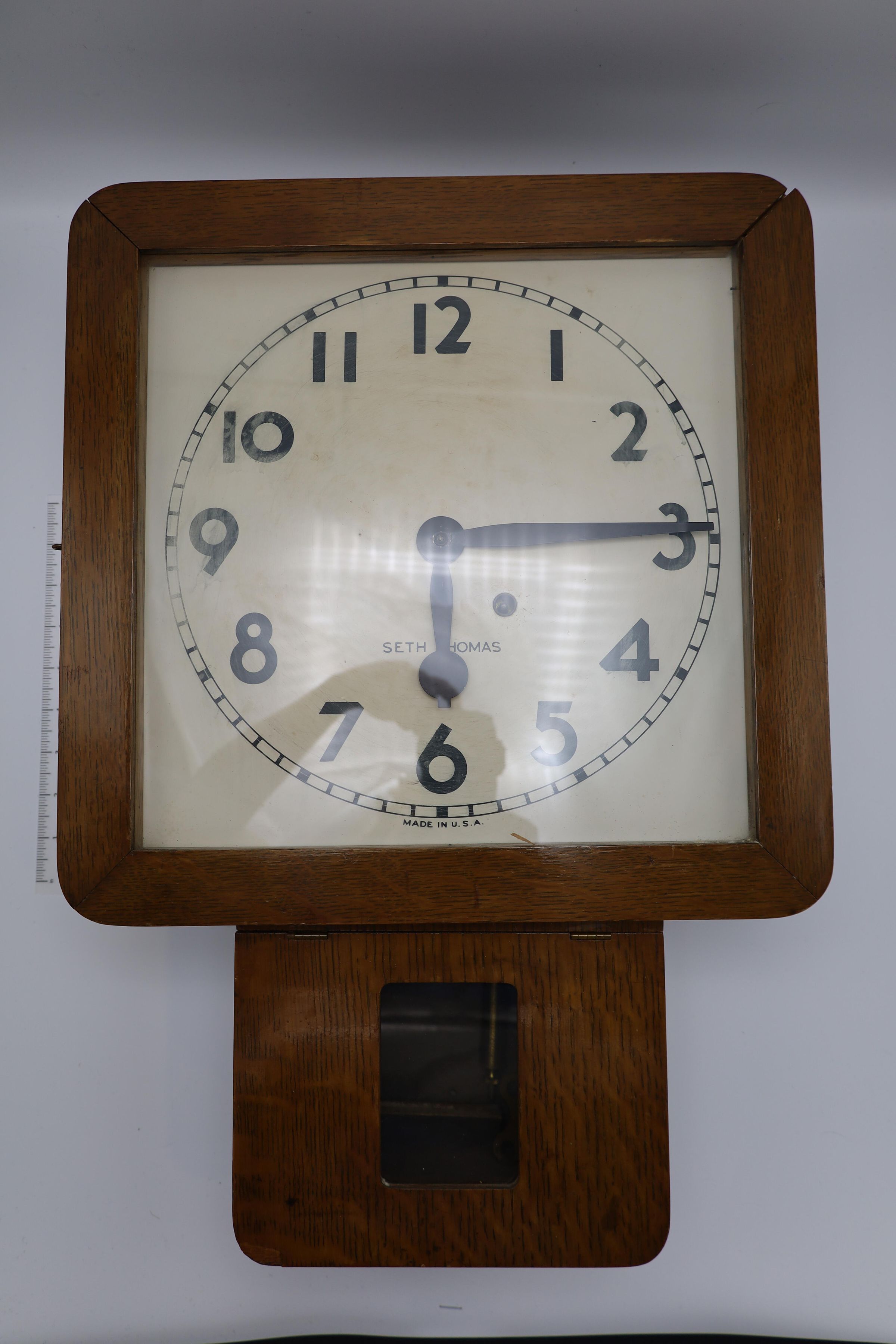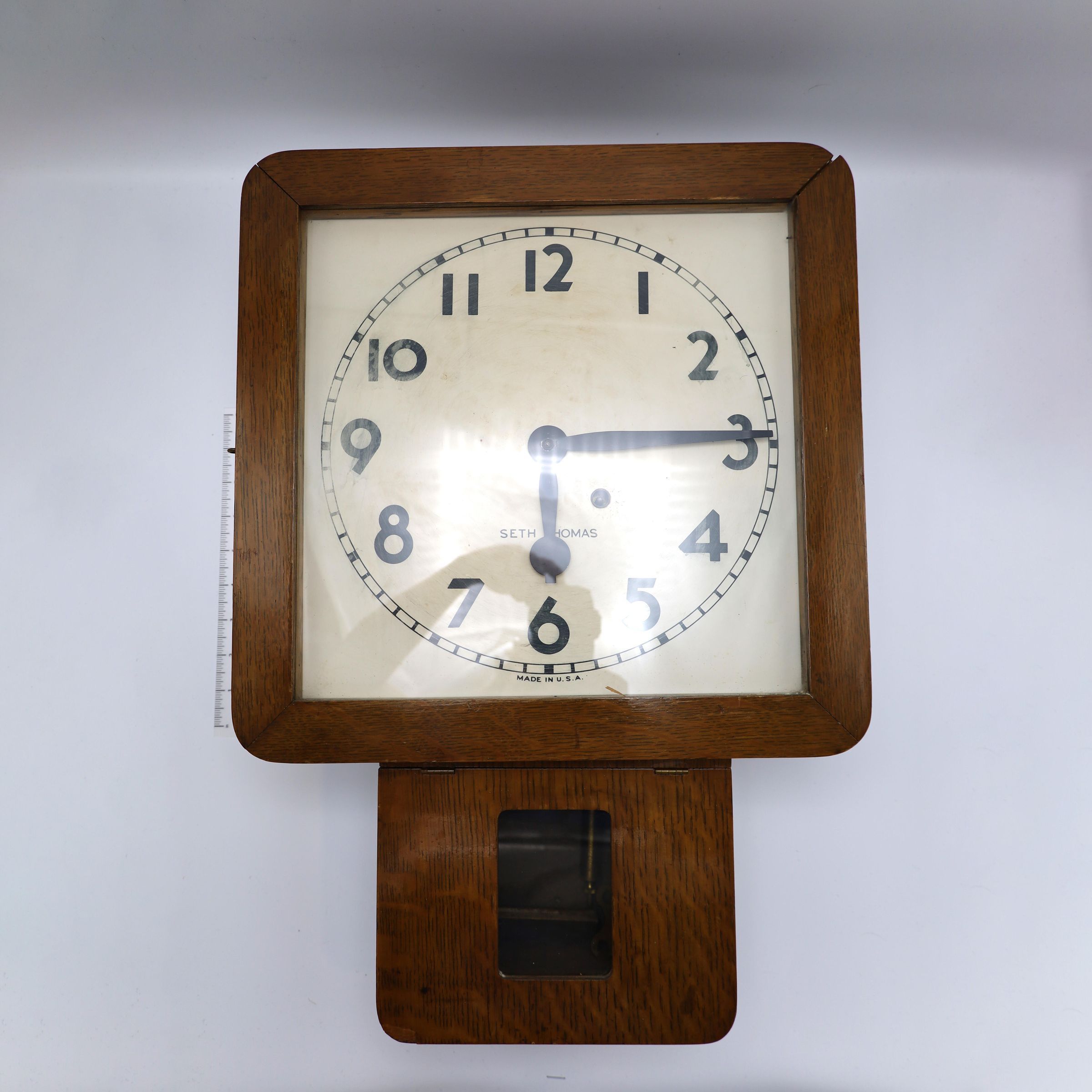 This is a wooden wall clock from The Seth Thomas Clock Co. The Seth Thomas Clock Co. was founded by Seth Thomas and began producing timepieces in 1813. It was incorporated as the "Seth Thomas Clock Company" in 1853. The company manufactured clock movements for the Self Winding Clock Company from 1886 thru the early 1890s, in addition to its standard offering of longcase clocks, mantel, wall, and table-top clocks.Location