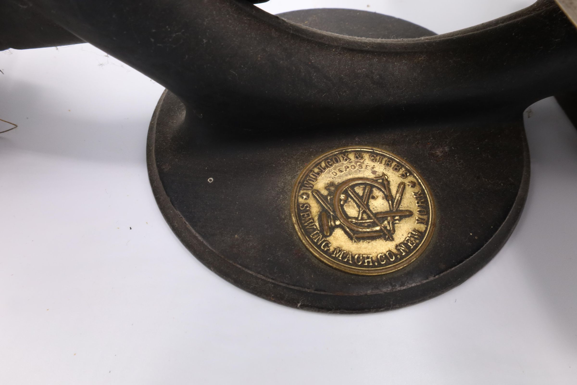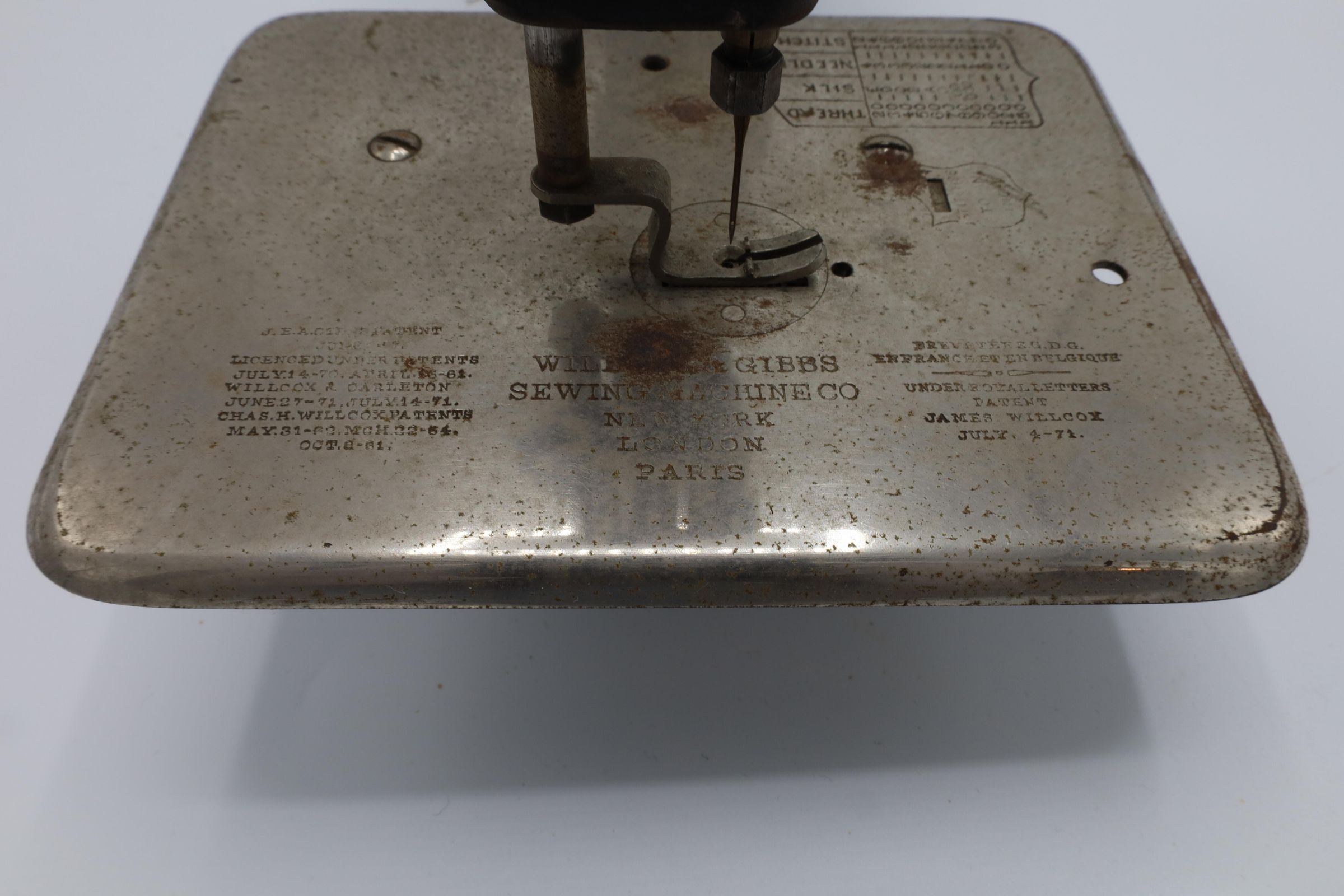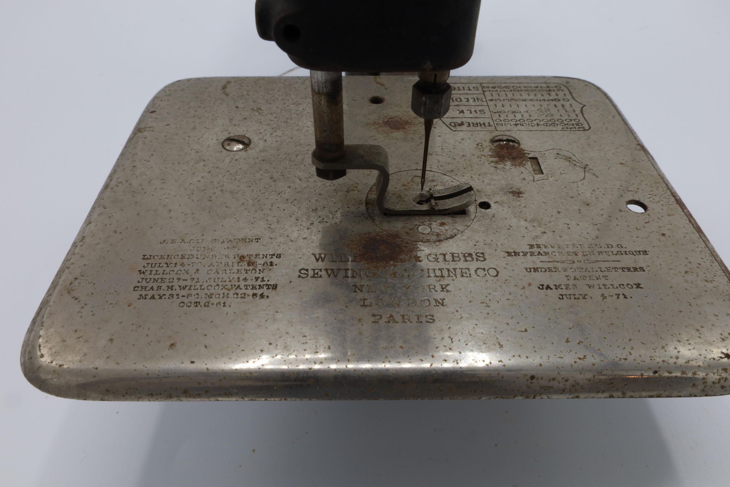 This sewing machine was manufactured in the late 19th century by Willcox & Gibbs Sewing Machine Company in New York City. It is cast iron and has a graceful arched shape that forms the letter "G" for Gibbs.Location