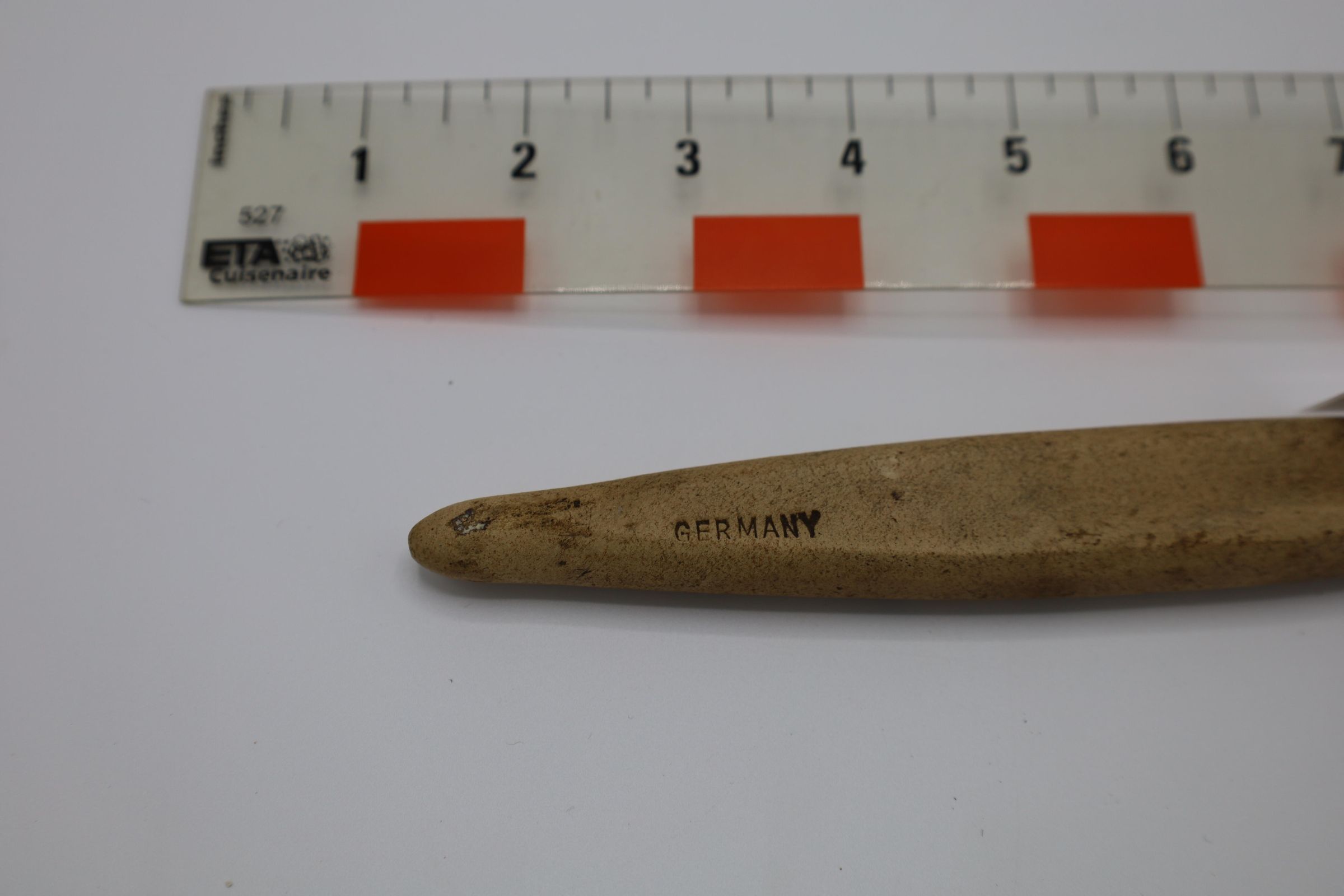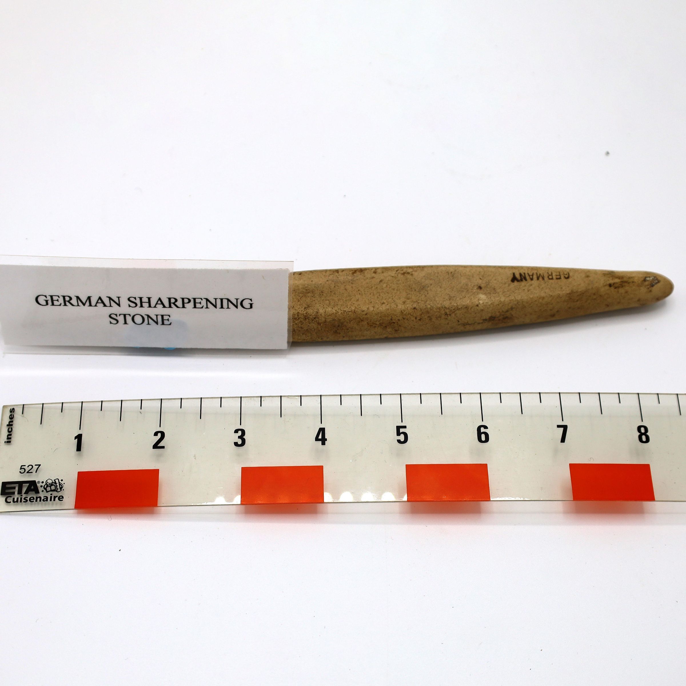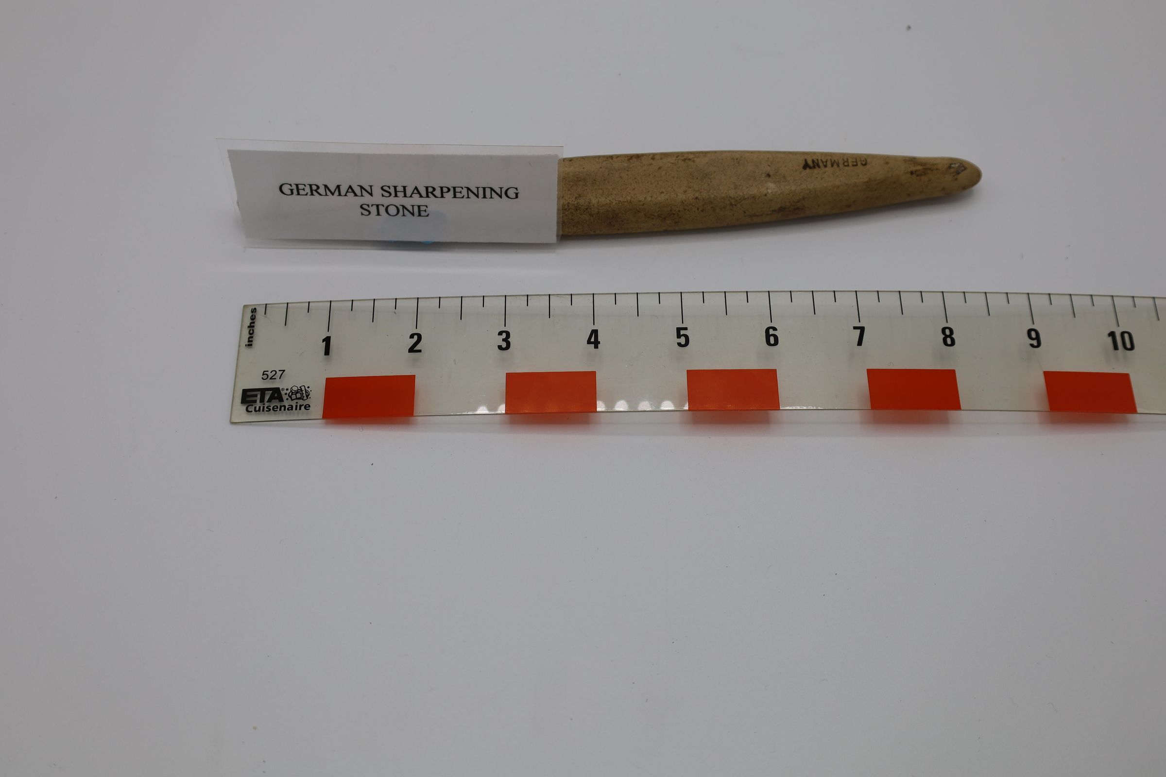 This German-made sharpening stone has a dark tan color and an elongated oval shape. It was likely used for re-sharpening knives, razors, or even scythes.Location
