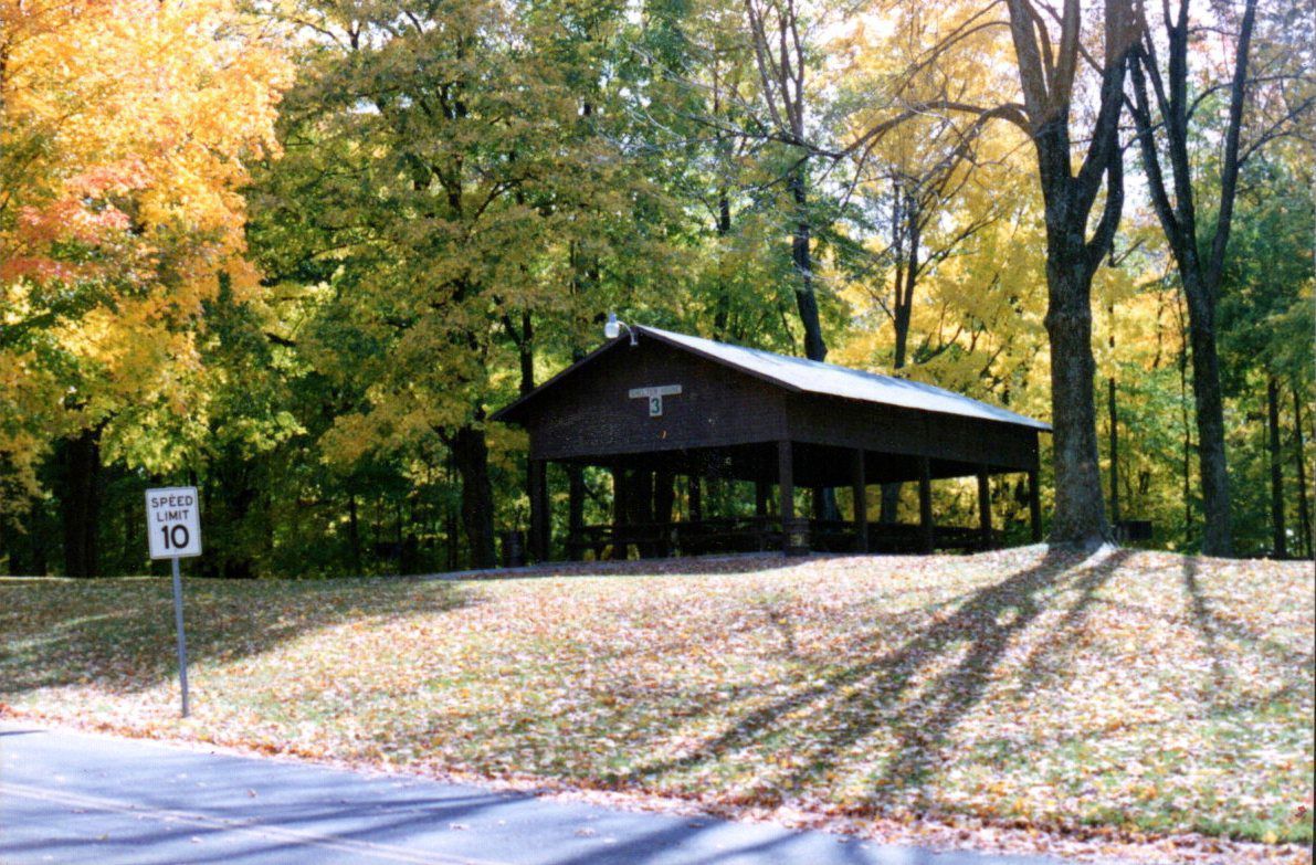 Picnic Shelter 3 at Mt. Gilead State Park stands underneath a grove of trees whose leaves are donning the brilliant yellow and red hues of autumn.
