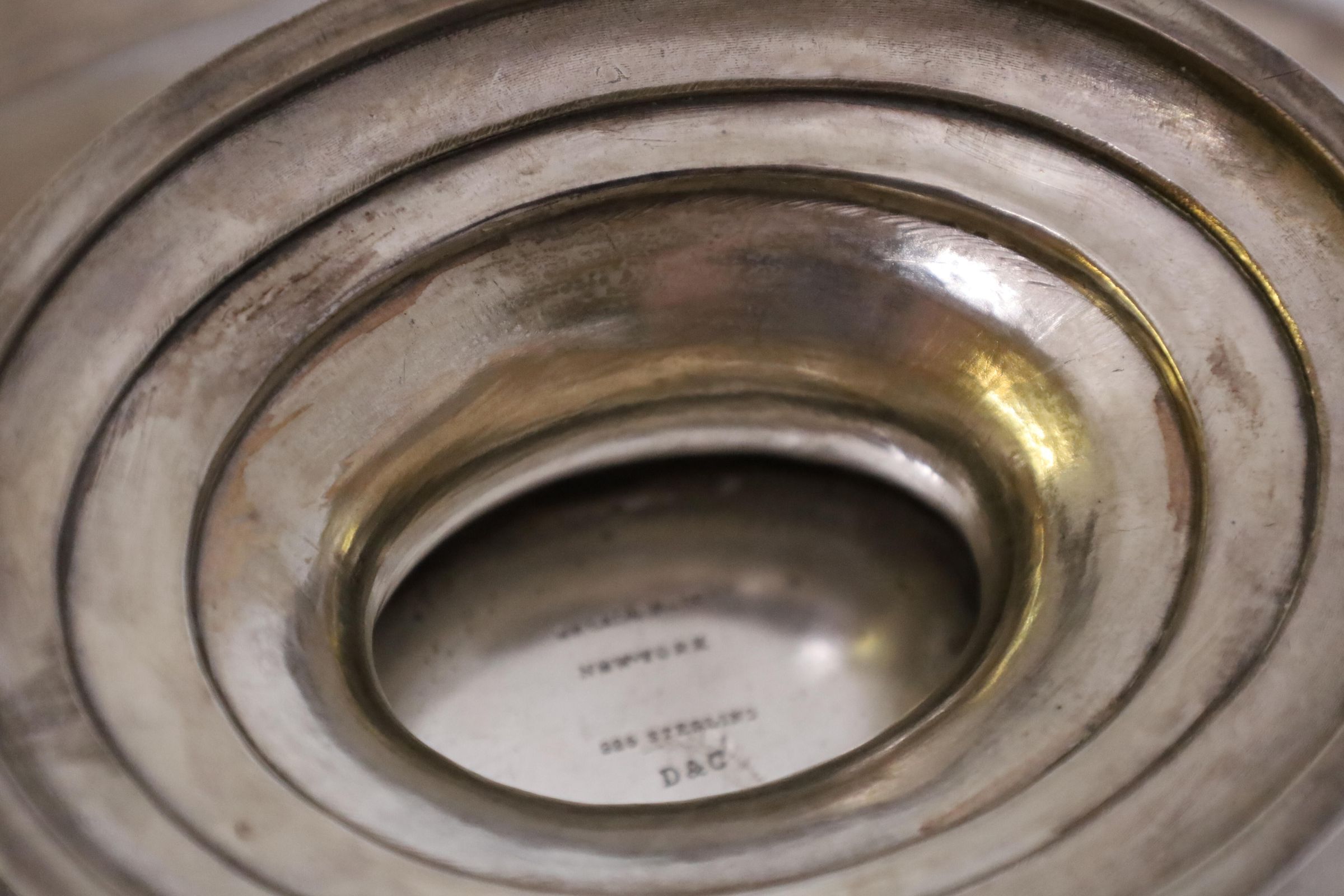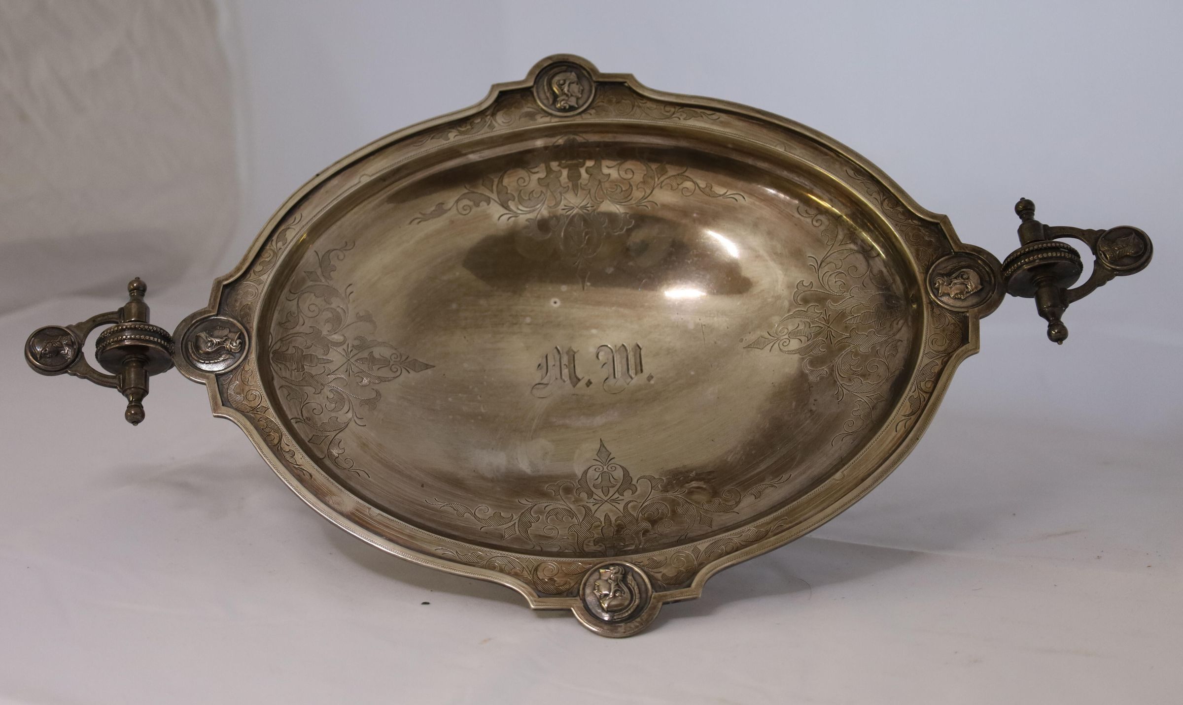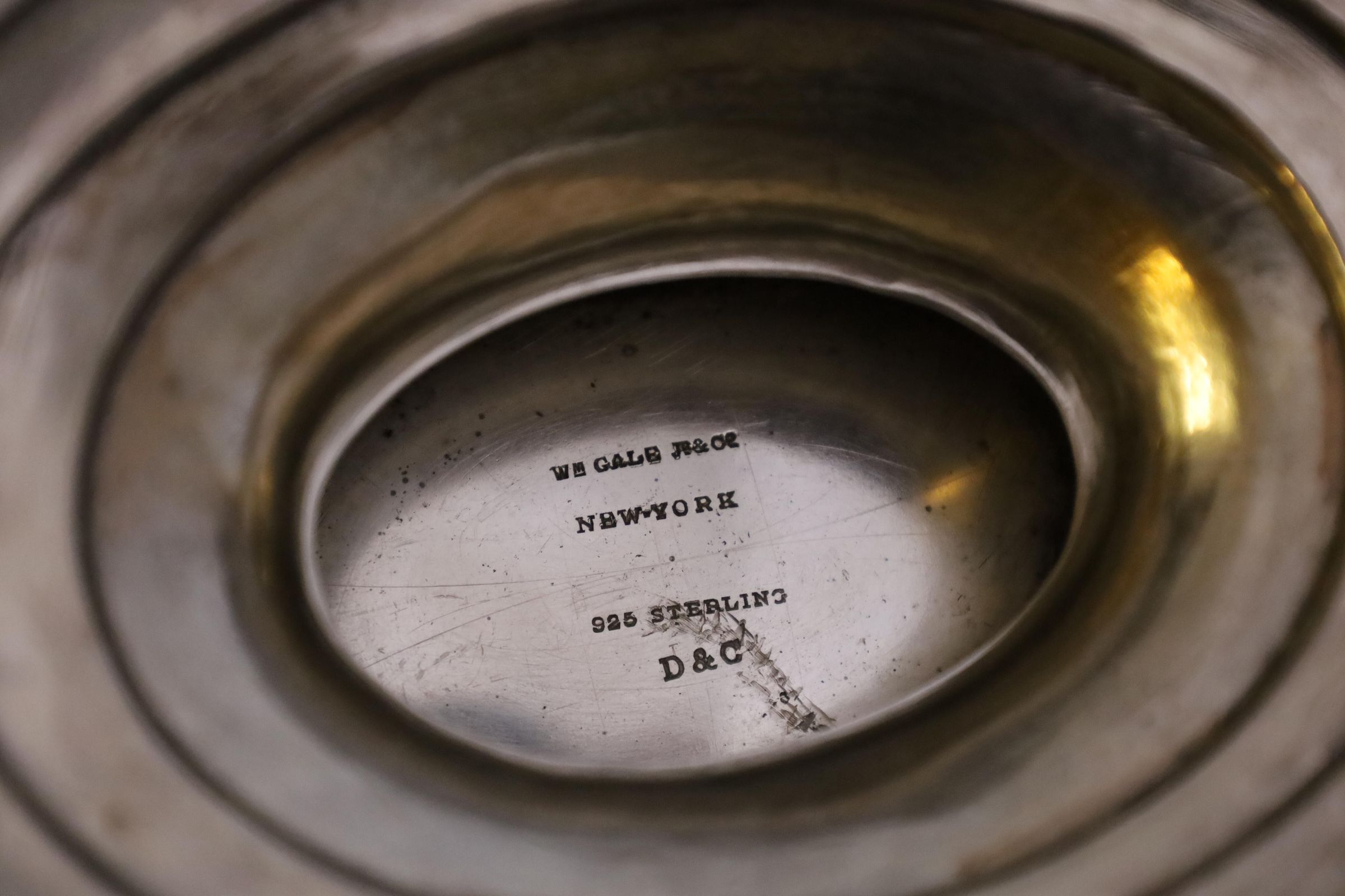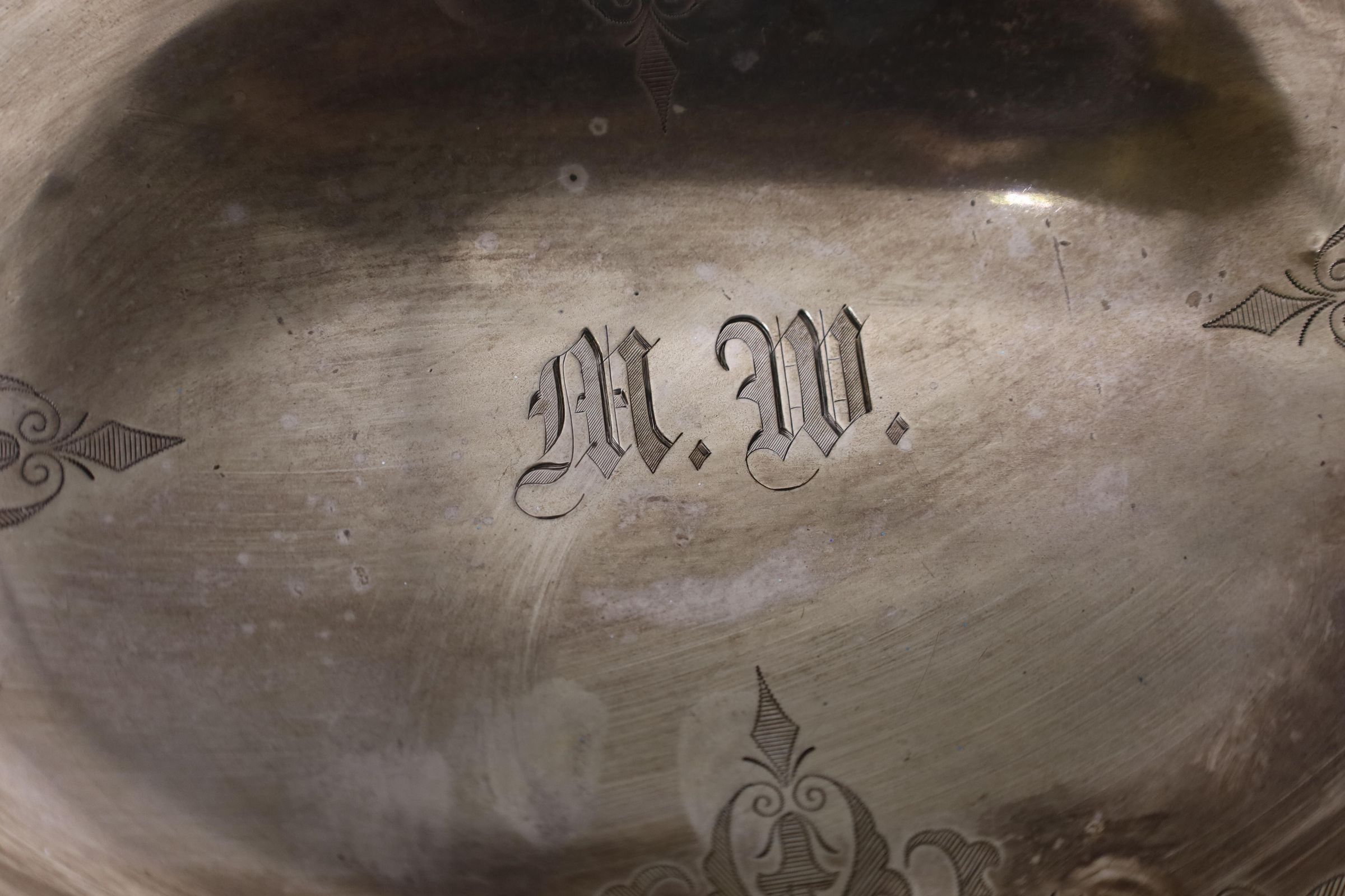 The dish is stamped on the bottom with Wm. Gale Jr & Co New York. William Gale's silversmithing company went through many iterations between 1822-1872. The Wm. Gale Jr. & Co stamp can be traced to a period from 1867-1868, long before Mary Appleton Wood's birth in1892. The initials may have been added after the dish was bought, or it may be referring to another member of the Wood family.Location
