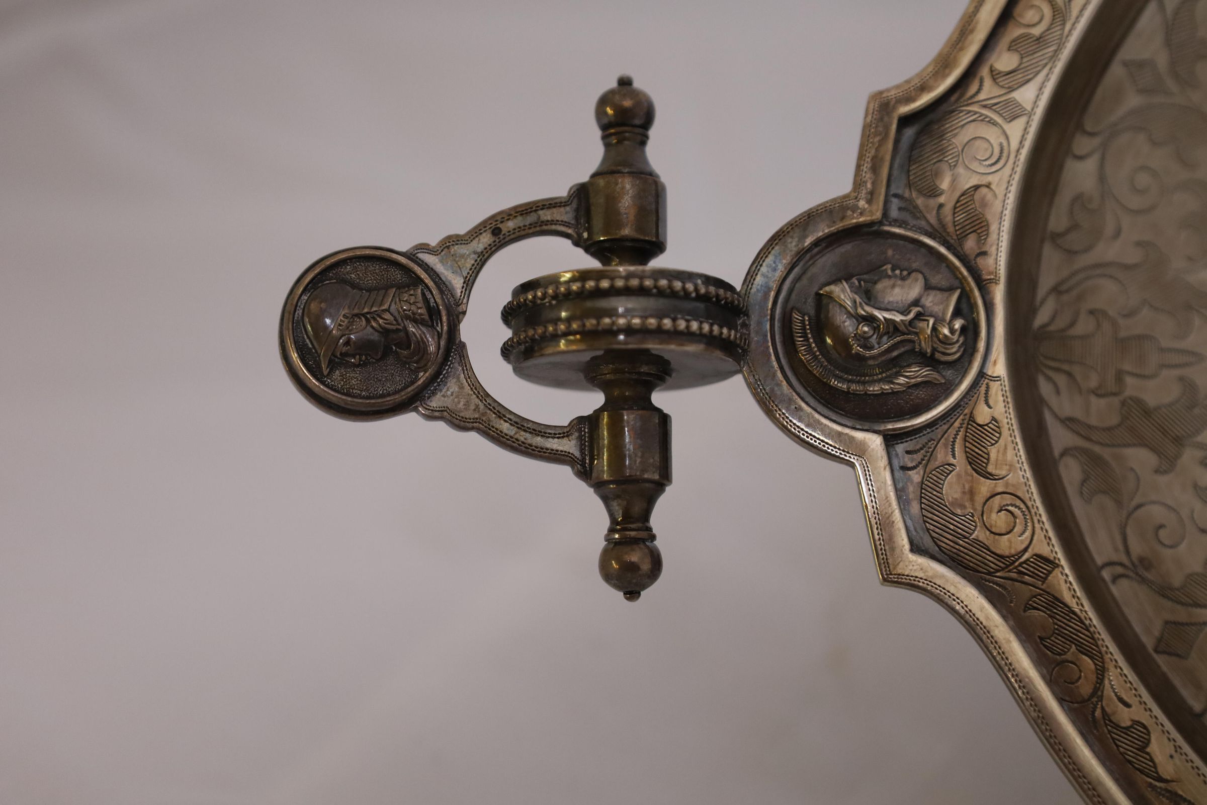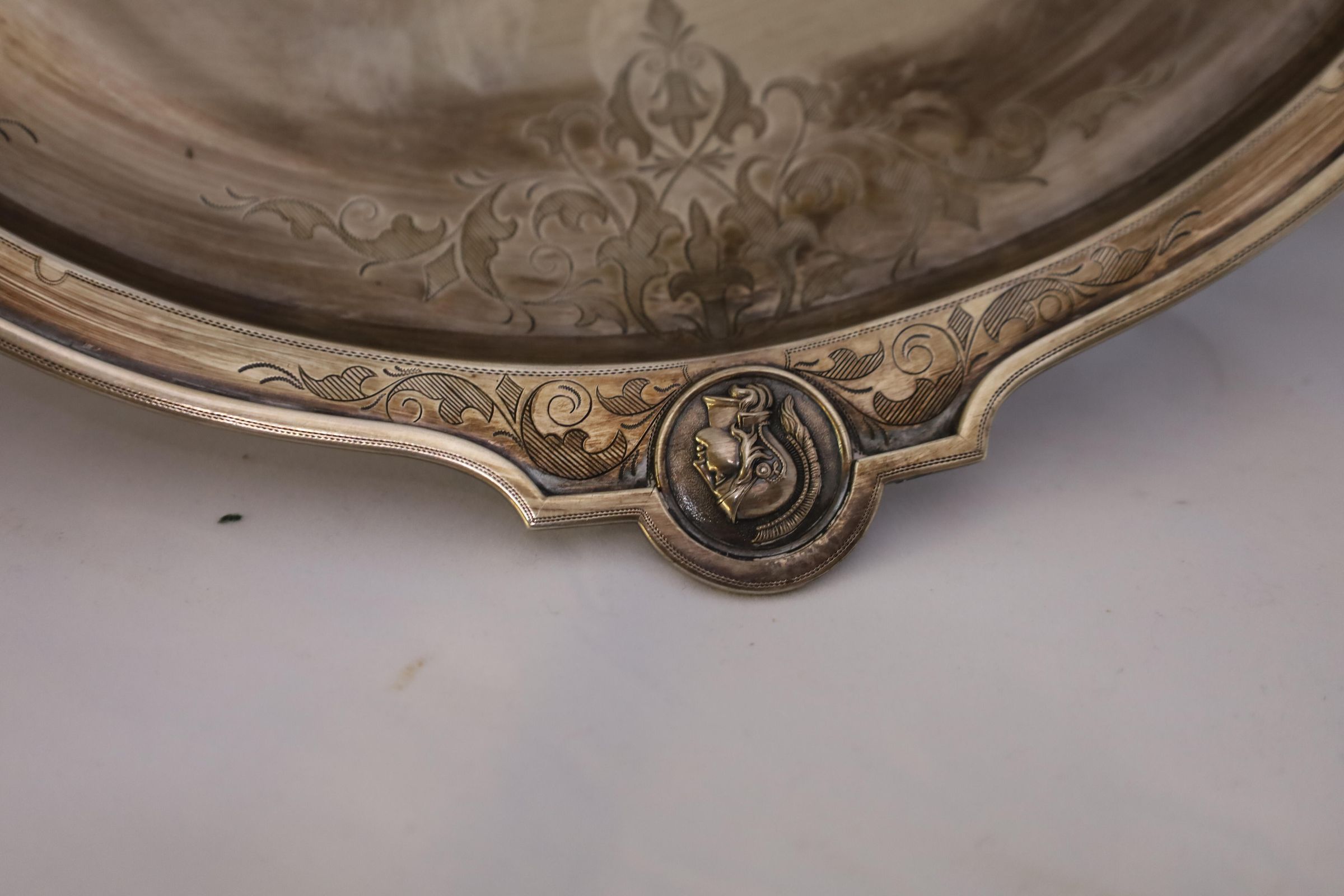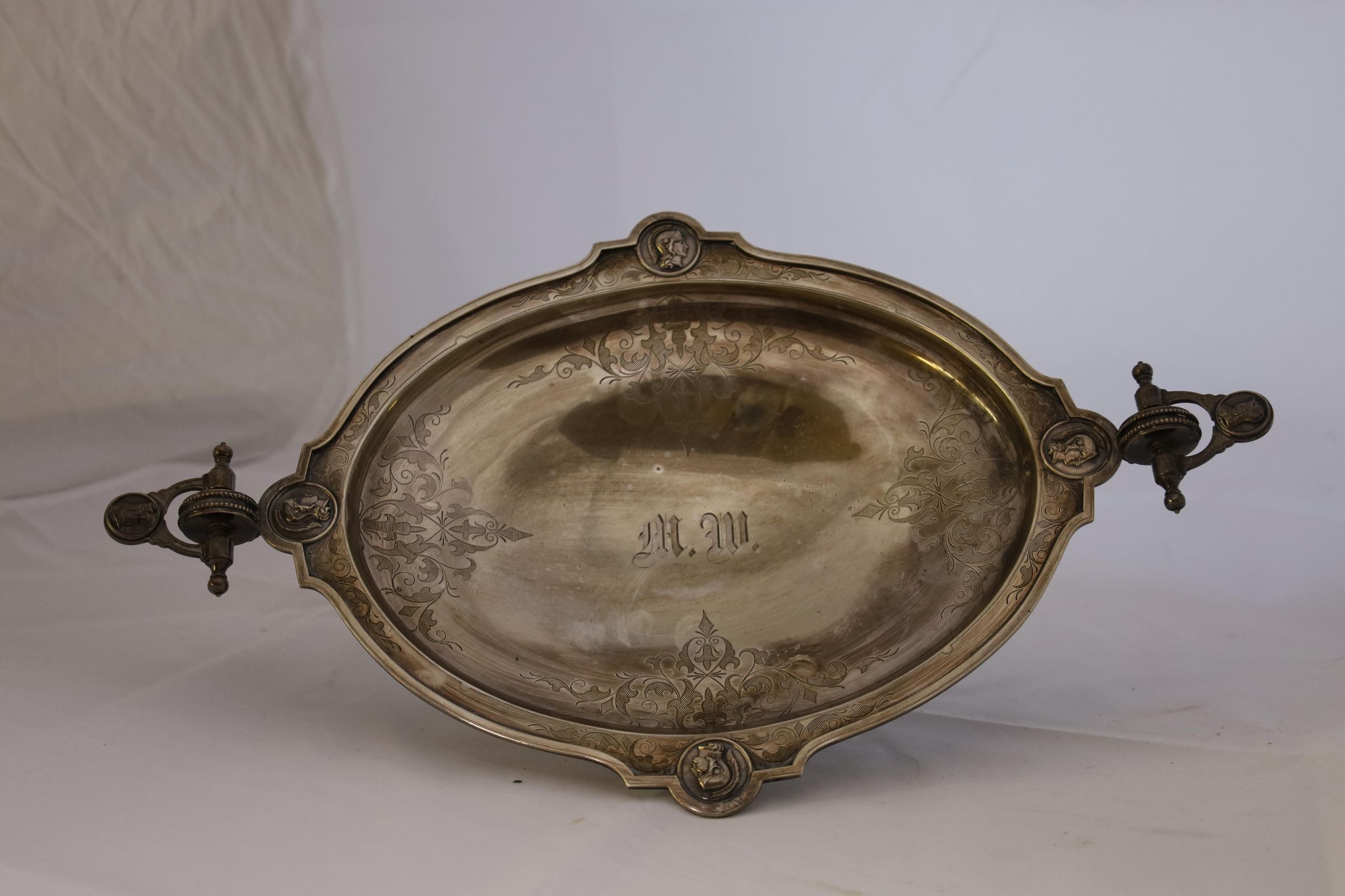 This sterling silver dish features four Roman soldier medallions and a decorative leaf etching pattern along the edges. M.W. is engraved in the middle of the dish, which refers to Mary Appleton Wood, Louis Bromfield's wife.