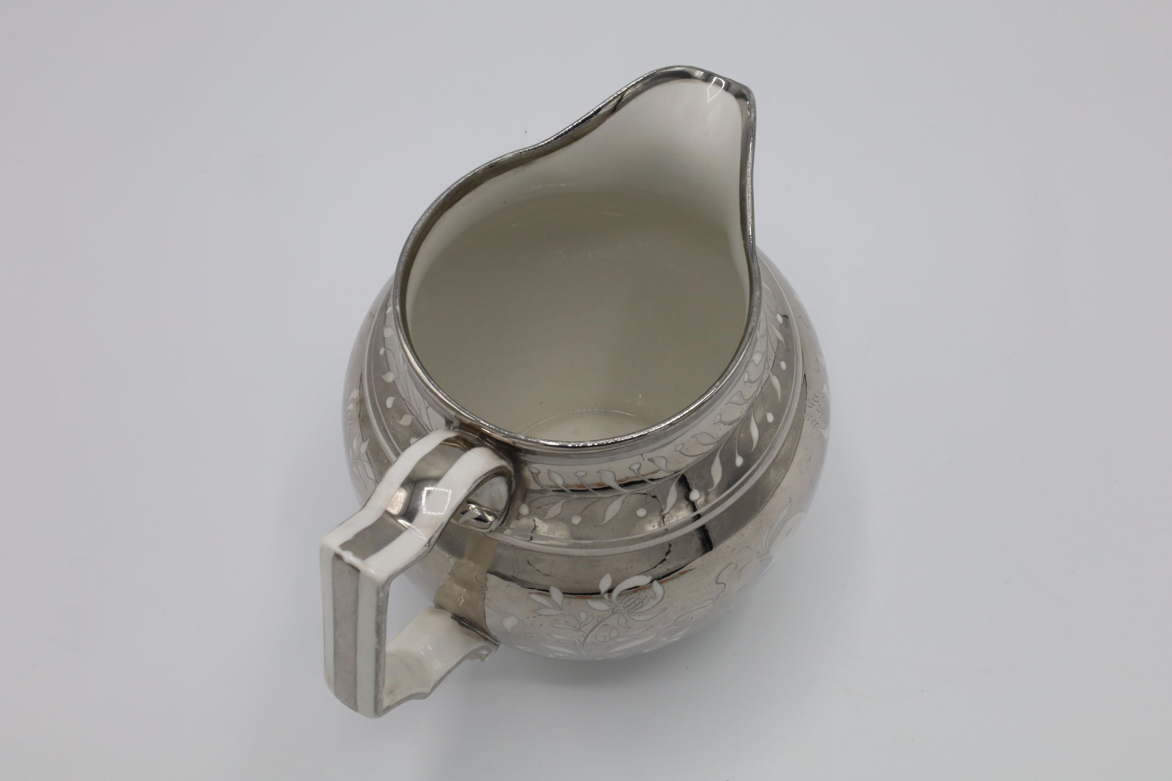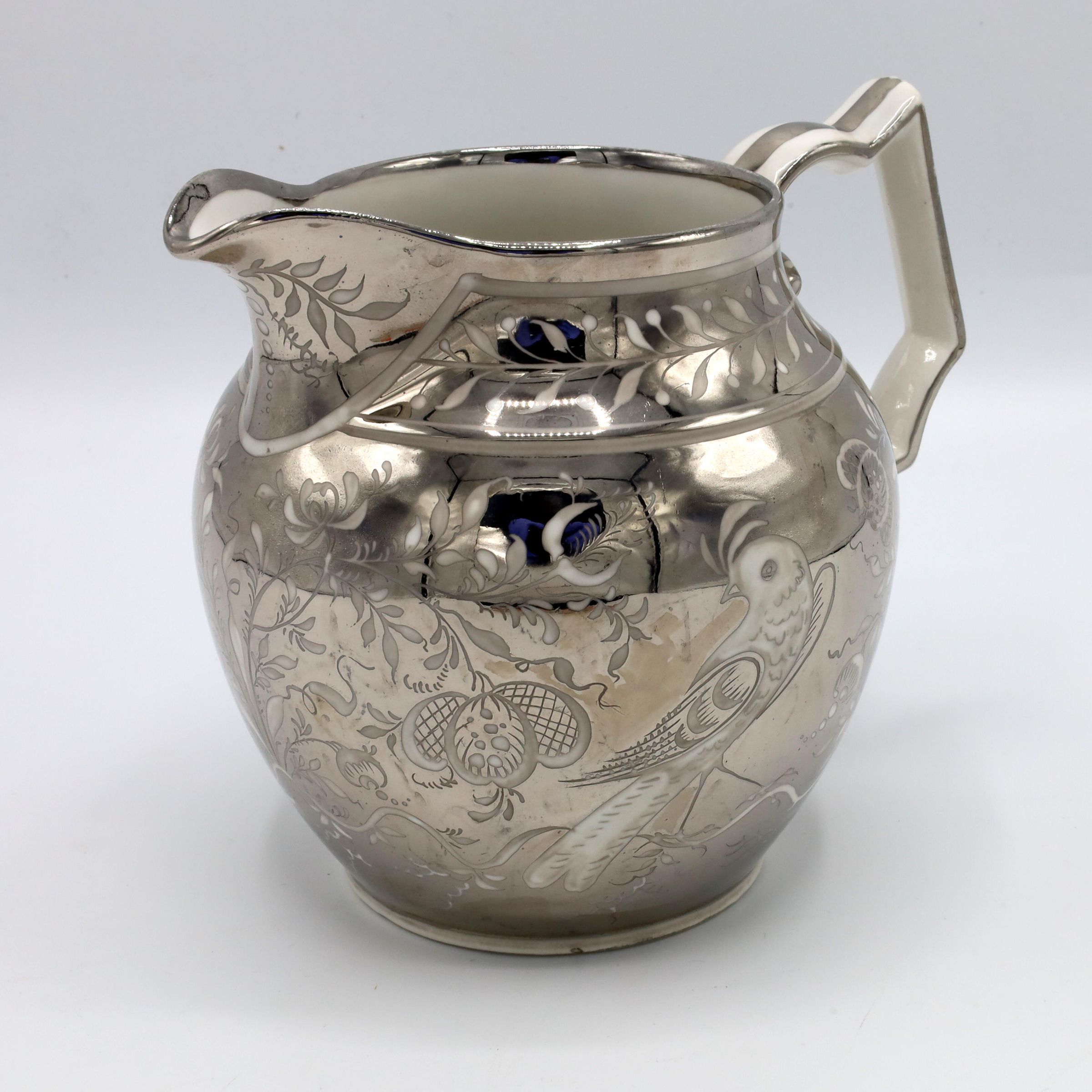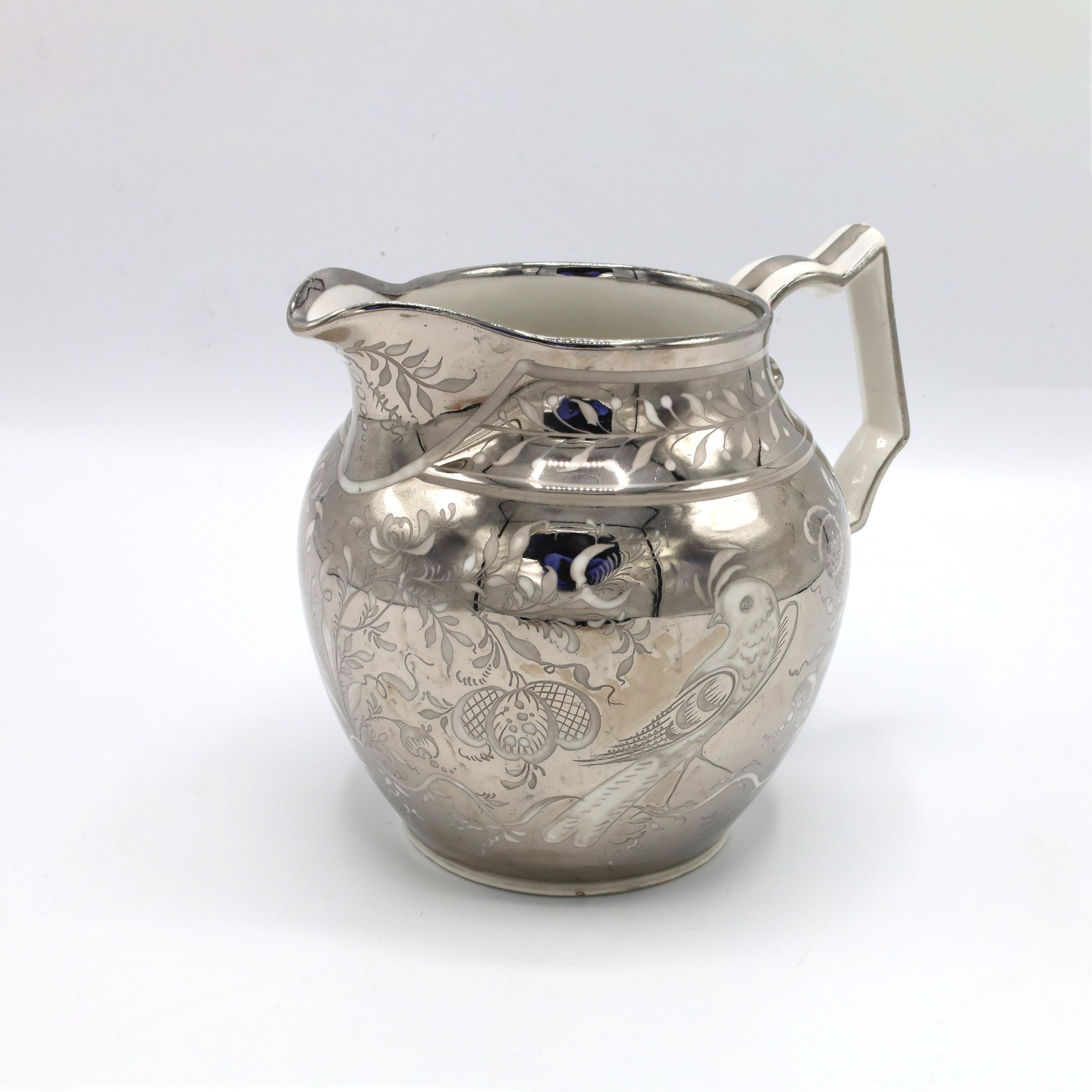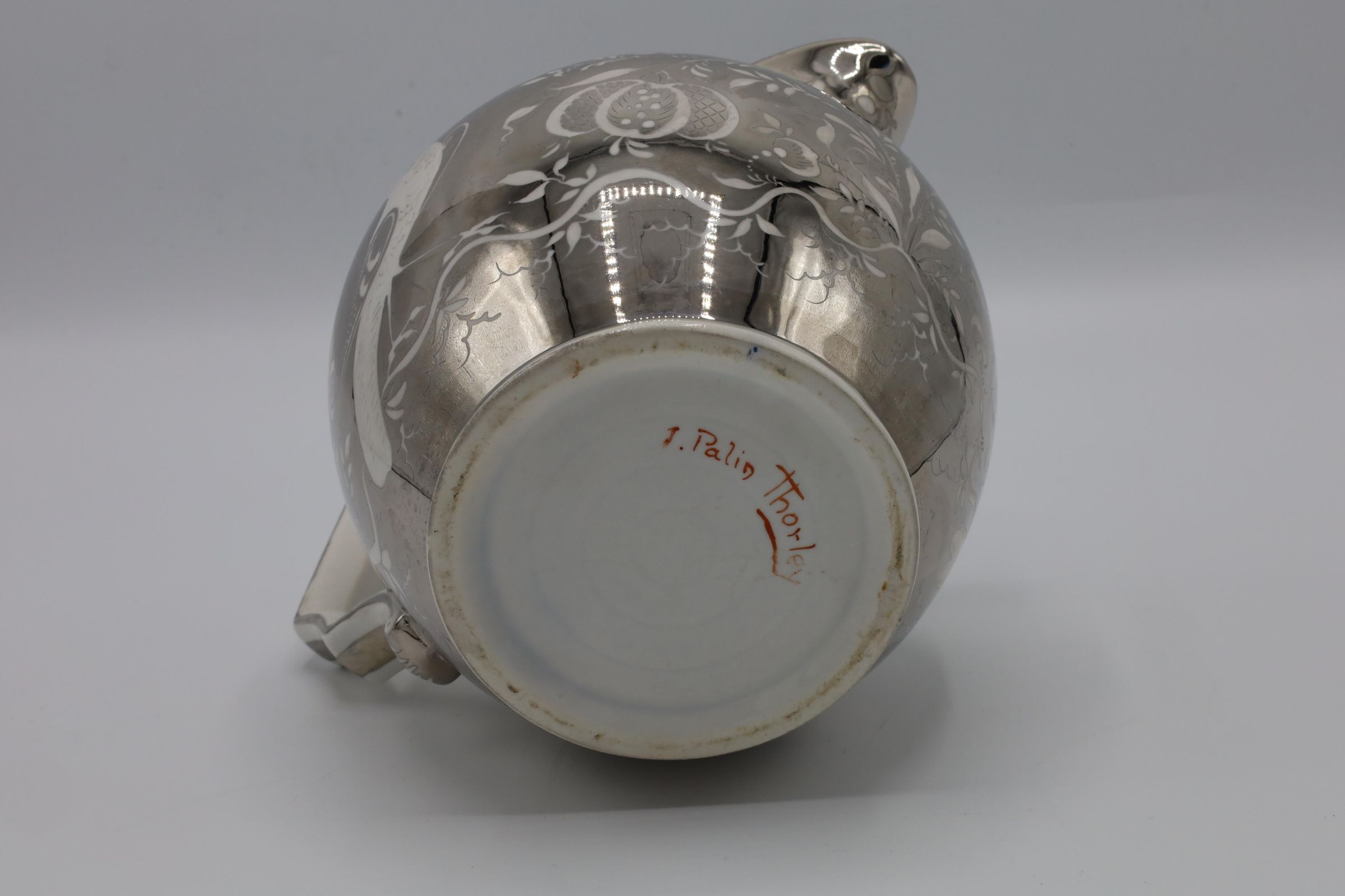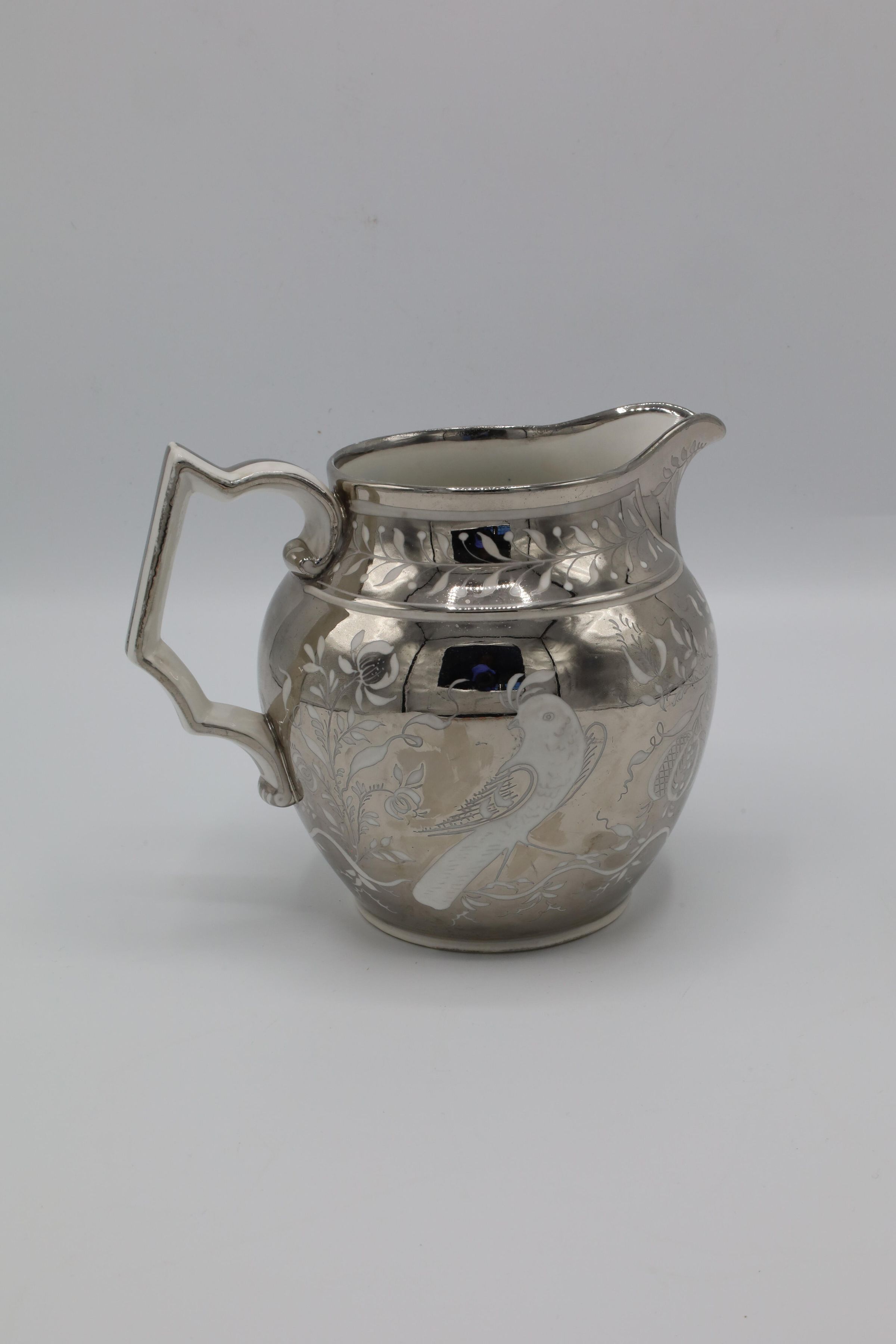 This is a silver luster ceramic creamer, circa 1960-1970, with a songbird design surrounded by vines, leaves, and flowers. The artist's mark "J. Palin Thorley" is signed on the bottom of the creamer.Context