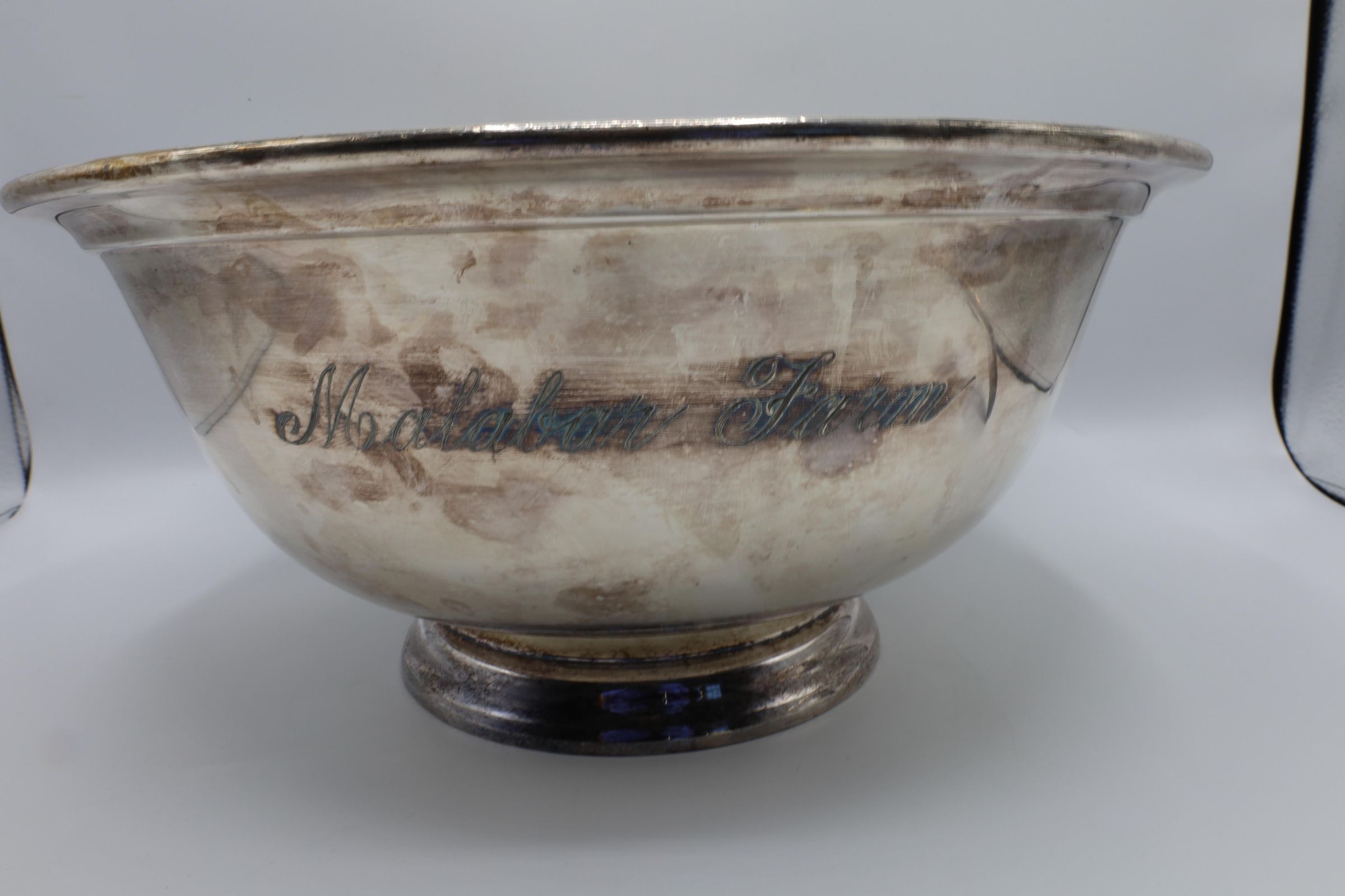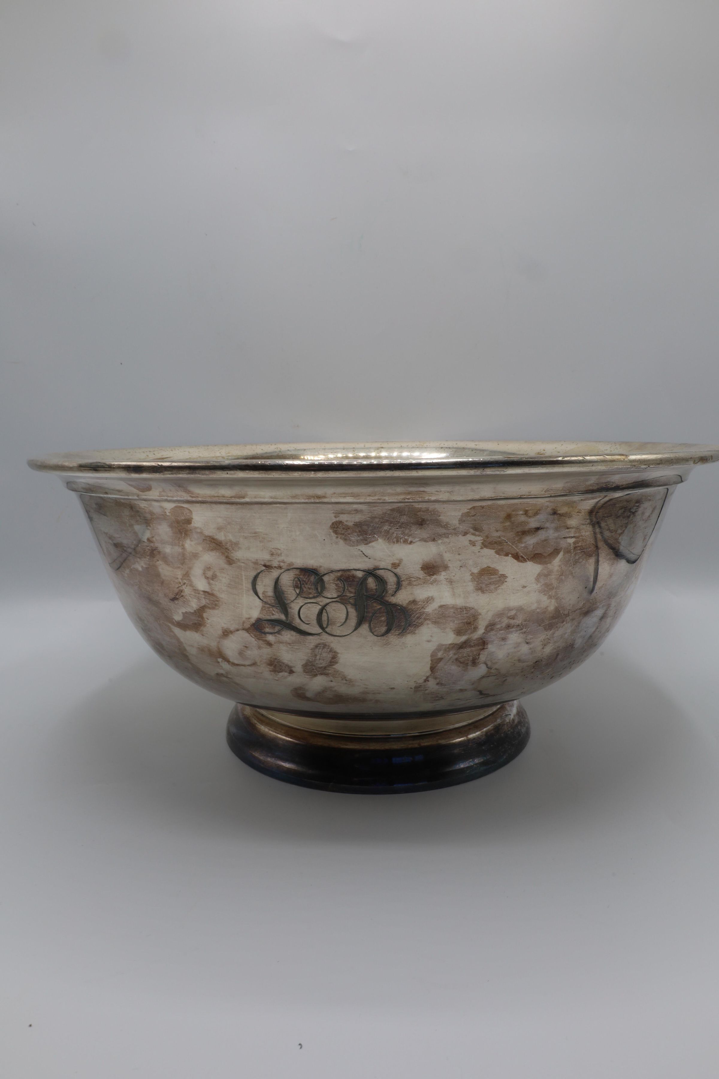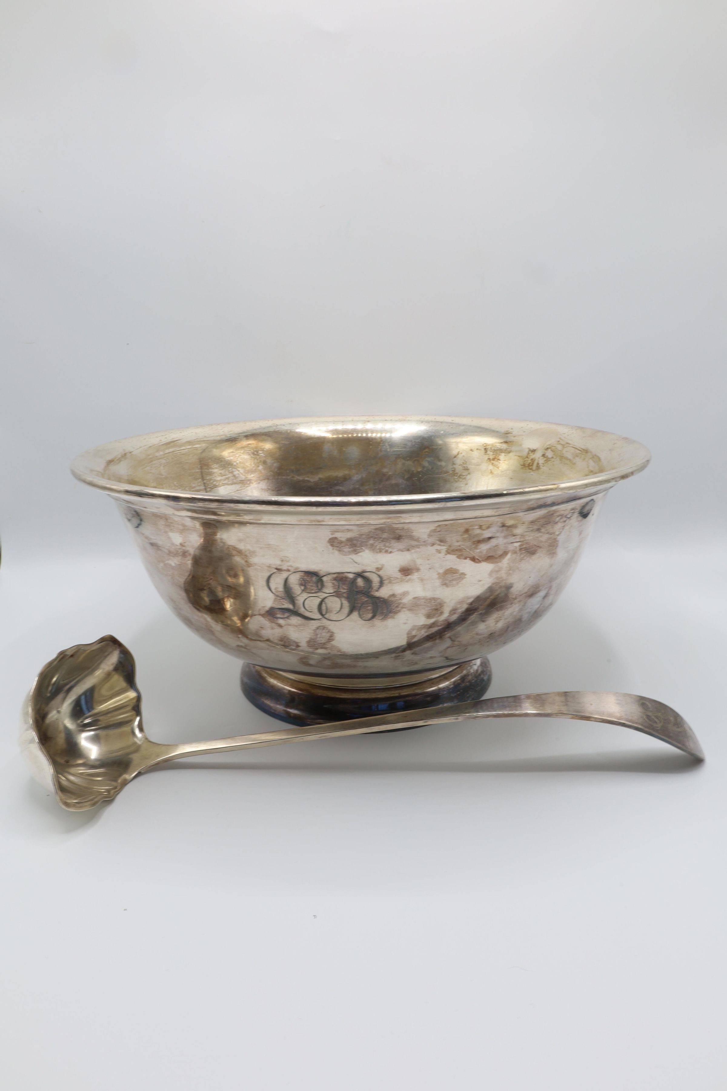 This is a Reed & Barton silverplate punchbowl with a matching ladle. The bowl is engraved with "Malabar Farm" on one side and on the opposite side as a monogrammed "L.B.," which stands for Louis Bromfield. In addition, there are silver hallmarks on the bottom of the bowl that consist of a flower symbol and the number 108. The top of the ladle handle is also monogrammed with "L.B."