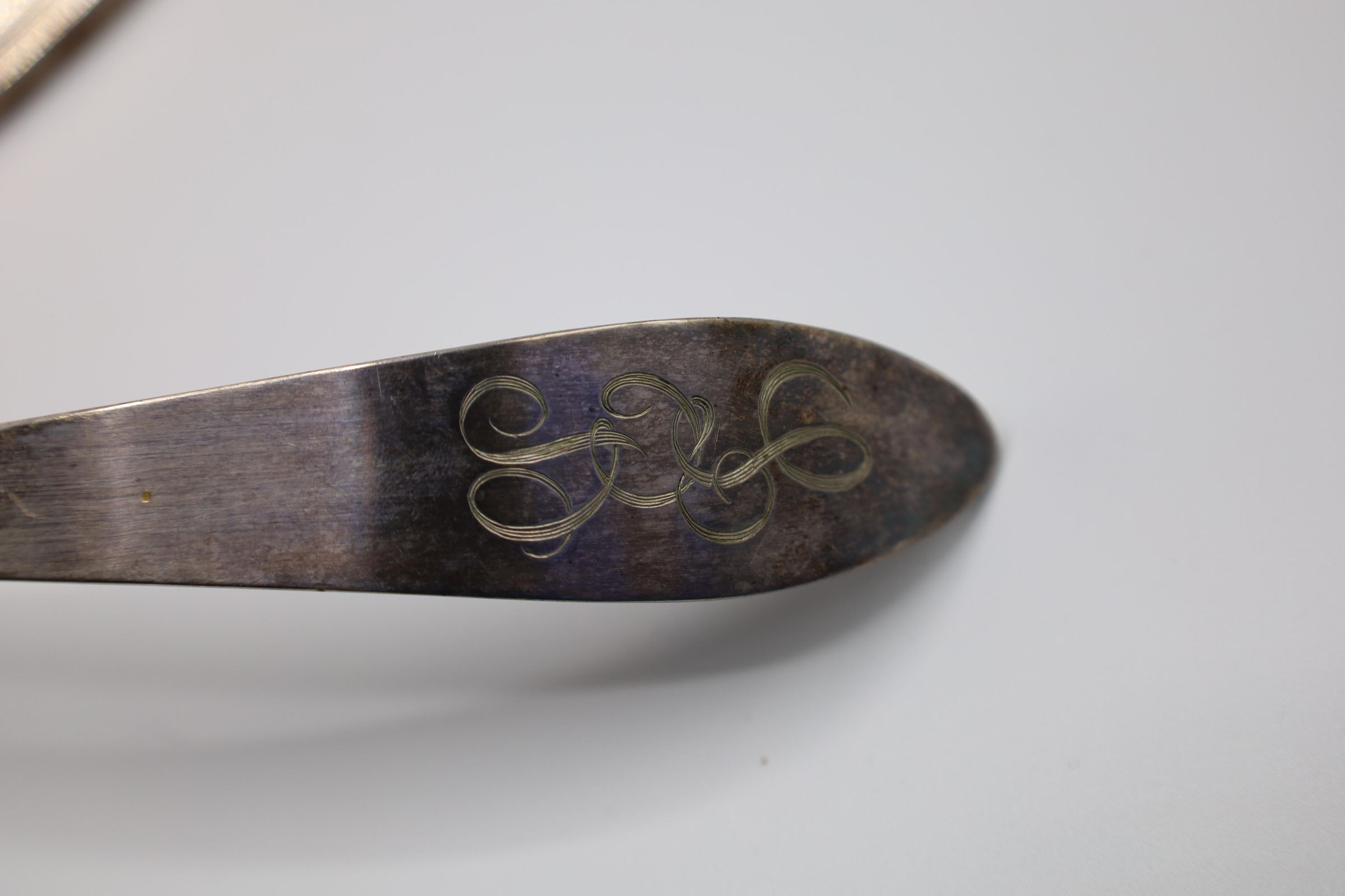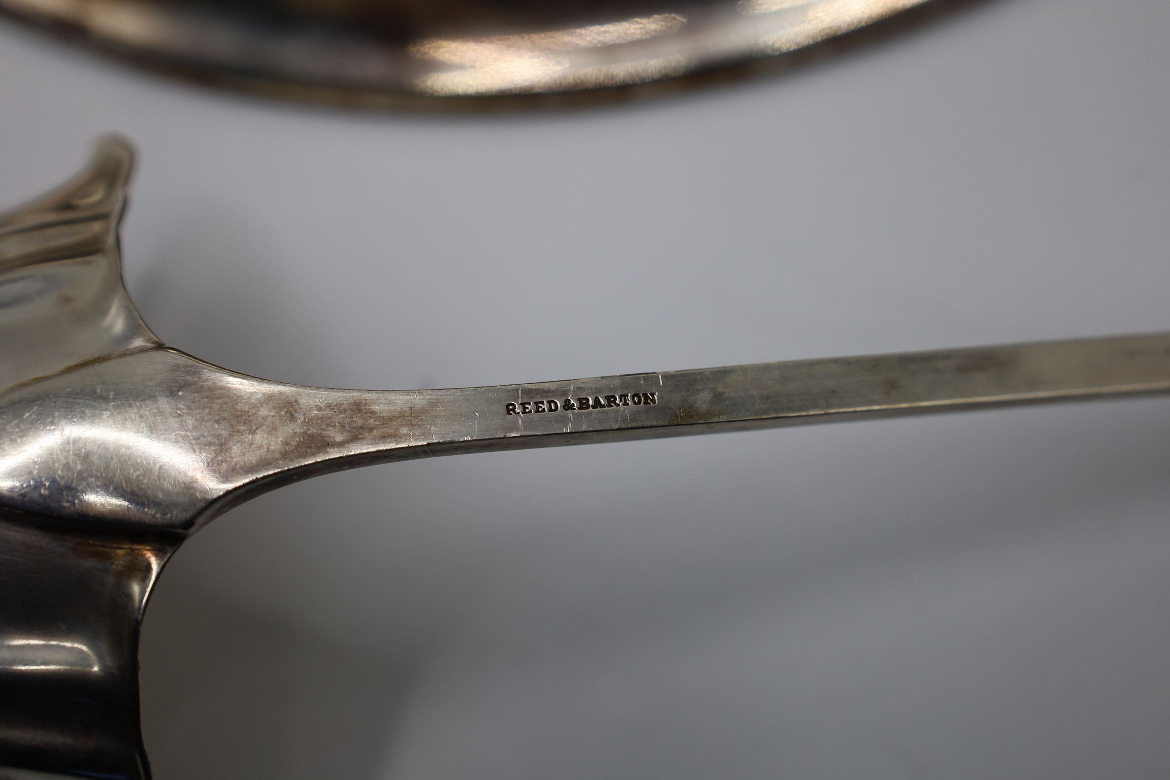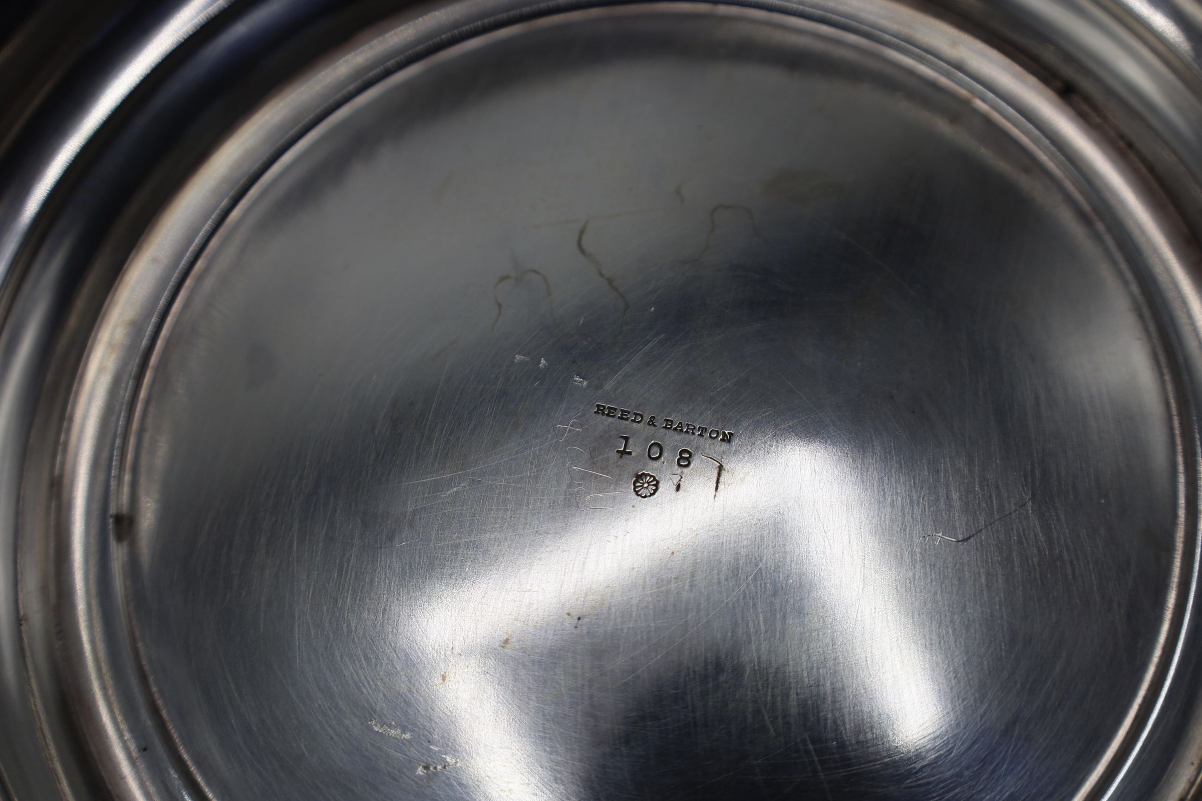 This is a Reed & Barton silverplate punchbowl with a matching ladle. The bowl is engraved with "Malabar Farm" on one side and on the opposite side as a monogrammed "L.B.," which stands for Louis Bromfield. In addition, there are silver hallmarks on the bottom of the bowl that consist of a flower symbol and the number 108. The top of the ladle handle is also monogrammed with "L.B."
