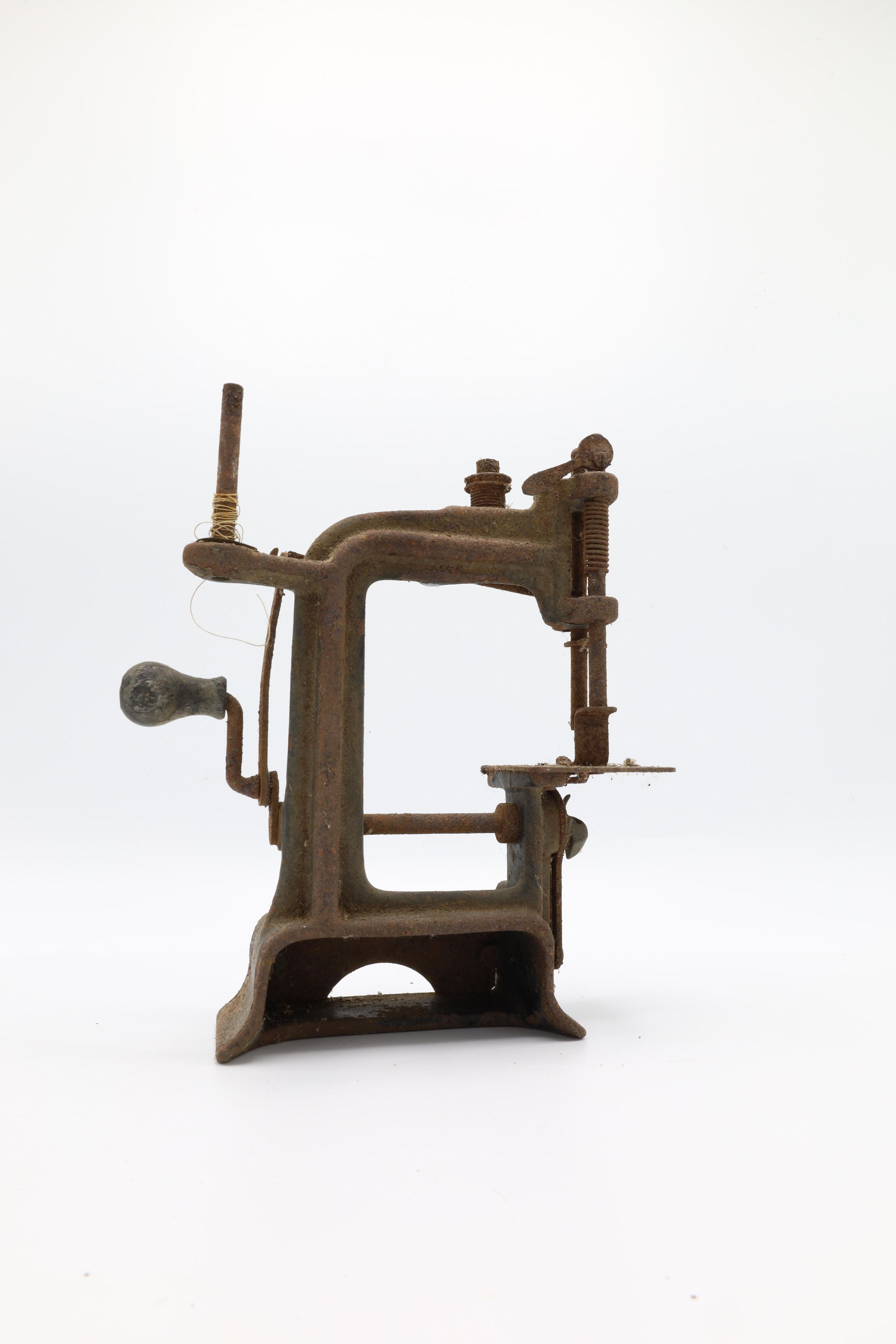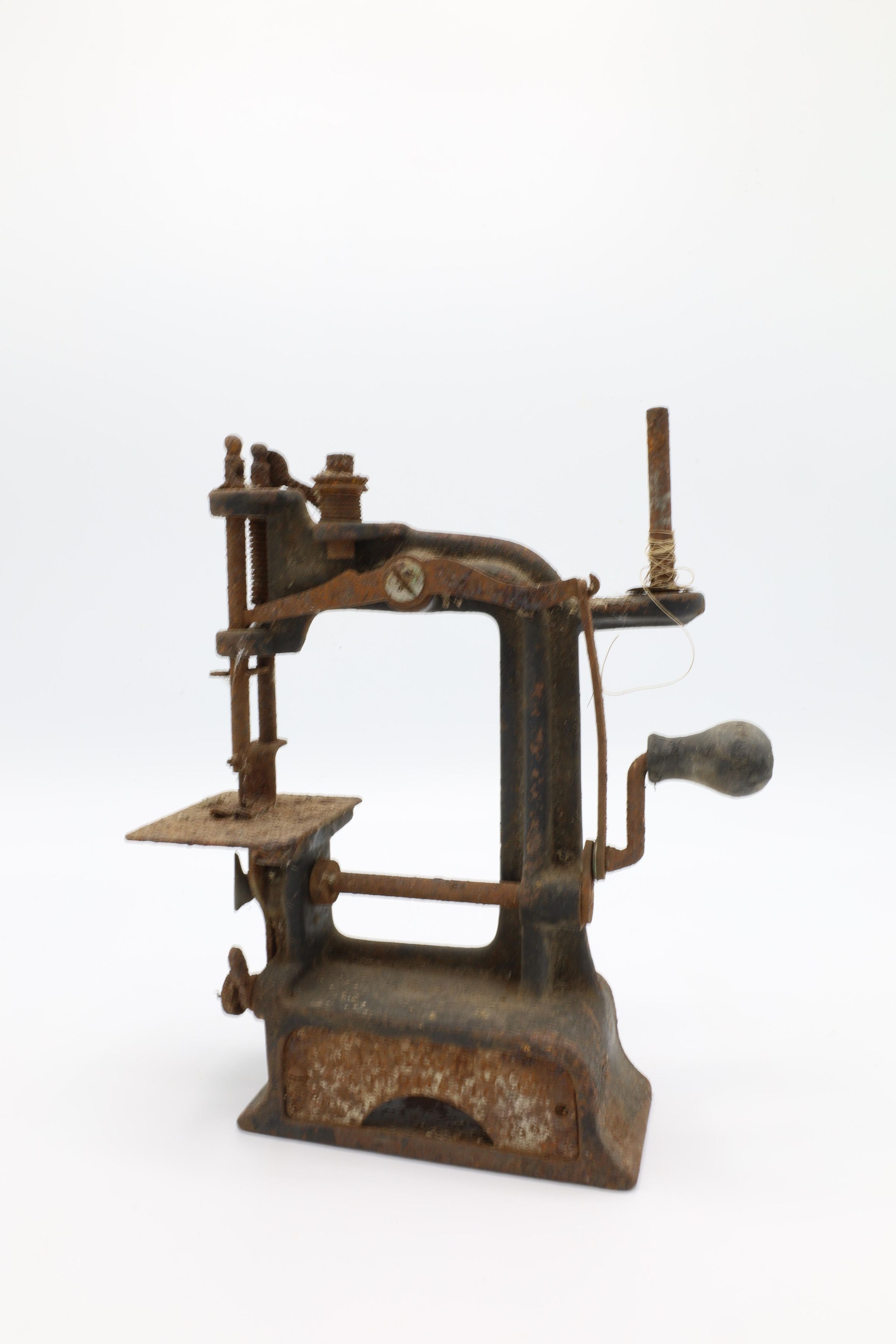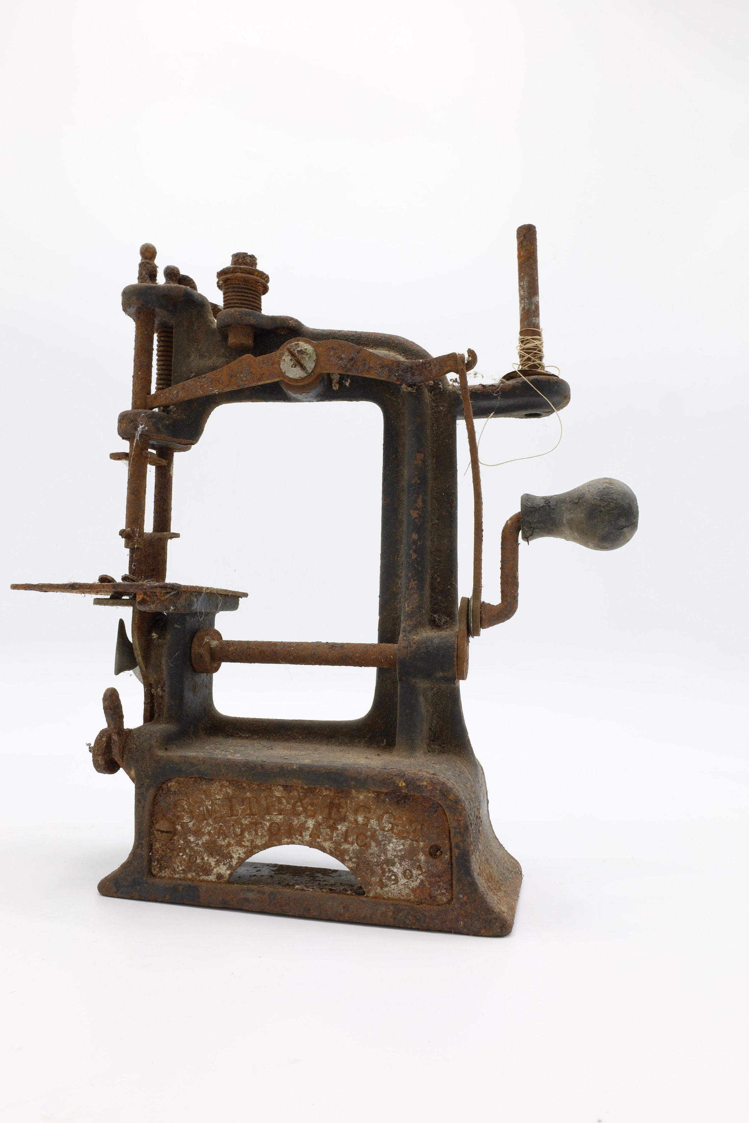 This is a Smith & Egge automatic sewing machine, 1901. This particular miniature sewing machine is heavily corroded.