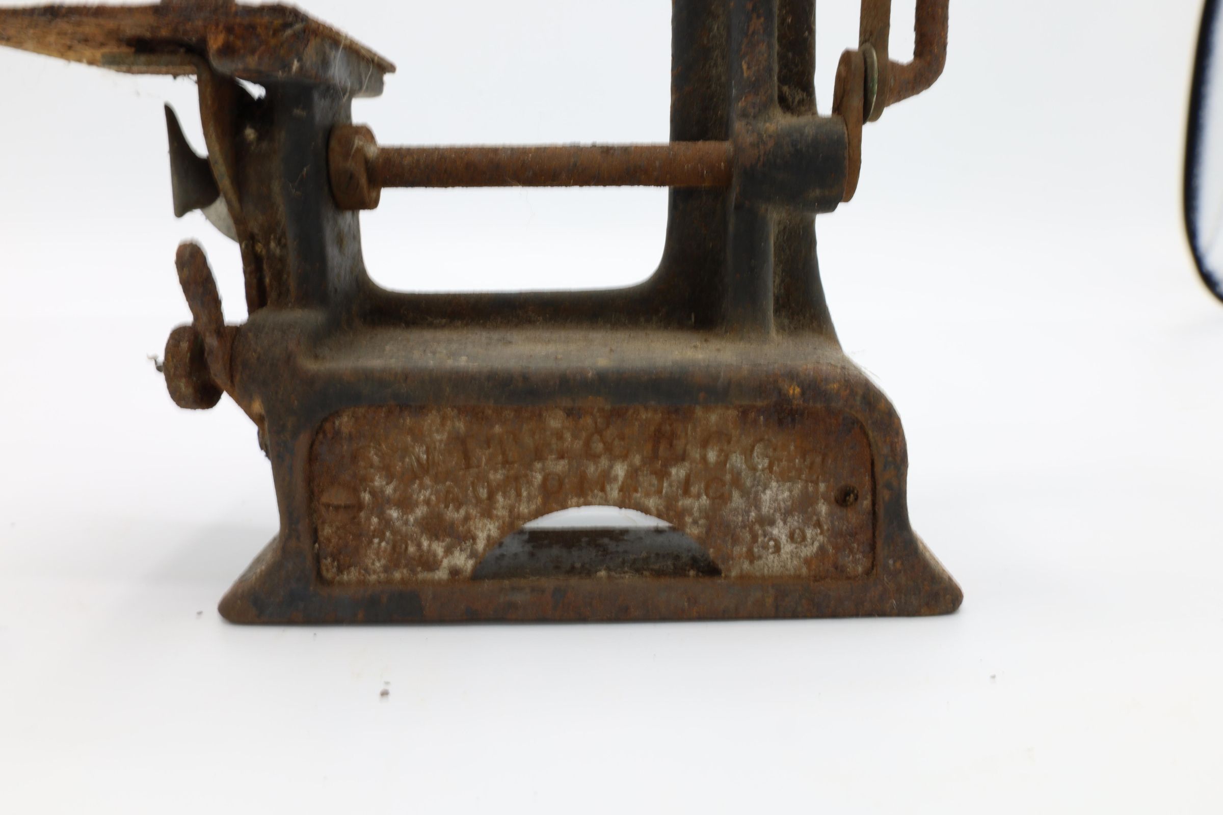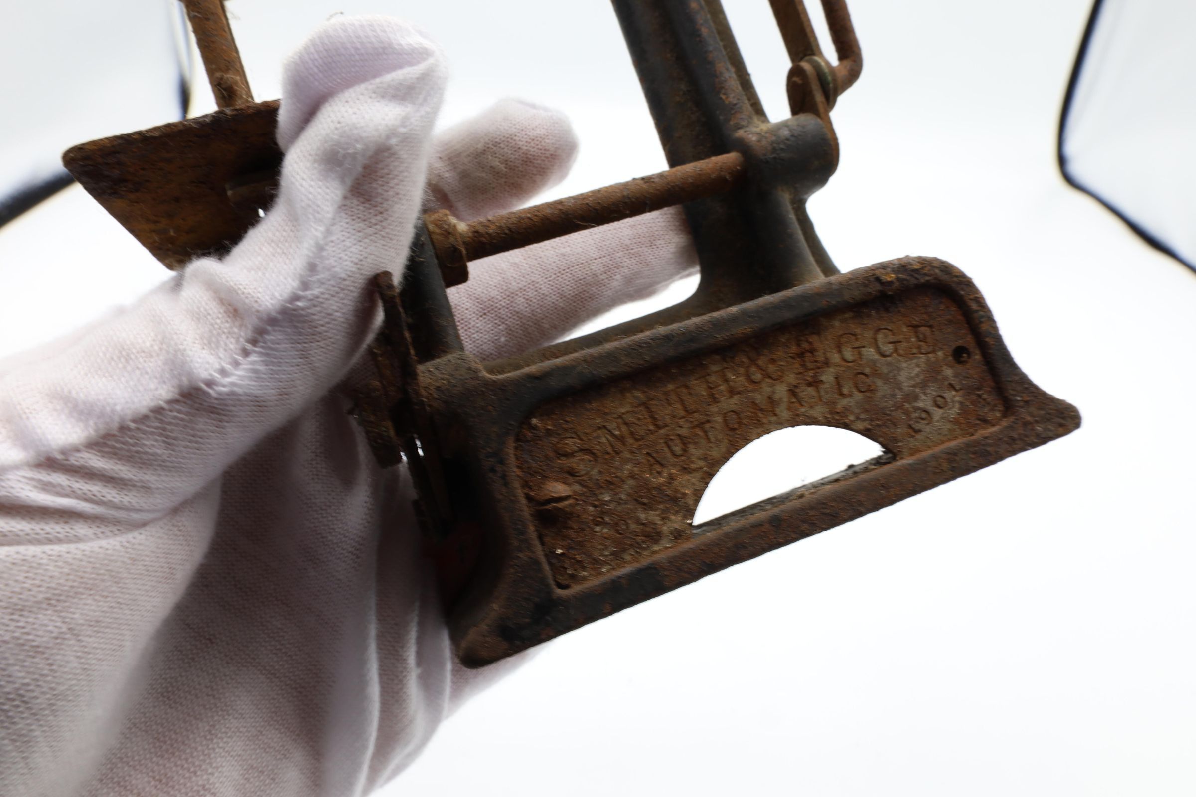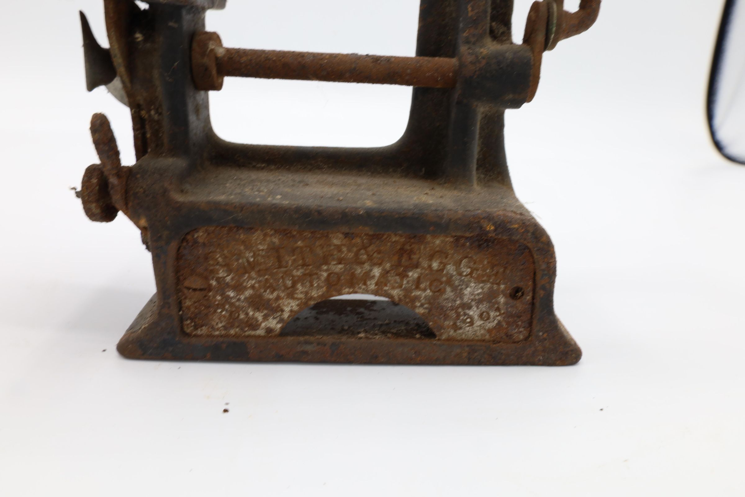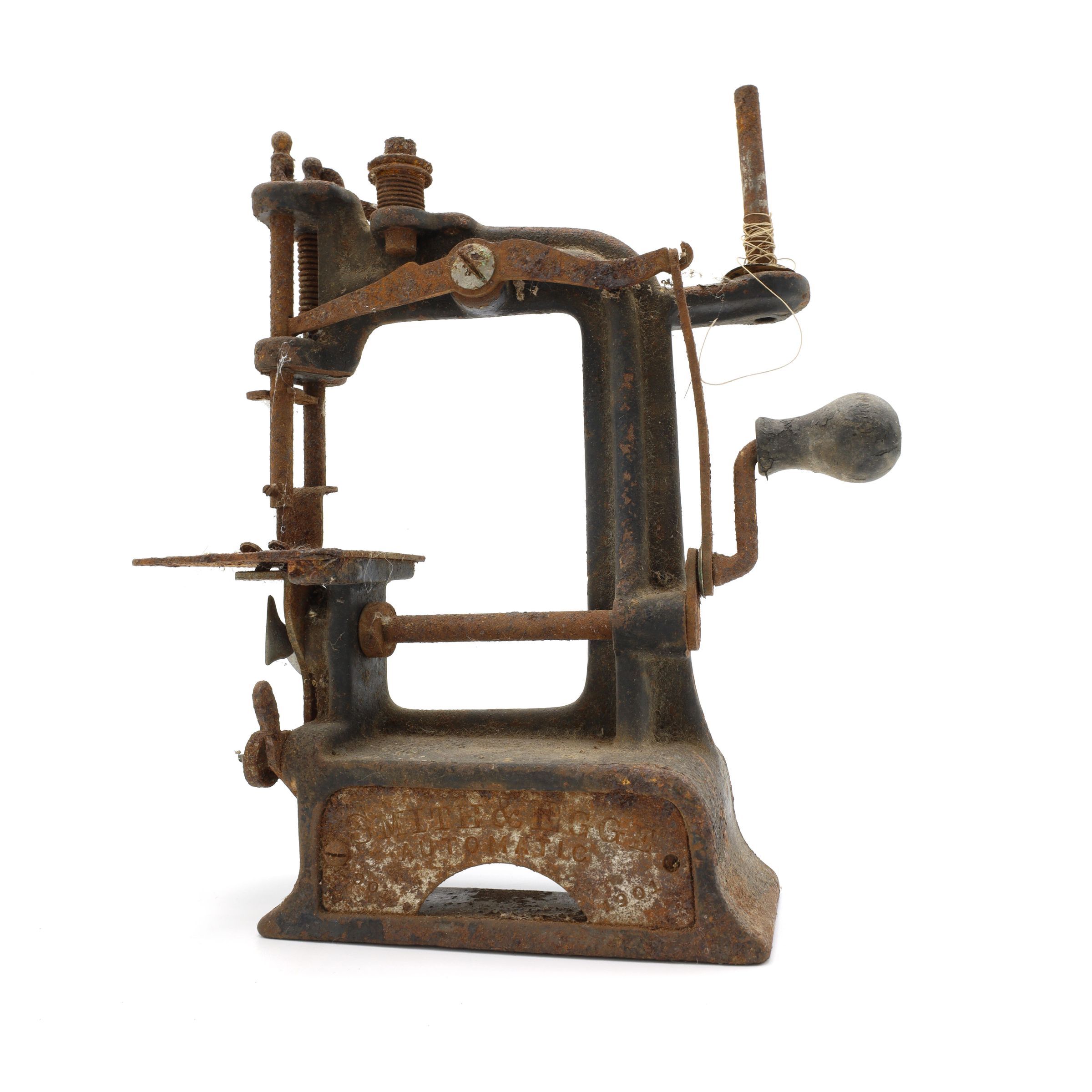 This is a Smith & Egge automatic sewing machine, 1901. This particular miniature sewing machine is heavily corroded.