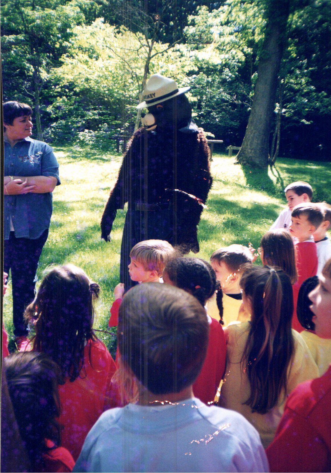 Dave May dresses up as Smokey The Bear for an educational program with children at Blue Rock State Park in May of 1999. Cathy May stands to the left of Smokey. The U.S. Forest Service envisioned Smokey The Bear as the mascot for their Cooperative Forest Fire Prevention Program in 1942. Artist Harry Rossoll developed the concept of Smokey The Bear that same year. In 1944, artist Albert Staehle completed the first poster depicting Smokey putting out a campfire.