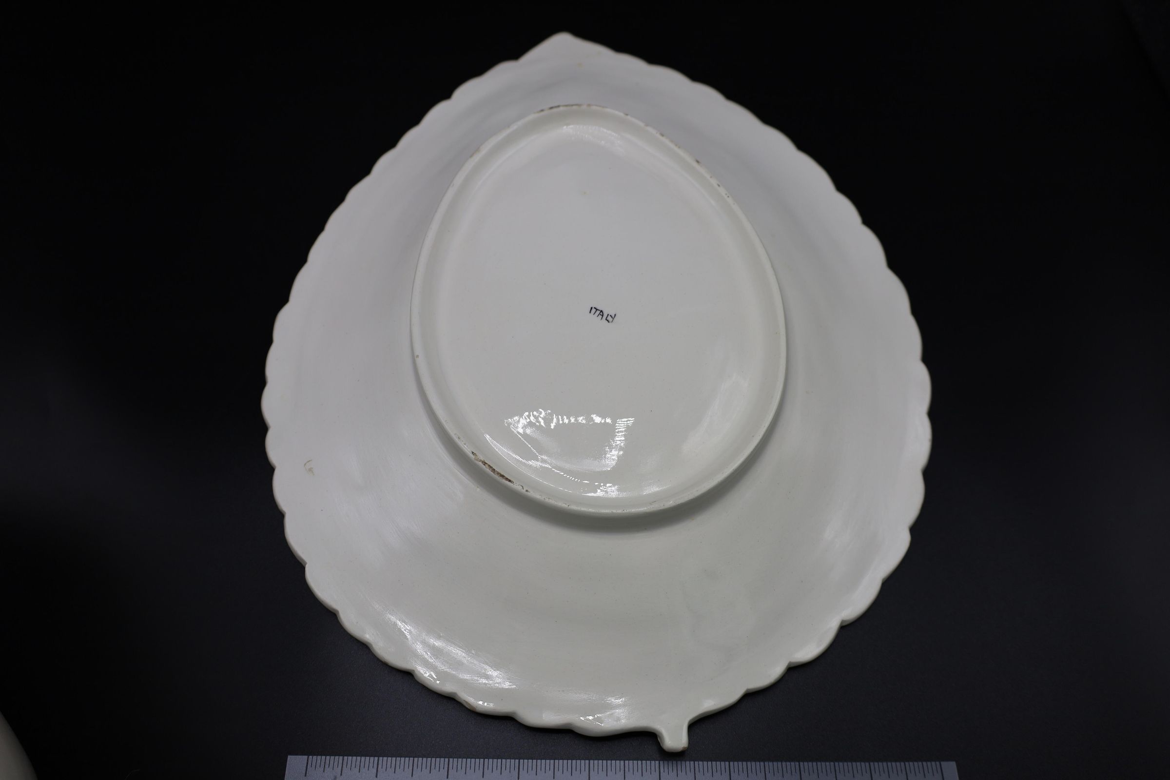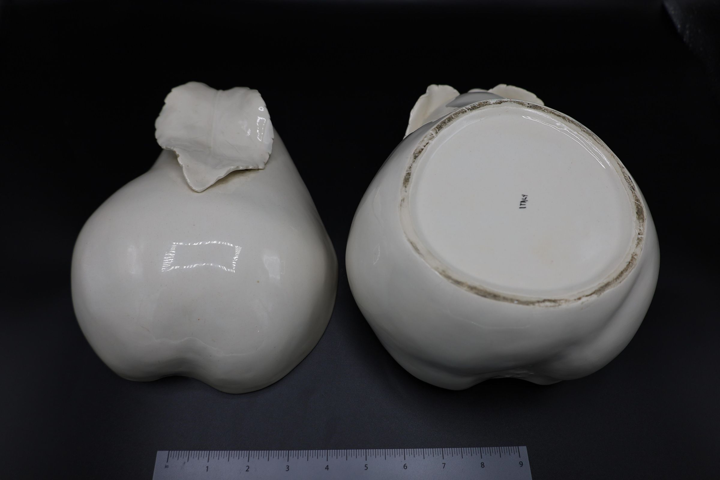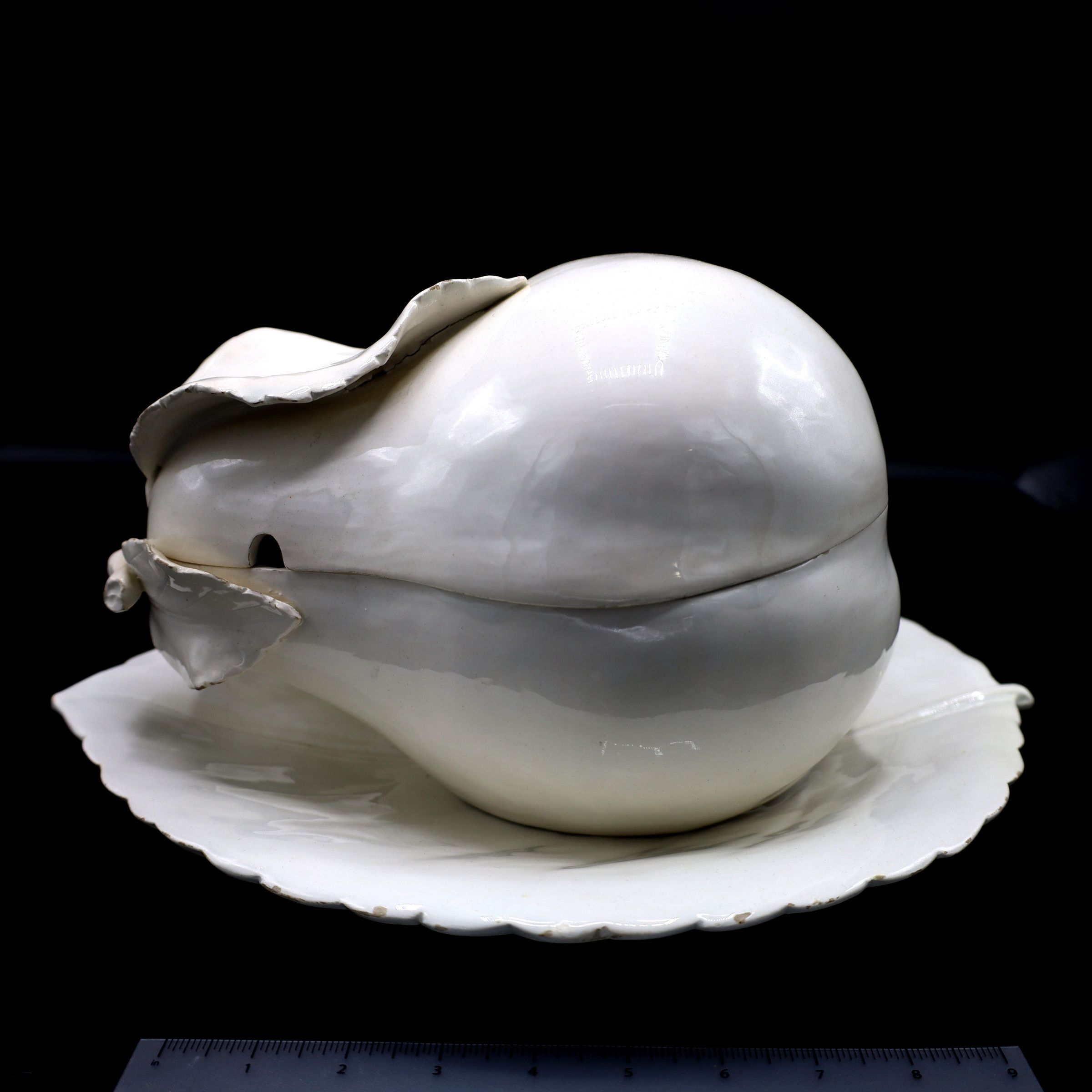 Made in Italy, this white, ceramic soup tureen is shaped like a pear and lays upon a broadleaf-shaped stand. There is a handwritten ITALY mark on the bottom of both the tureen and the stand.Location