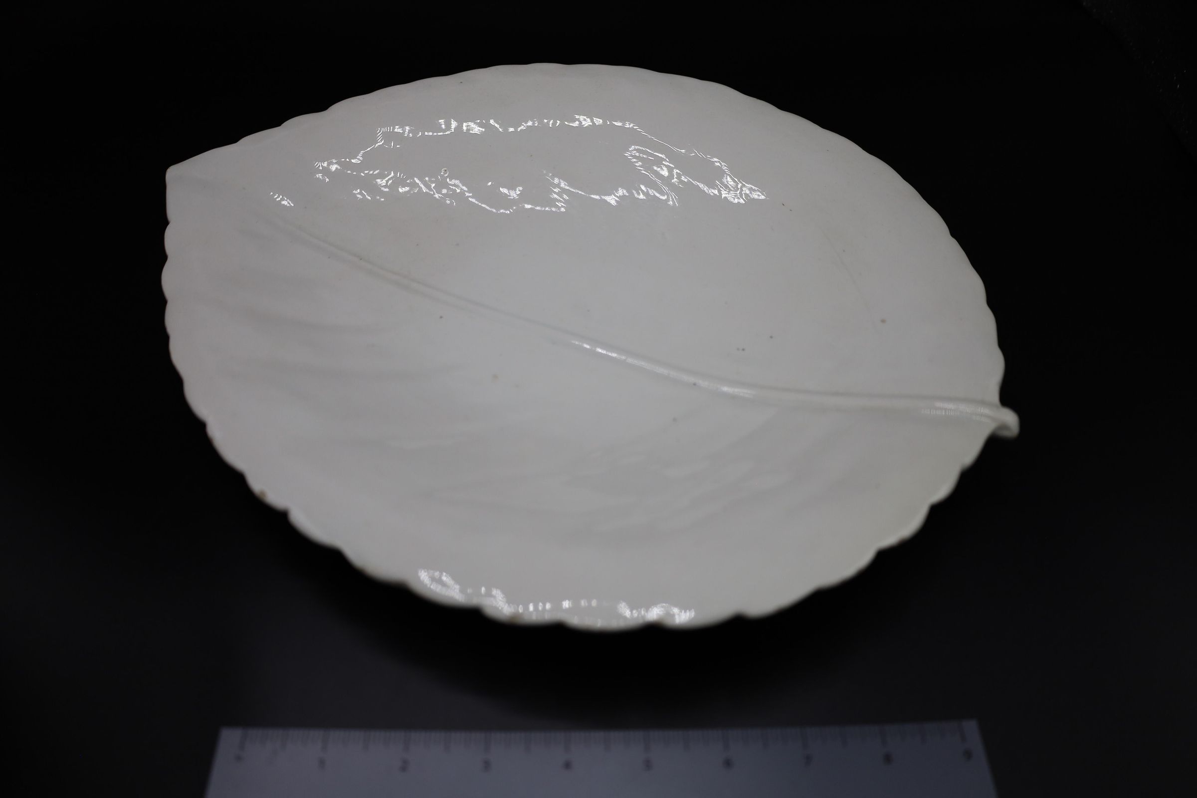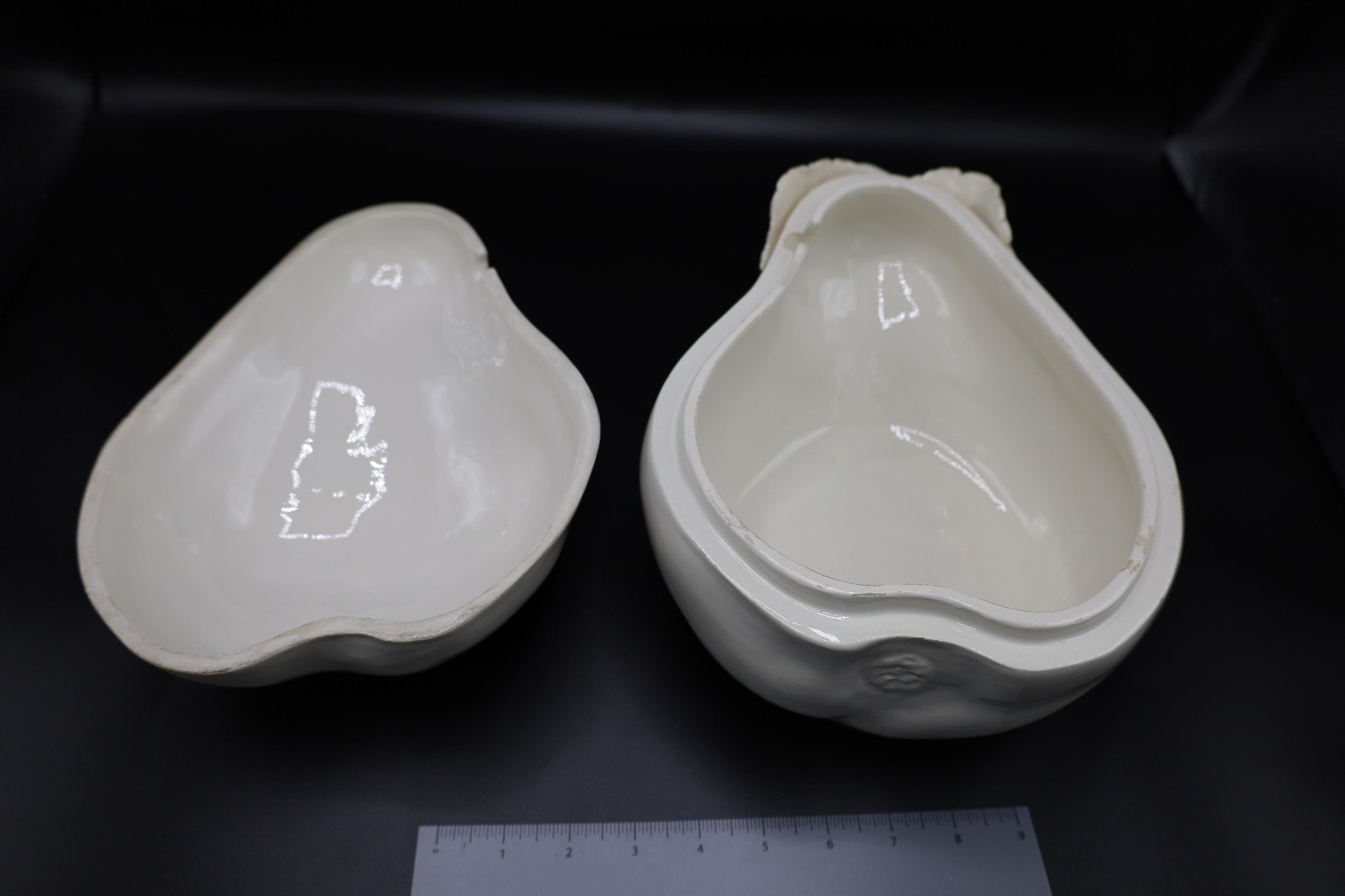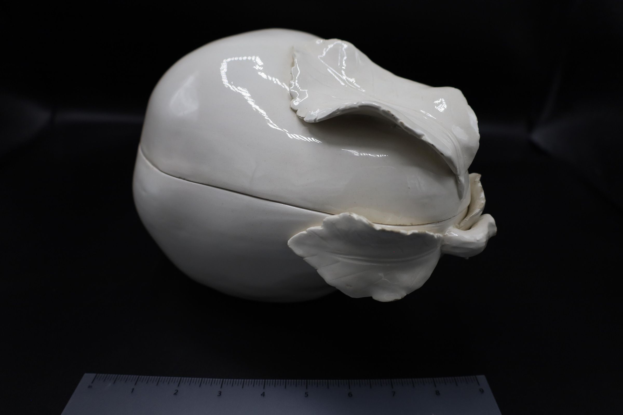 Made in Italy, this white, ceramic soup tureen is shaped like a pear and lays upon a broadleaf-shaped stand. There is a handwritten ITALY mark on the bottom of both the tureen and the stand.Location