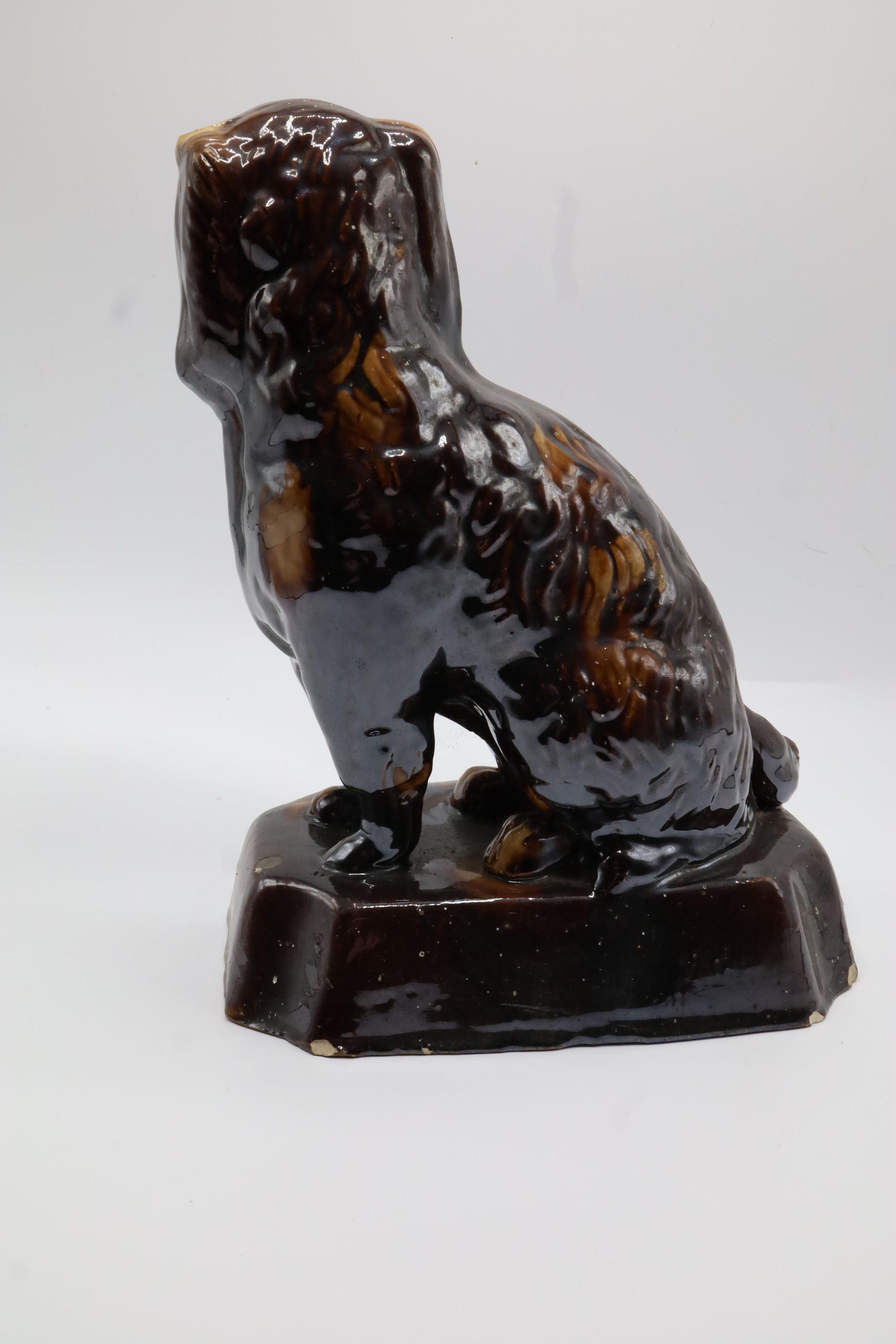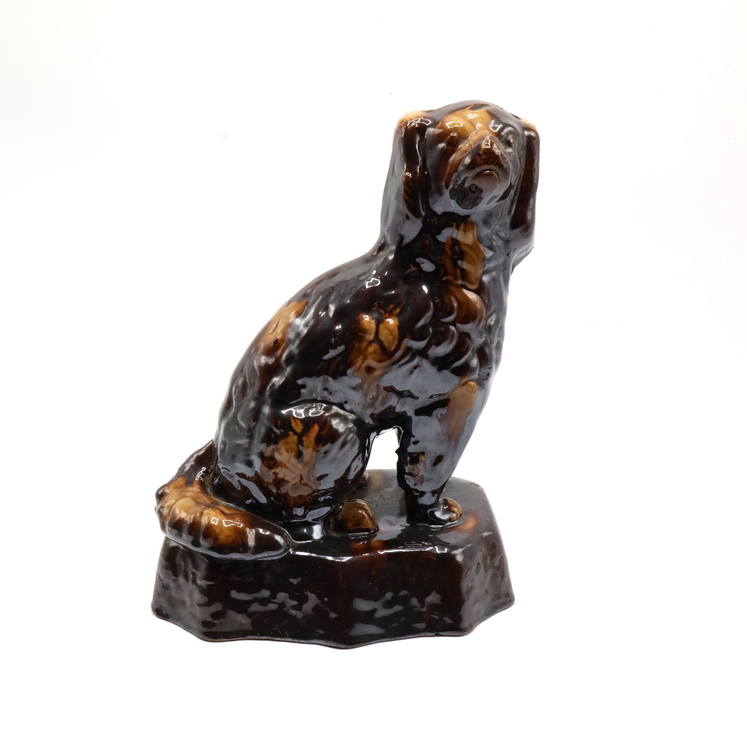 This seated spaniel dog figurine with Rockingham glaze showcases its fur and forelegs as it sits poised atop an ornamental mounted base.