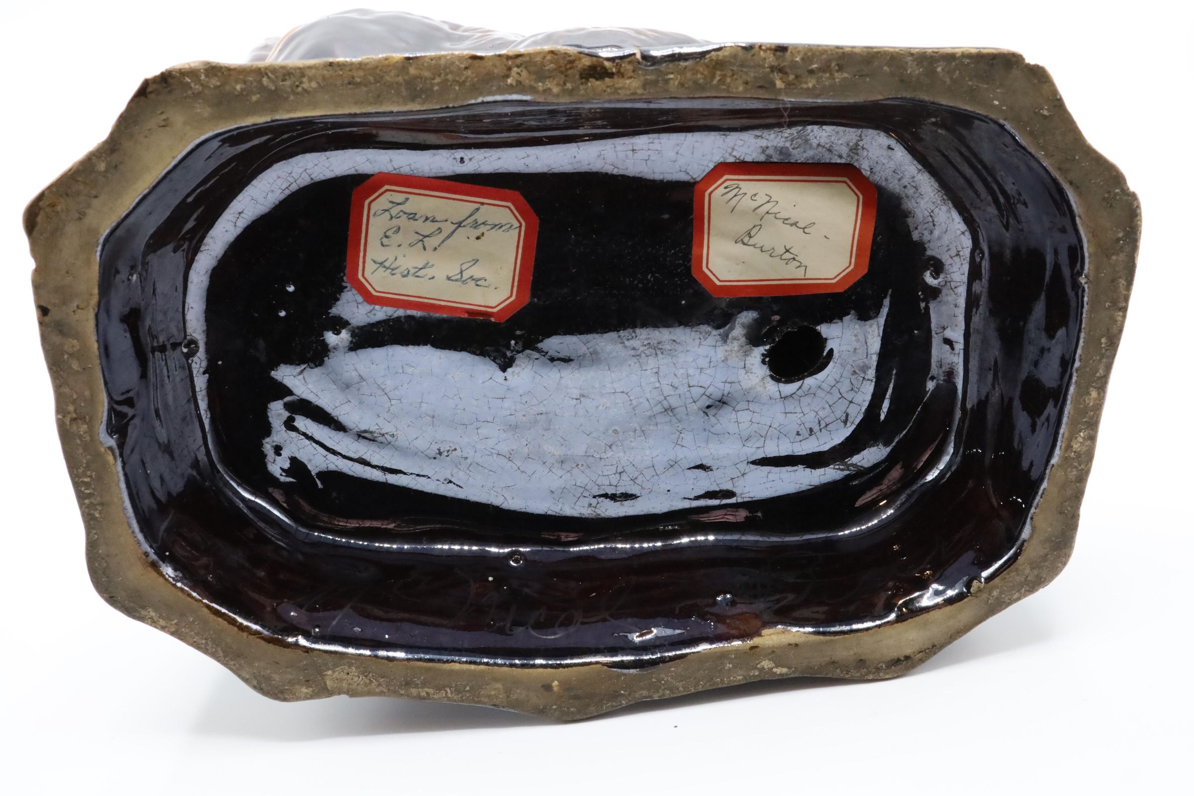 Rockingham was a popular style for ceramic manufacturers in East Liverpool, Ohio, in the mid-19th century. American Rockingham is yellowware covered with a dark-brown glaze and often mottled by spattering the glaze before it is fired. The name Rockingham was first applied to pottery made in England about 1796.Location
