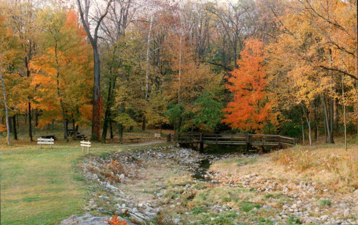 Mount Gilead Lake's spillway is dry as the autumn weather brings less rain. Trees in dazzling autumn color can be seen behind the footbridge over Sam's Creek.Cataloged By