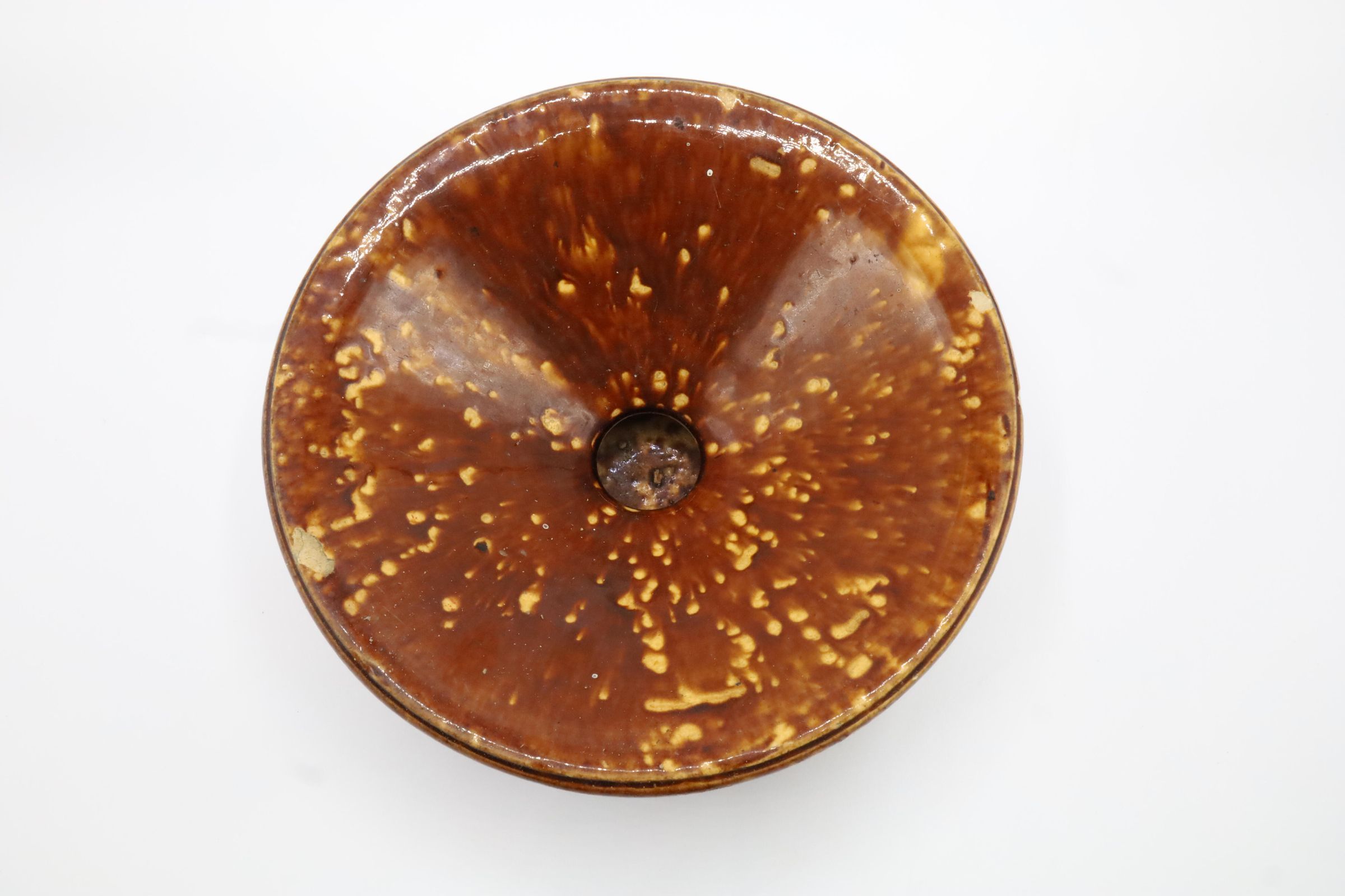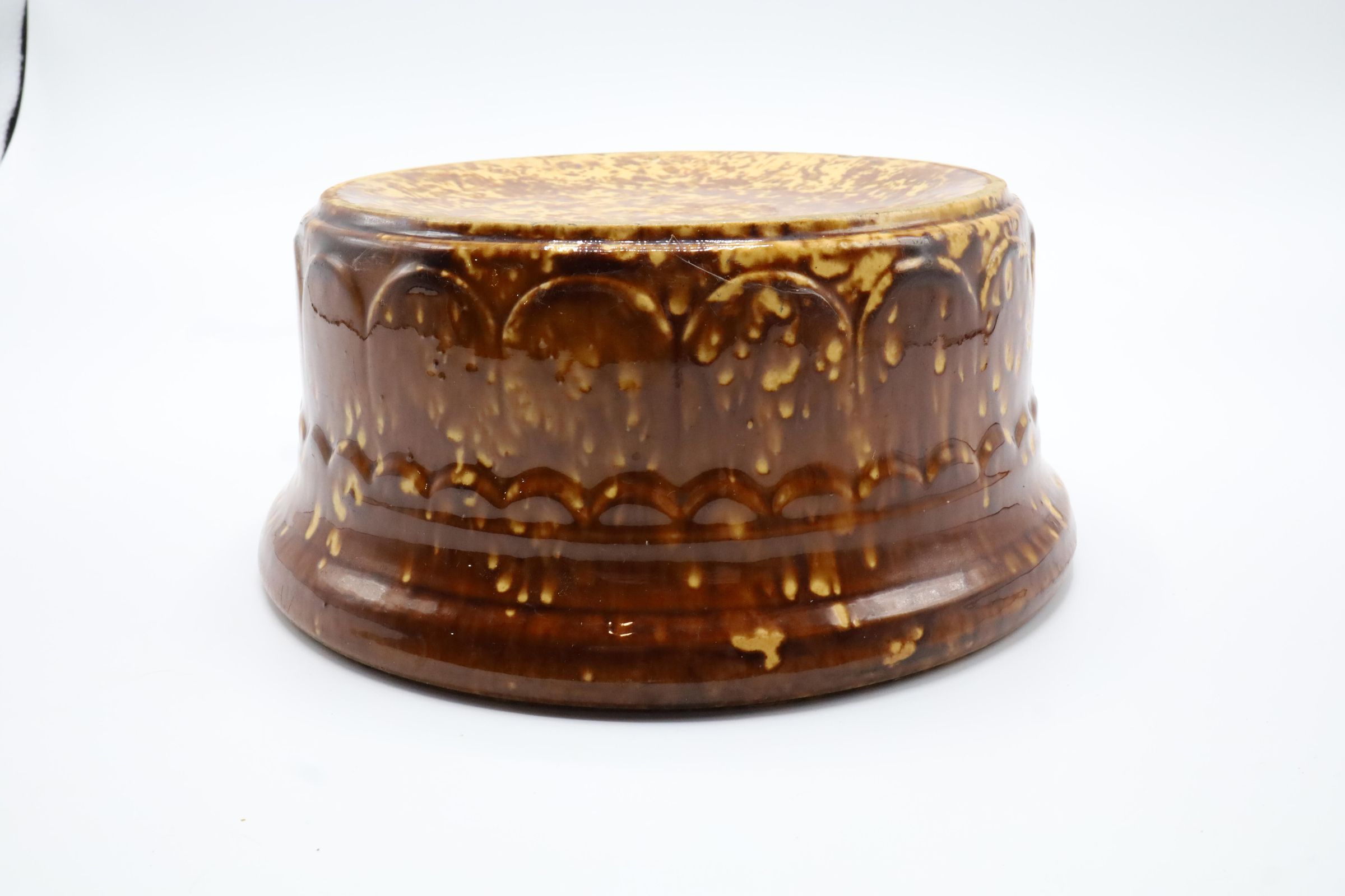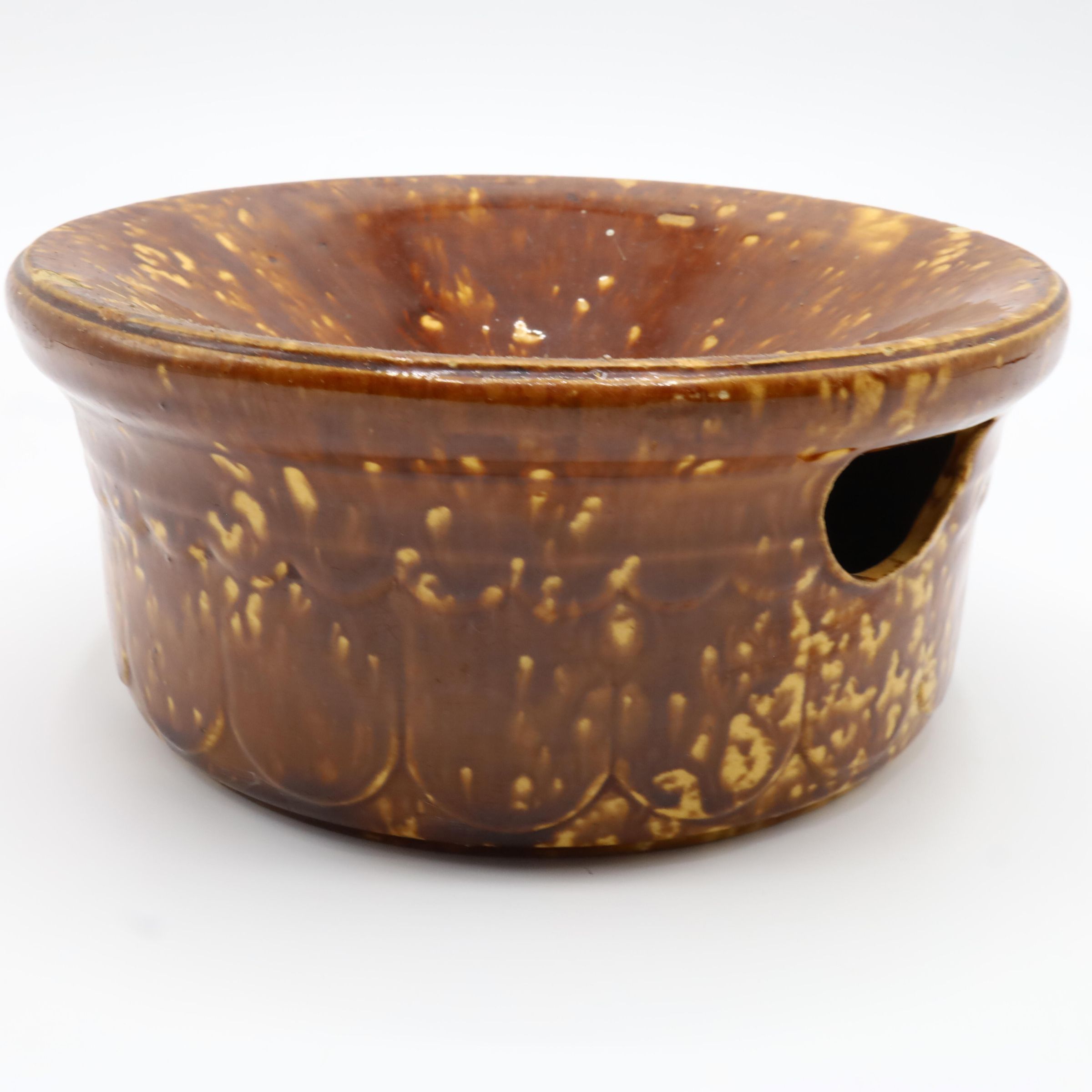 This Rockingham-glazed spittoon, or cuspidor, is a yellowware art pottery. It has a raised scalloped design on the body and a flared ribbed rim. The pattern has creamy highlights and a drainage hole on the pot's side.