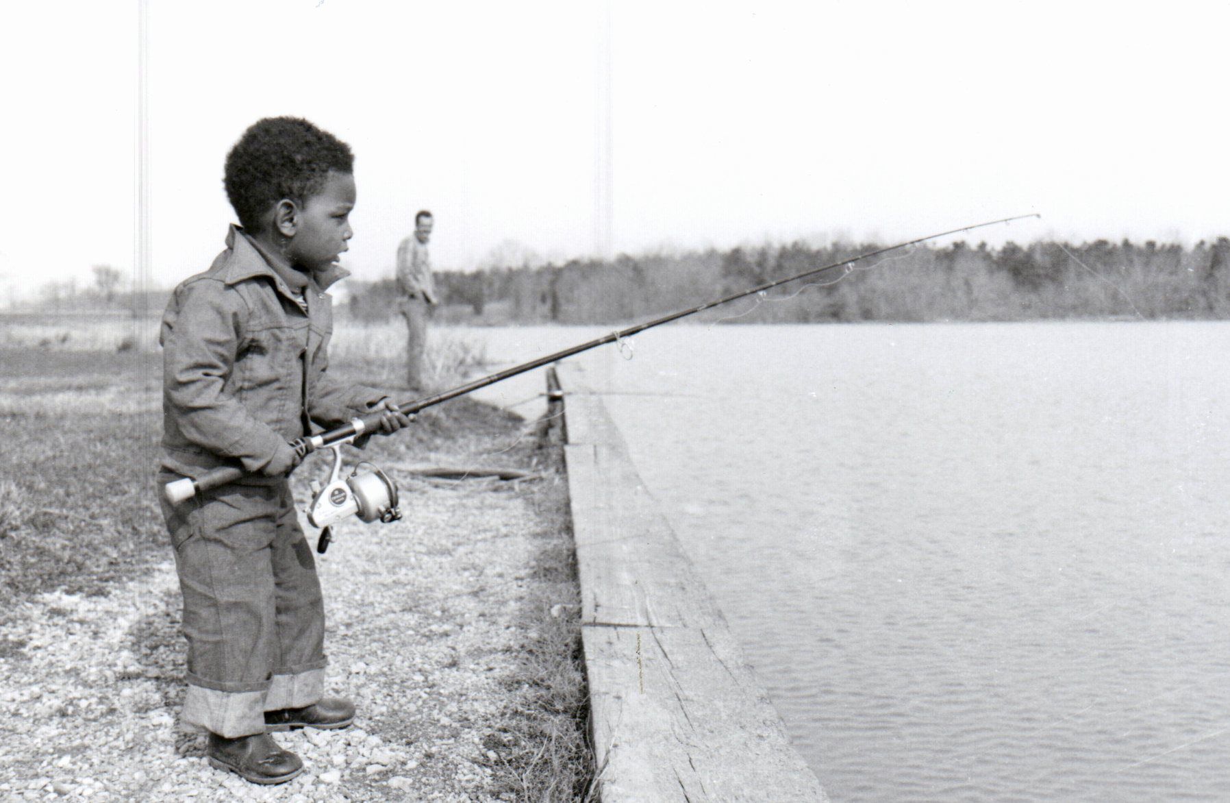 A young boy diligently tends to a fishing pole cast into William H. Harsha Lake while an adult in the background looks on approvingly.