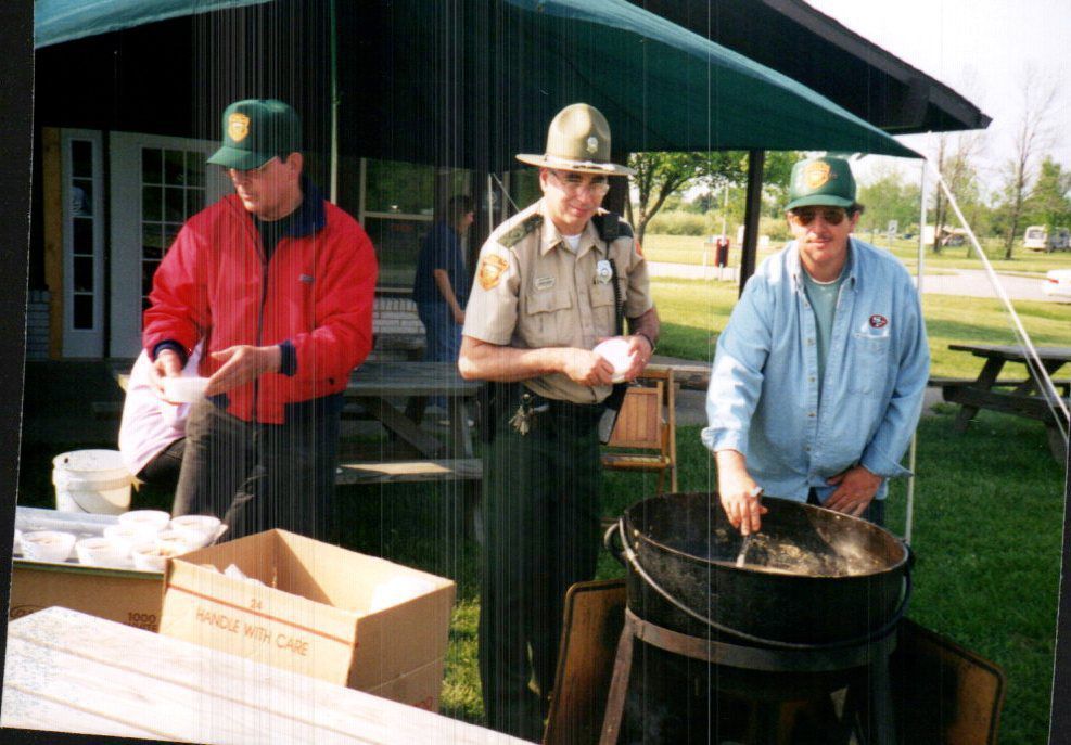 A member of Indian Lake's park staff stirs a pot of what appears to be soup. A hungry park ranger stands ready with a bowl in his hand. At the photograph's left, another park employee lines up bowls on a serving tray.Cataloged By